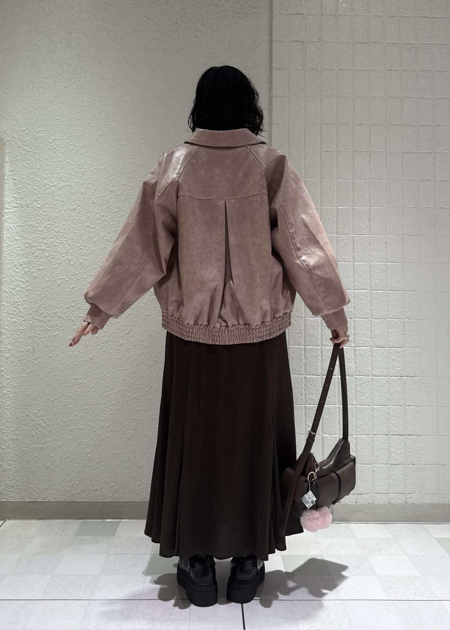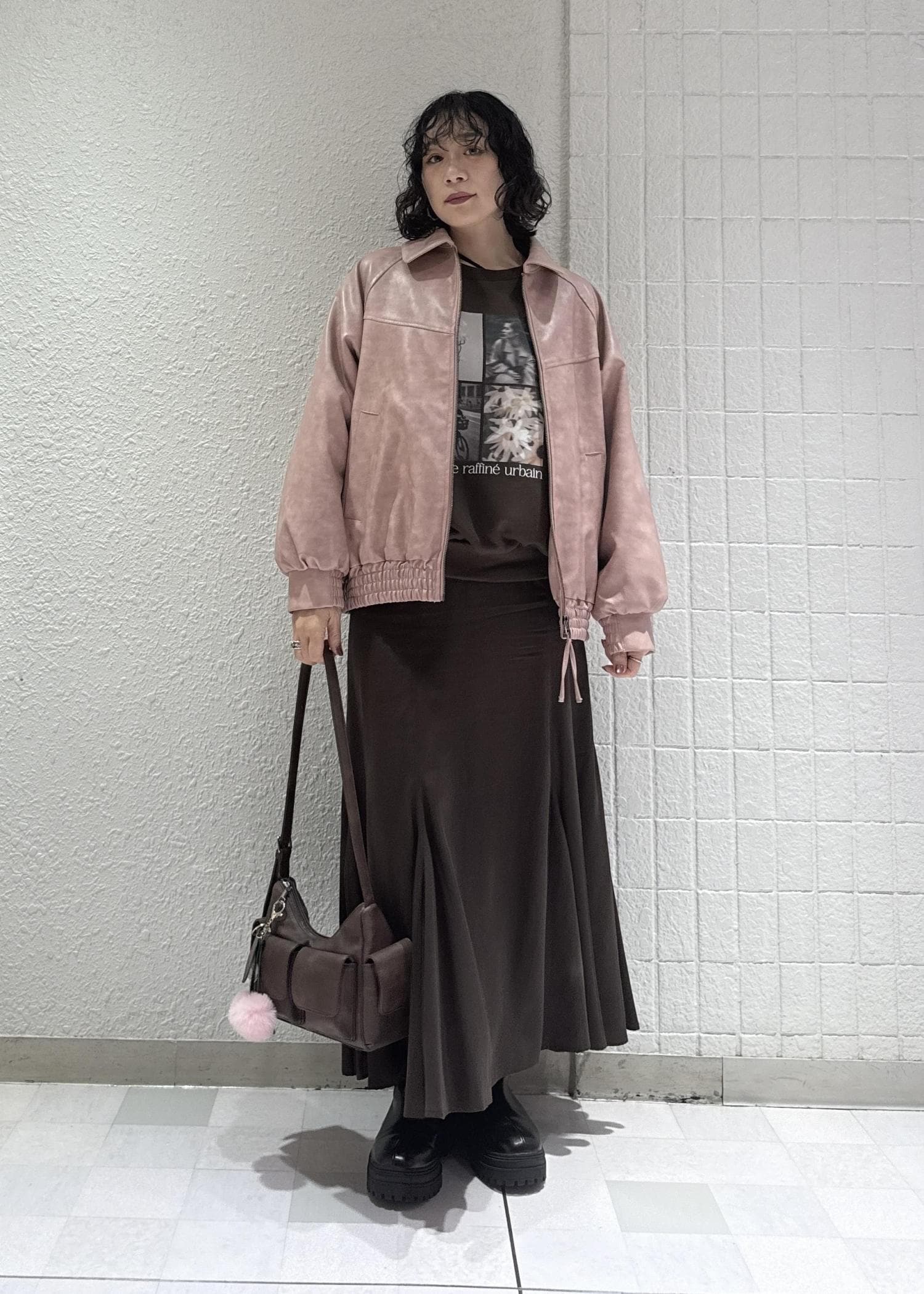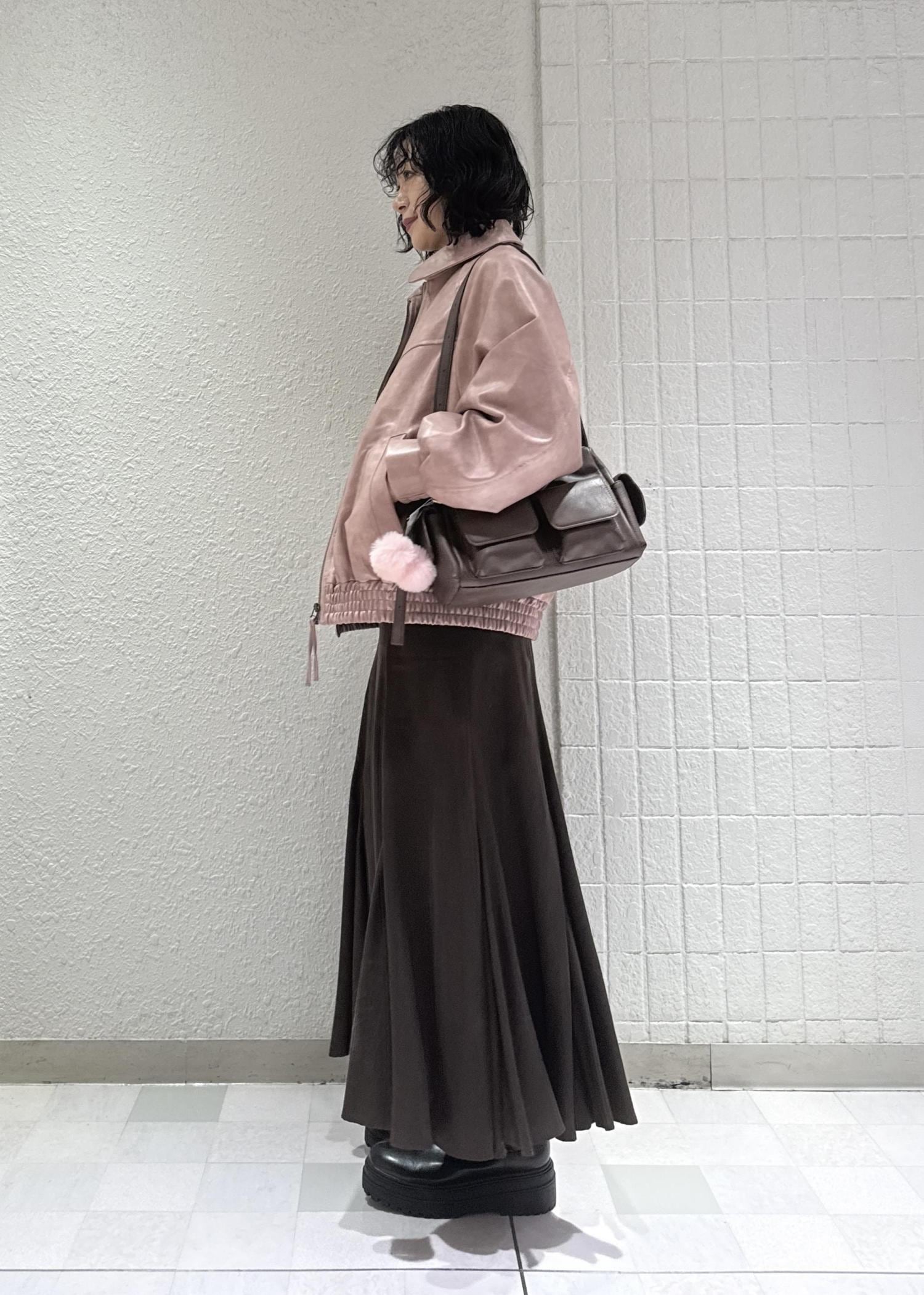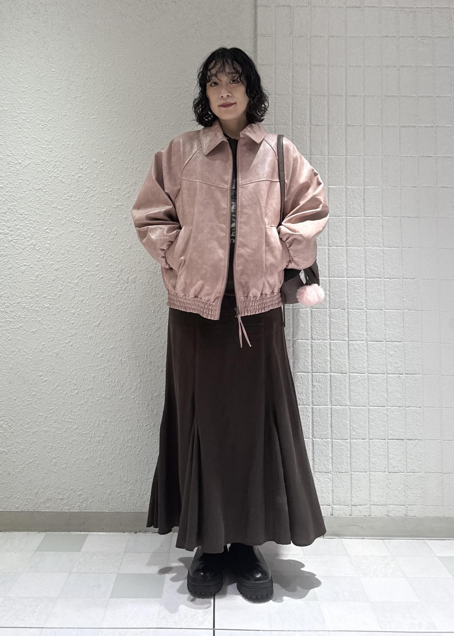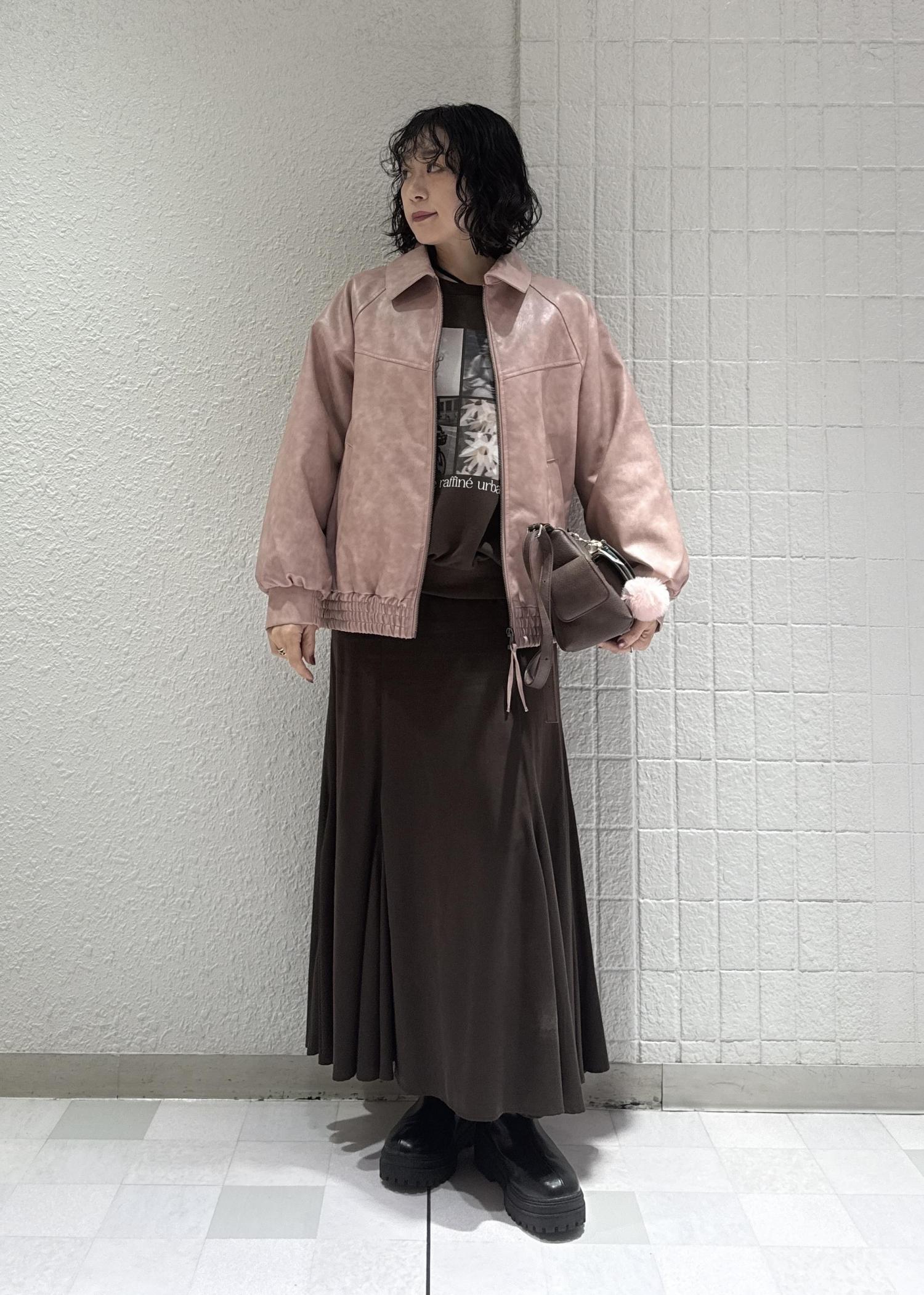 甘めなピンクのイメージもレザーブルゾンだと甘くなり過ぎない大人な印象に◎