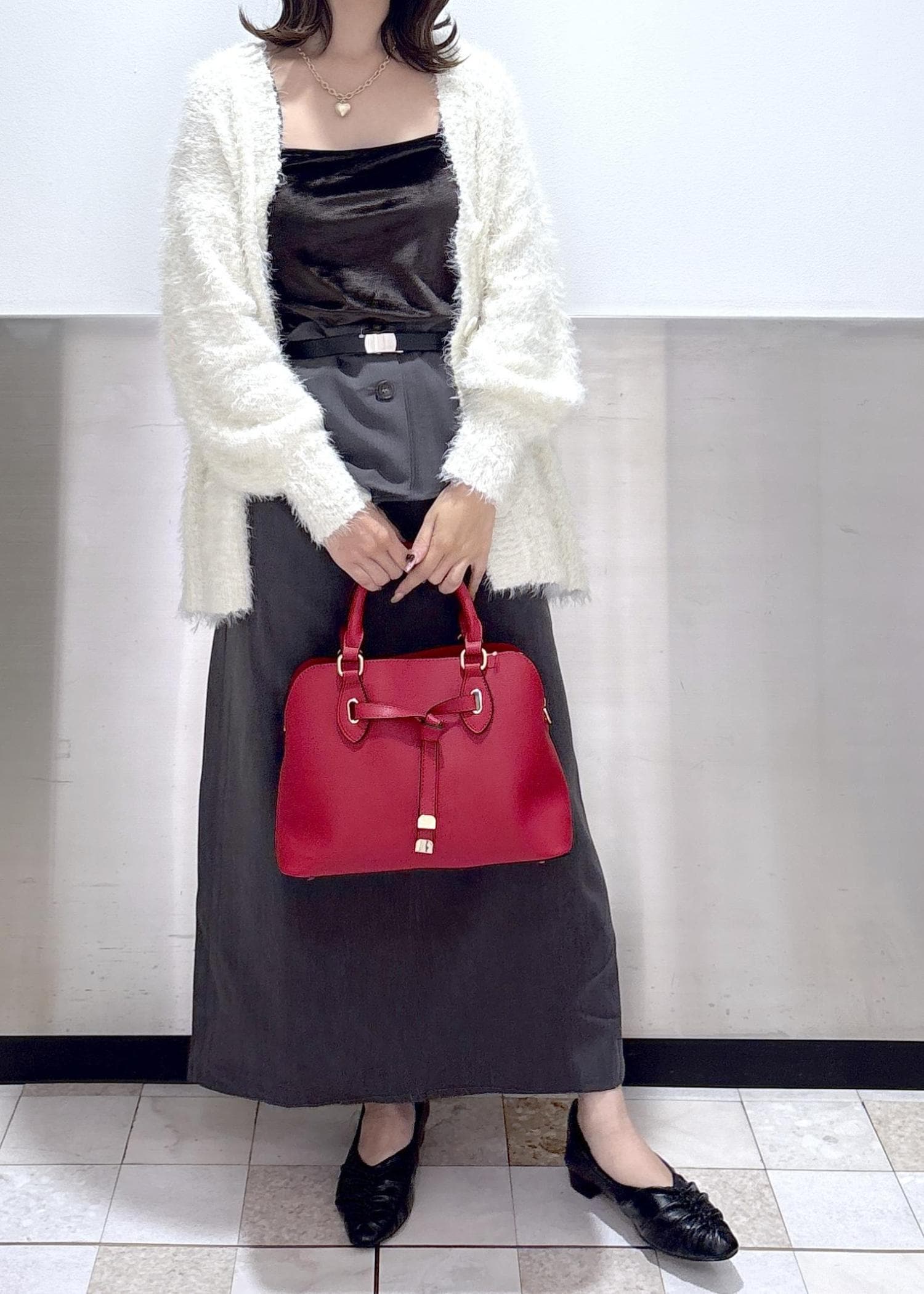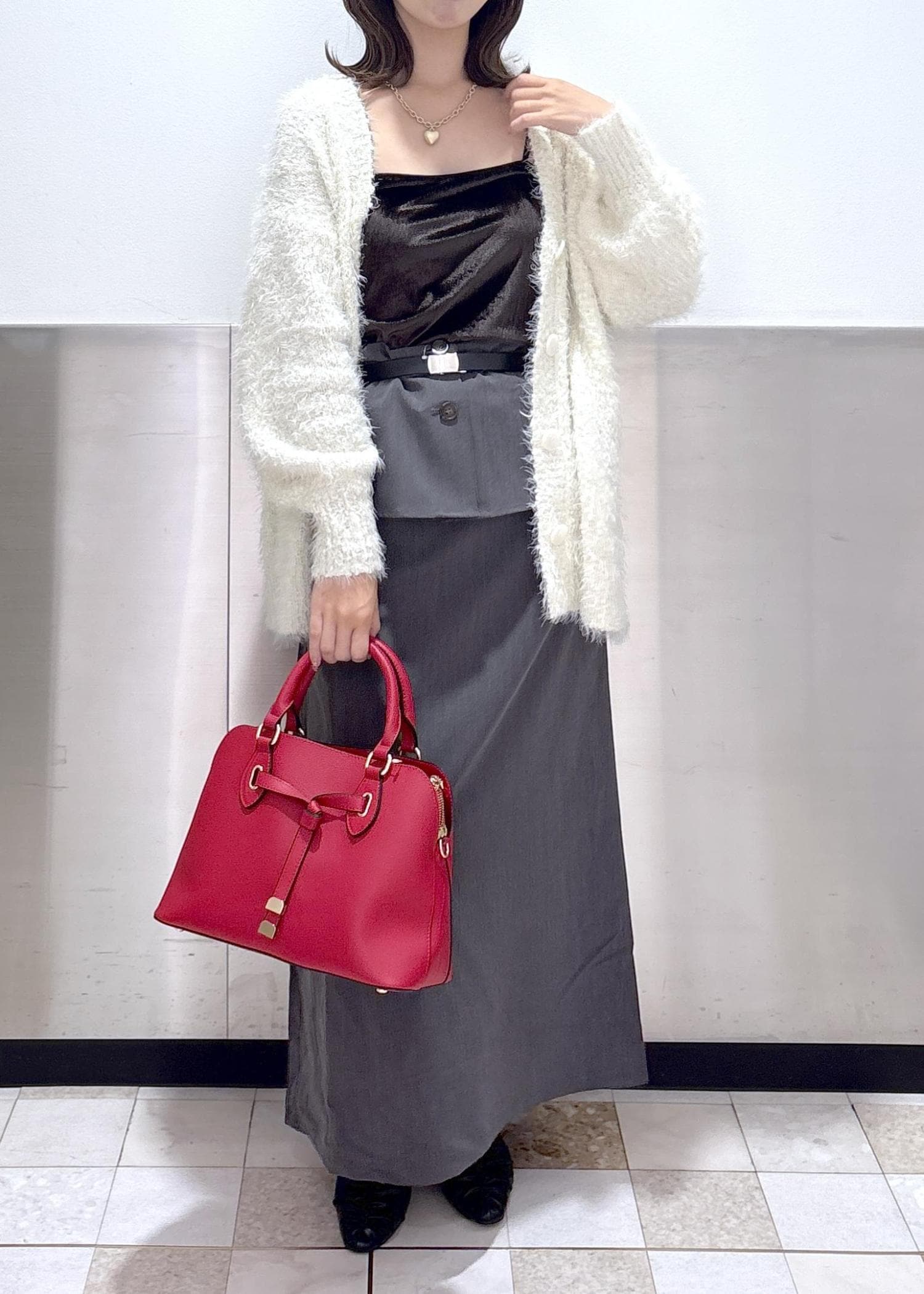 オーバーサイズのカーディガンは、インナーを首元が大きく開くキャミソール合わせにすると女性らしさが引き立つのでおすすめの組み合わせ!ベロアのカップ付きキャミなら着心地も楽なのでちゃんと女の子らしくてかわいいのにリラックスした着用感です◎