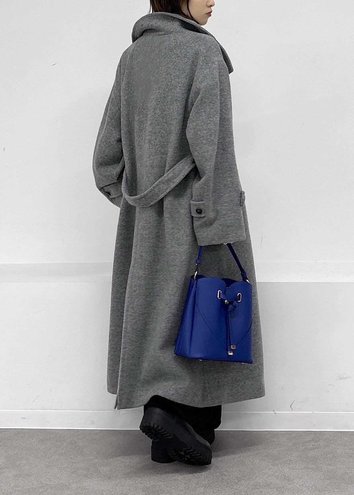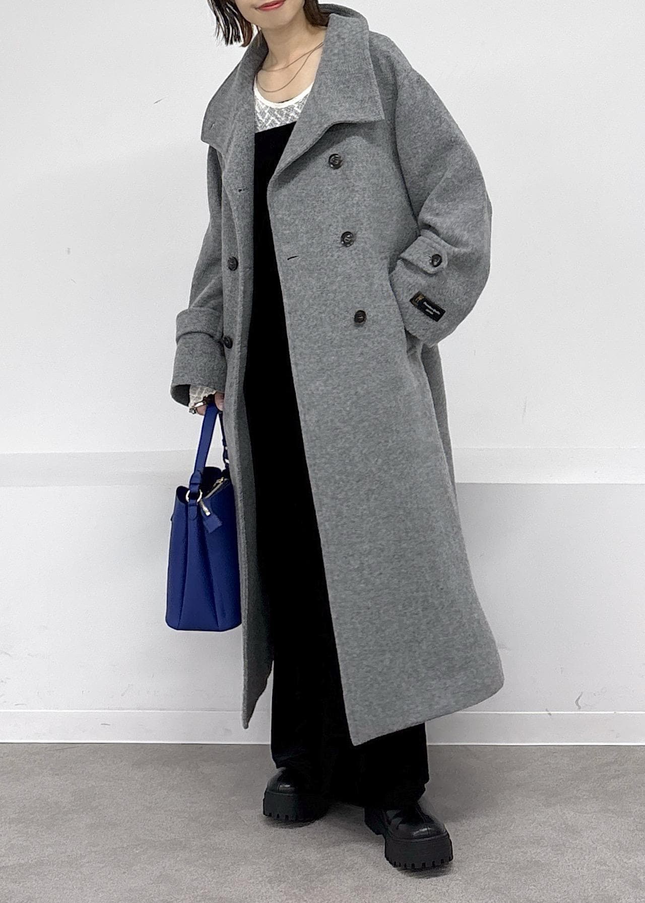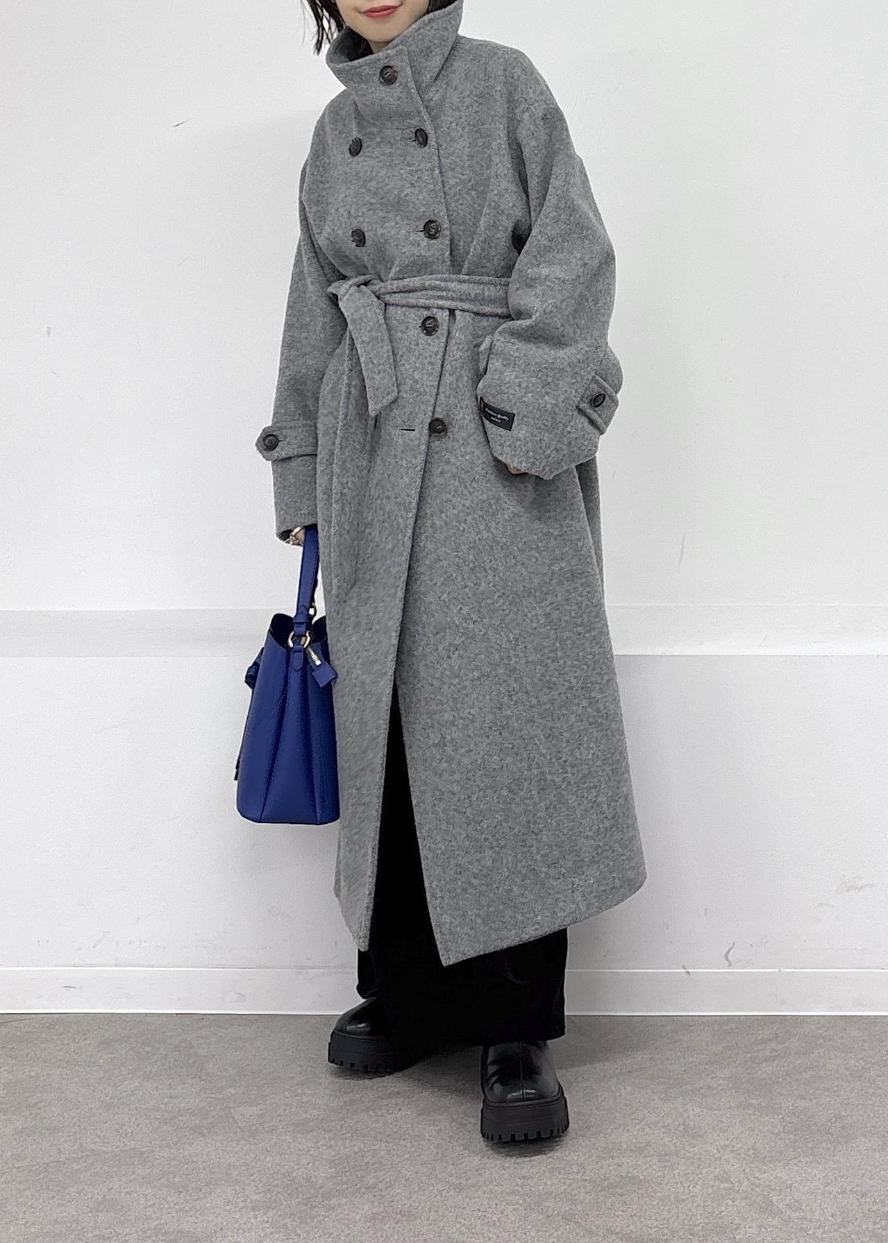 毎シーズン大人気の尾州ウールコート♪暖かいのに軽くて着やすく、今季はスタンドになる襟元と開けたときの見え方の変化が楽しめるデザインで冬の主役級アイテムです。ベロアのキャミワンピ、ハートバックはブルーをポイントにまとめました◎冬のお出かけにぴったりな大人カジュアルコーデ。