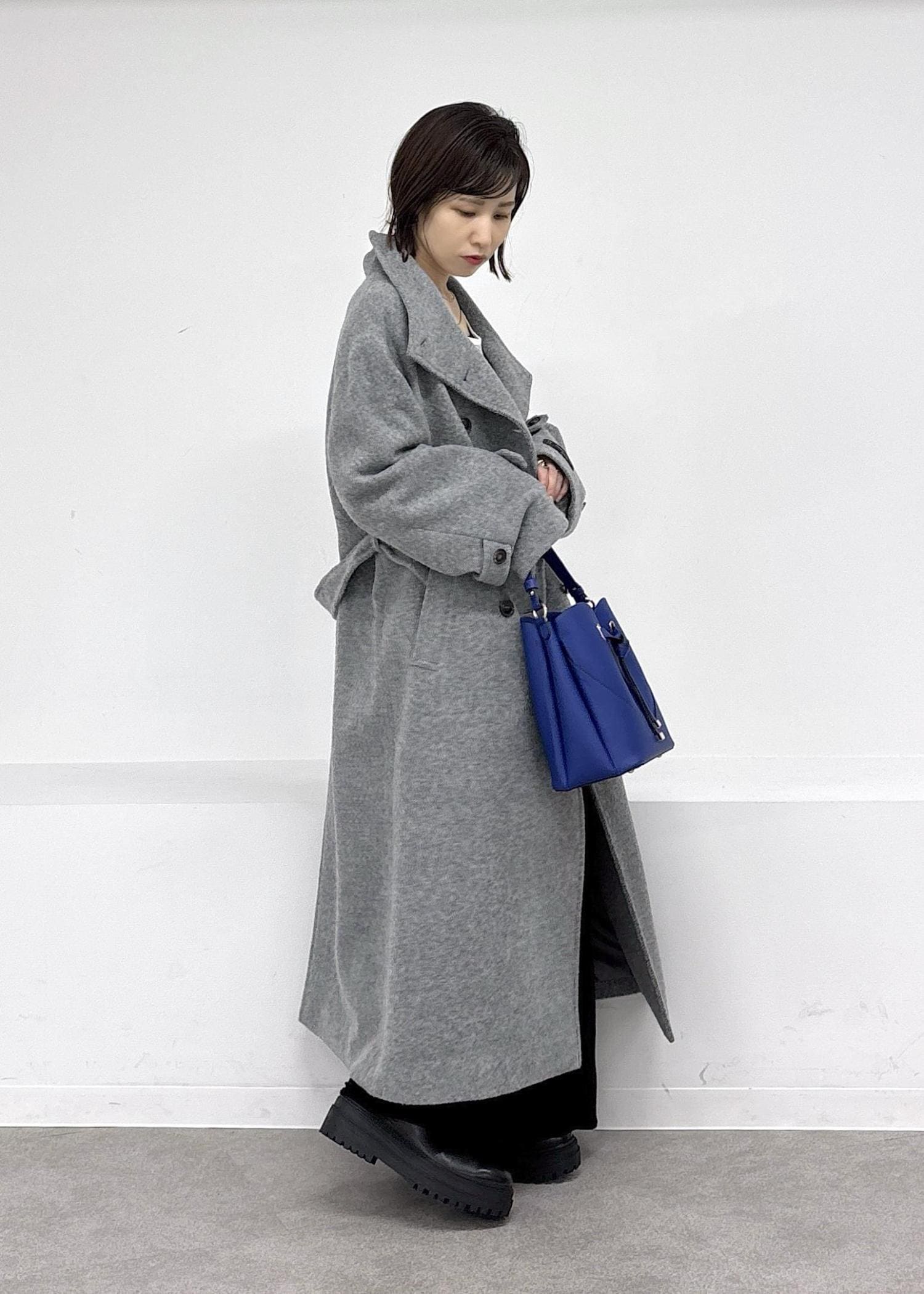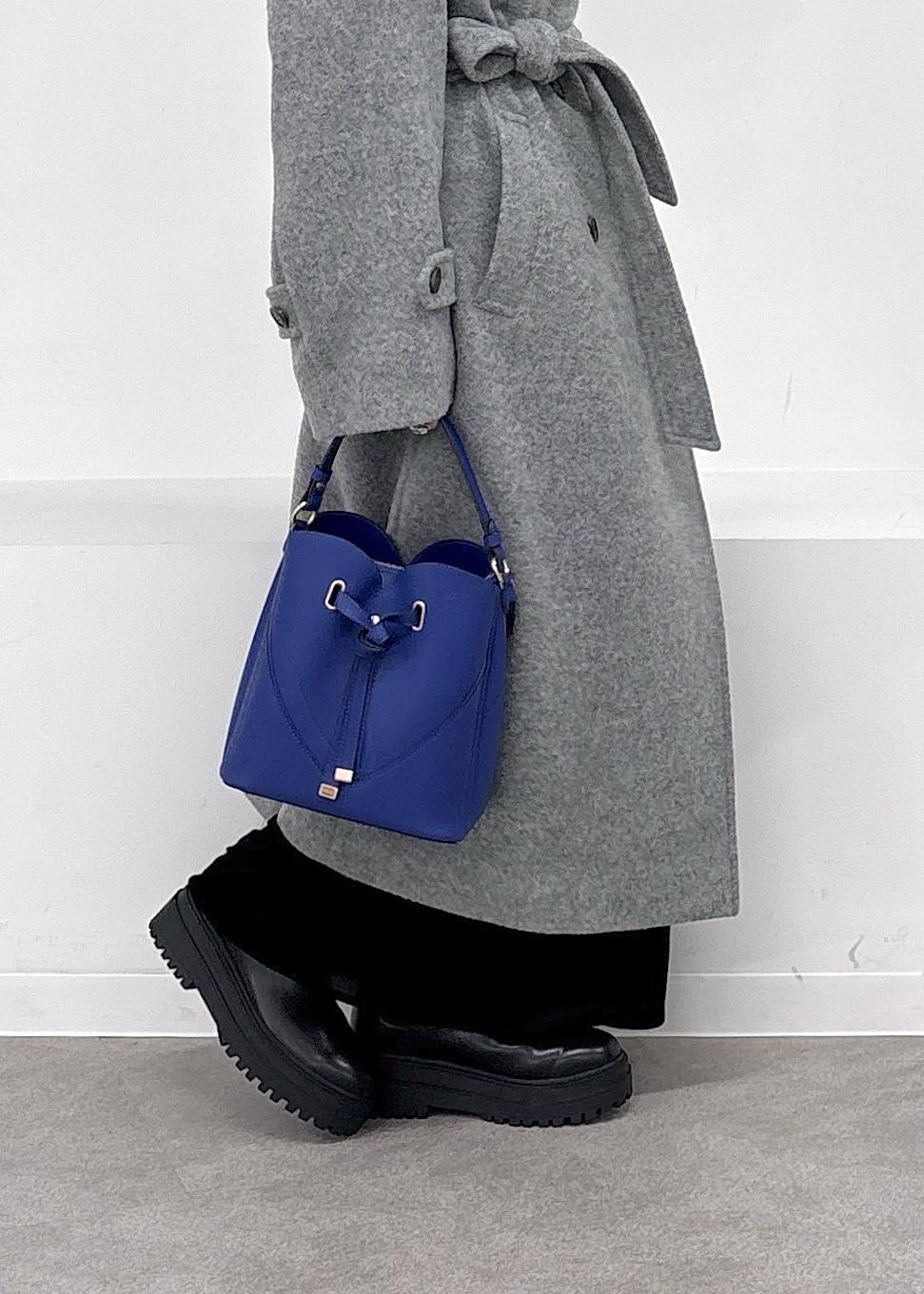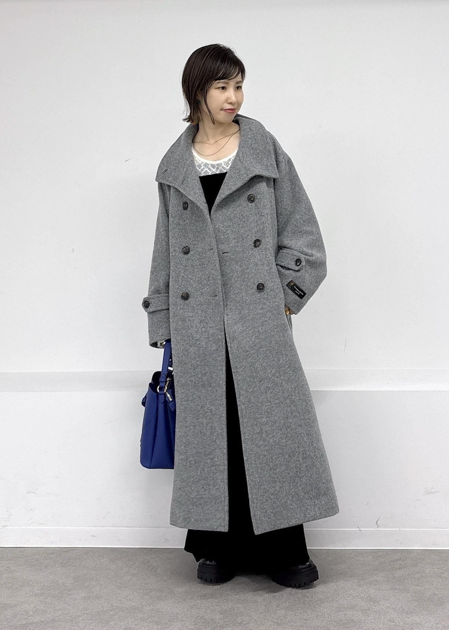 毎シーズン大人気の尾州ウールコート♪暖かいのに軽くて着やすく、今季はスタンドになる襟元と開けたときの見え方の変化が楽しめるデザインで冬の主役級アイテムです。ベロアのキャミワンピ、ハートバックはブルーをポイントにまとめました◎冬のお出かけにぴったりな大人カジュアルコーデ。