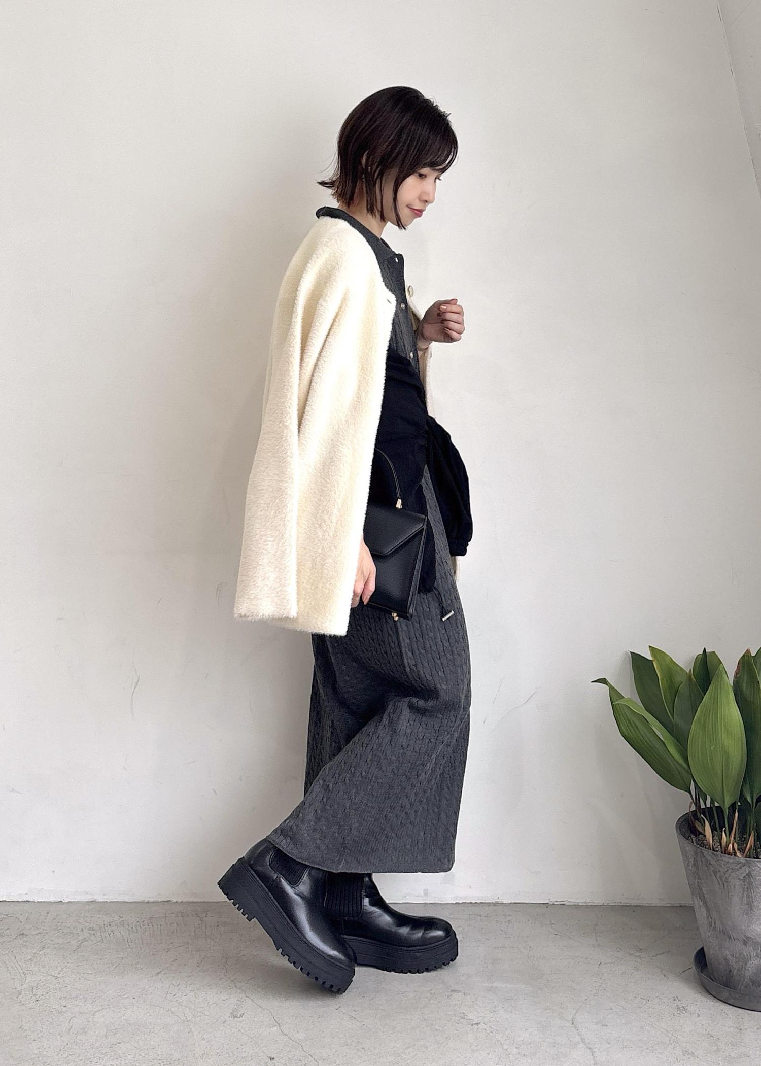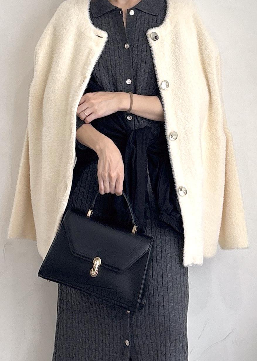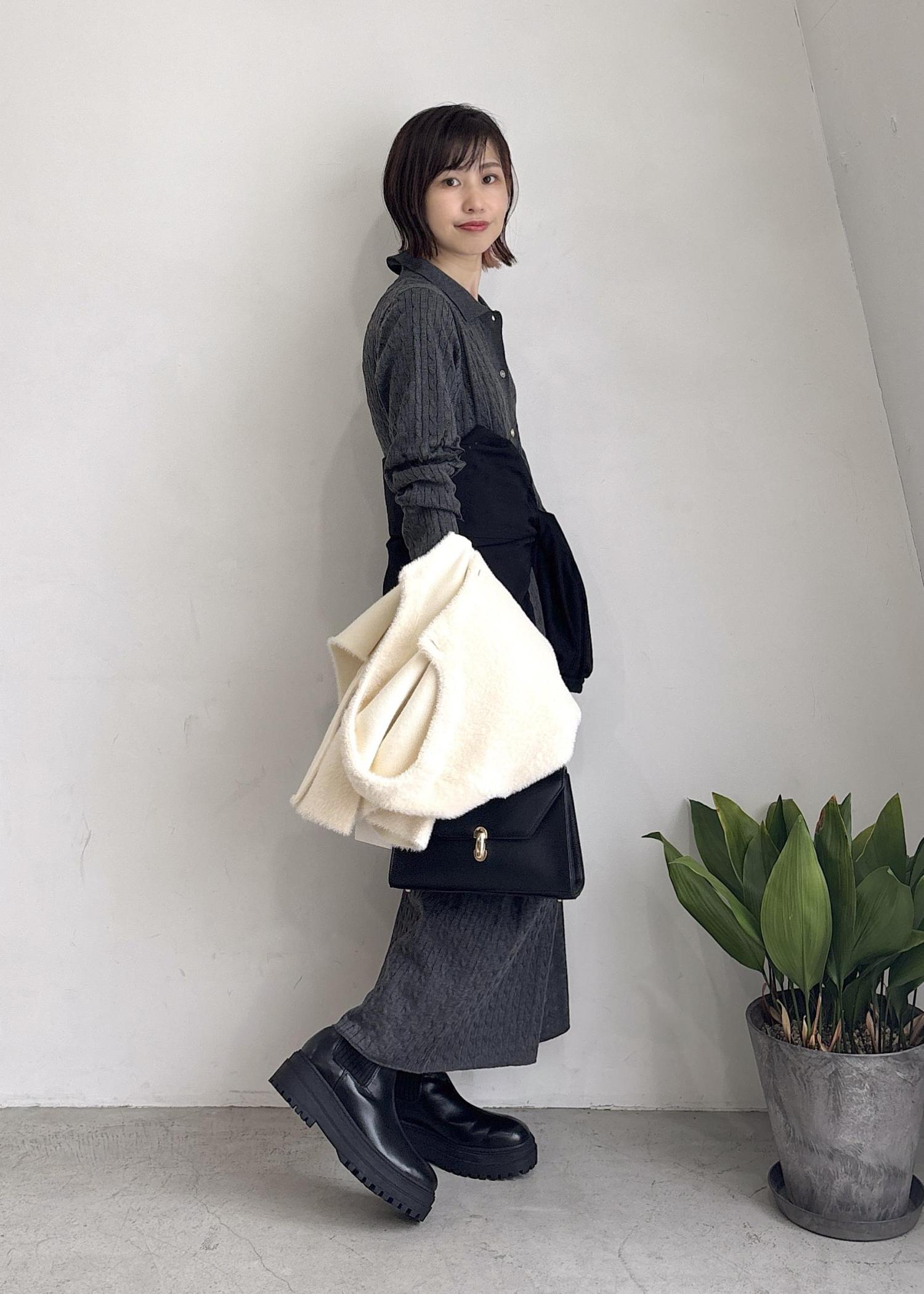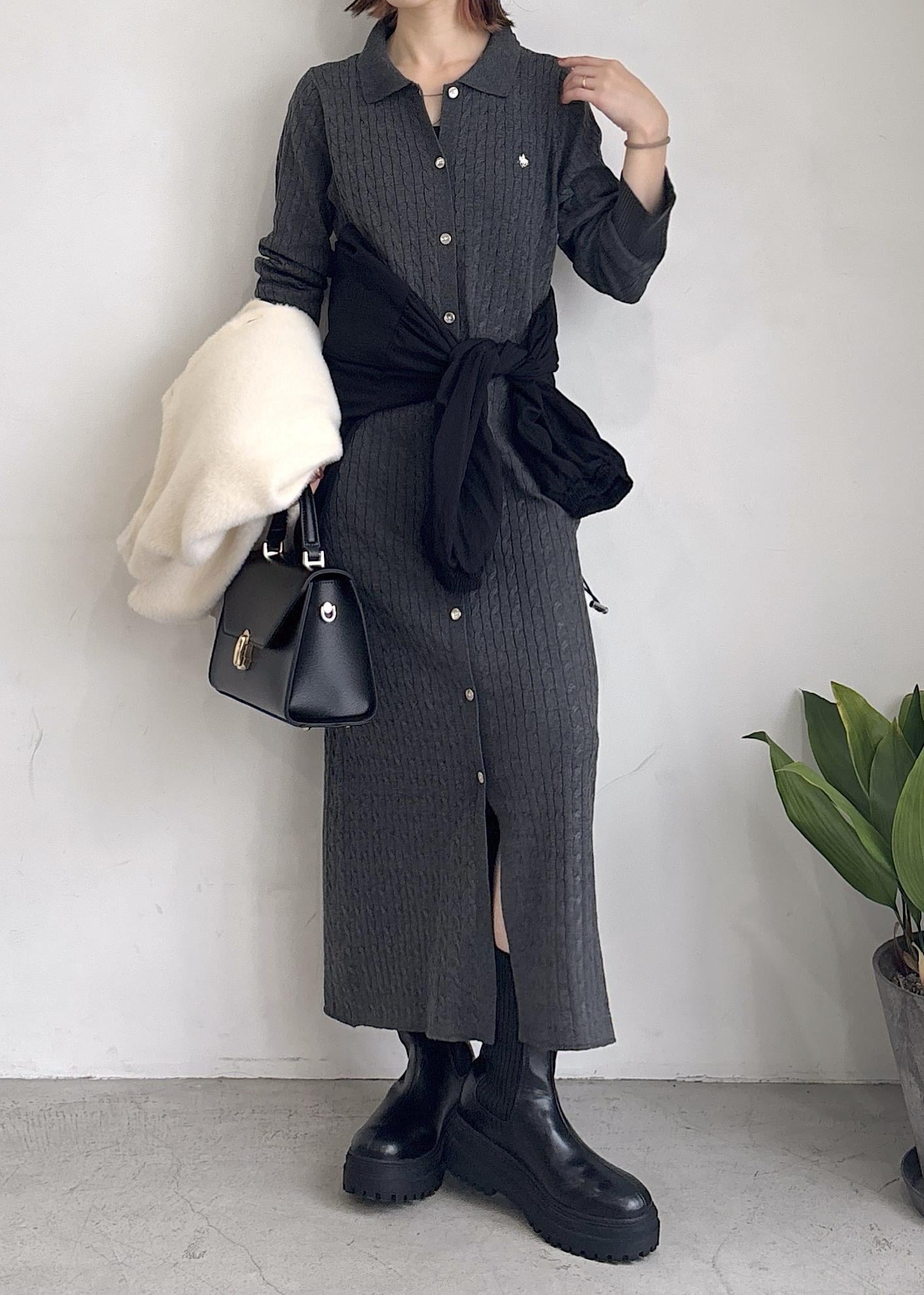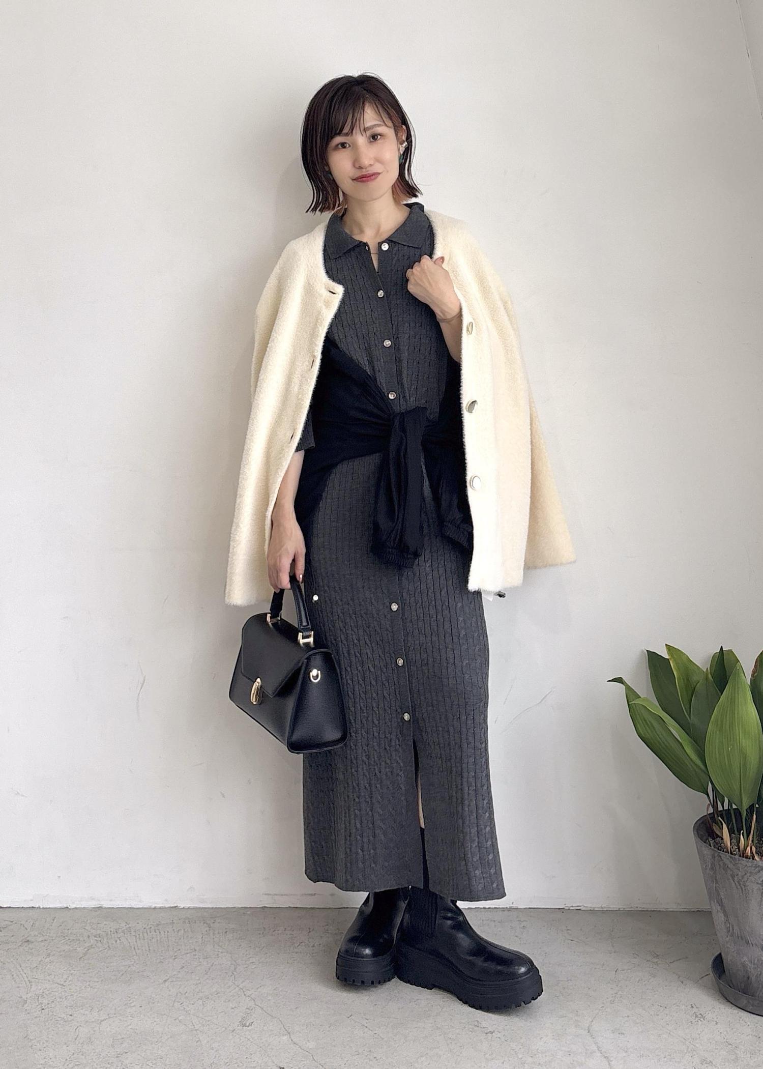 POLO BCS | VIS別注のポロ襟ニットワンピはトレンド感ある、一枚で決まるデザイン♪季節を感じるふわふわファーアウターとで大人カジュアルにまとめました◎小物はブラックでスッキリと合わせた冬のお出かけにオススメのスタイルです。