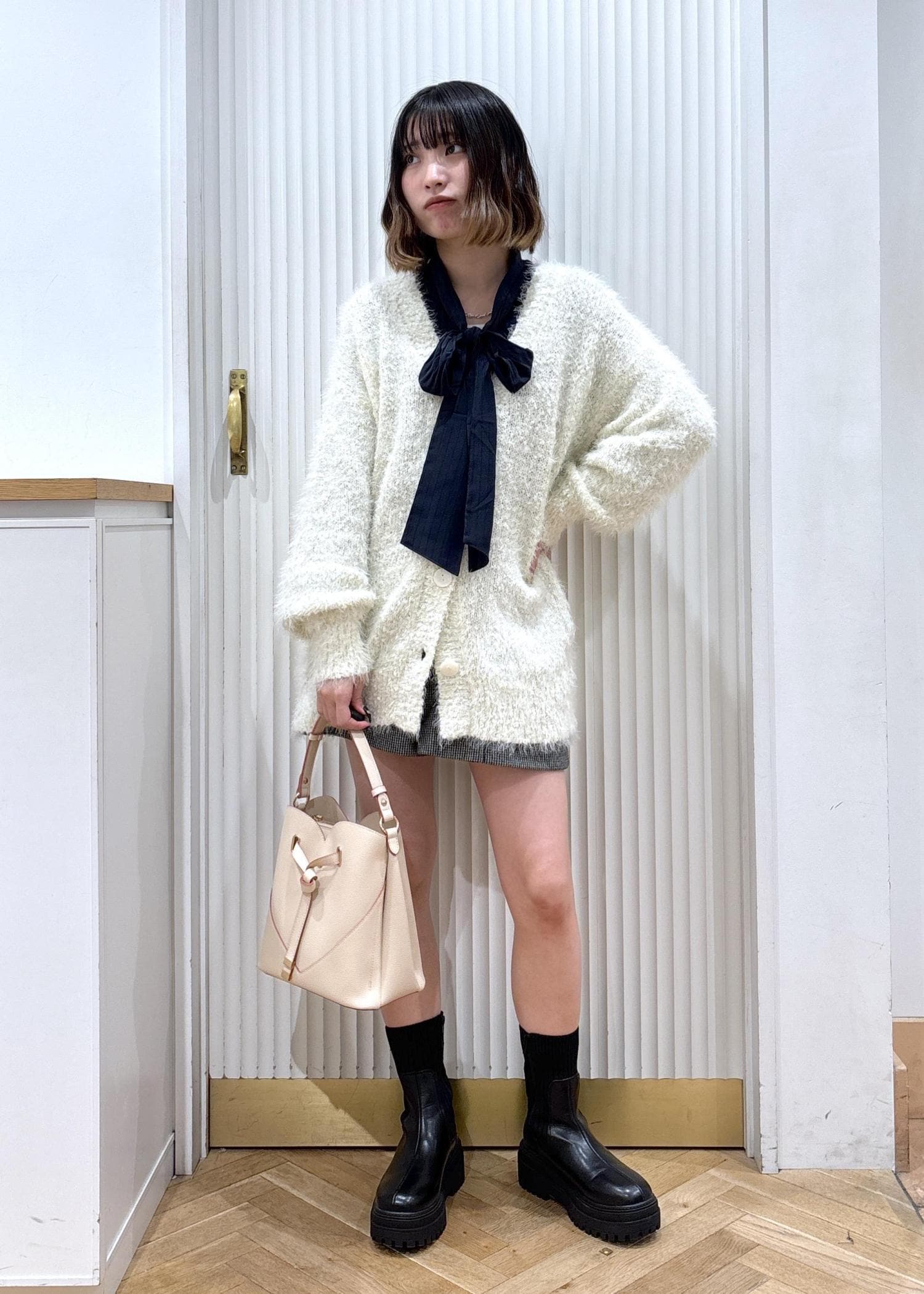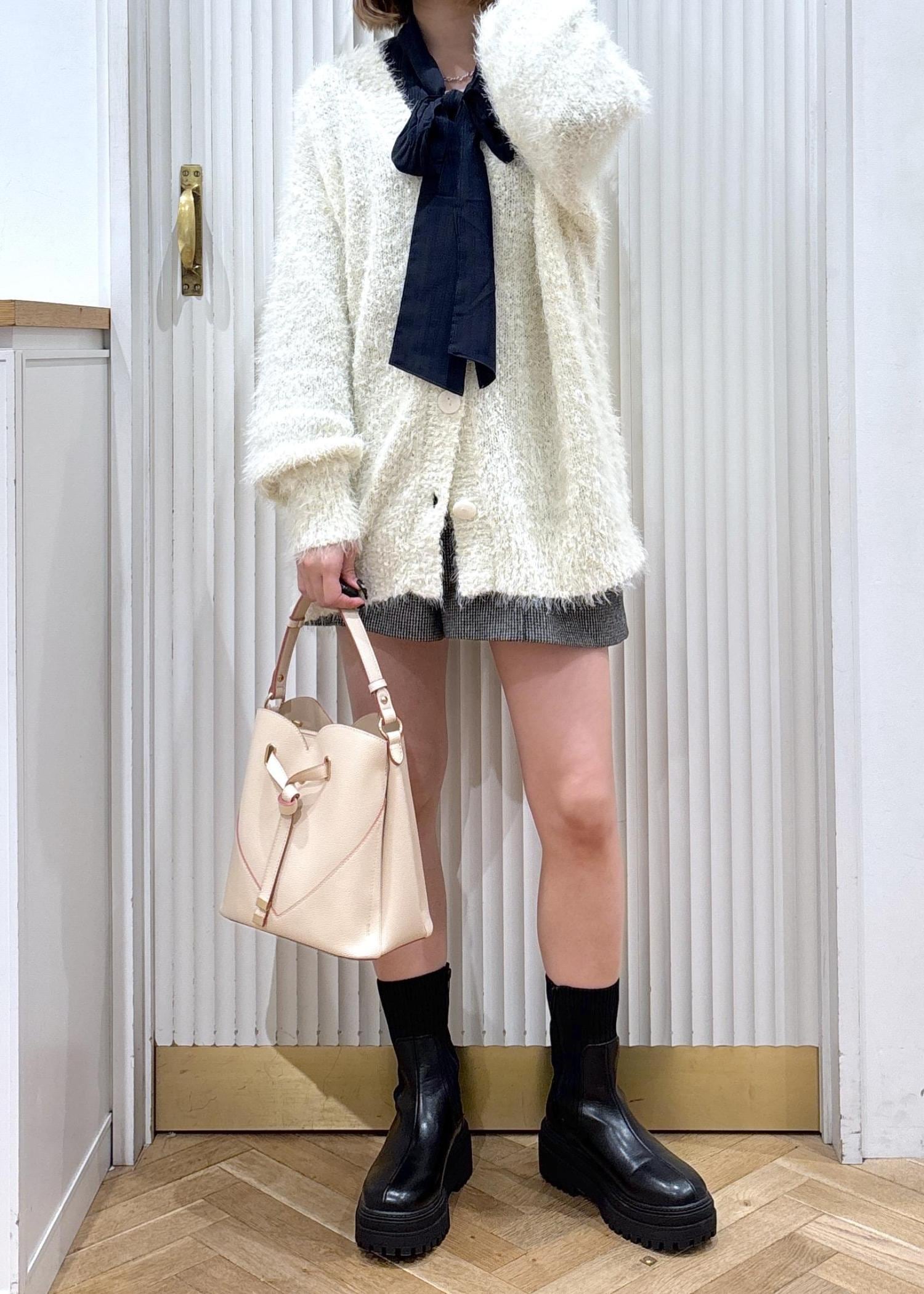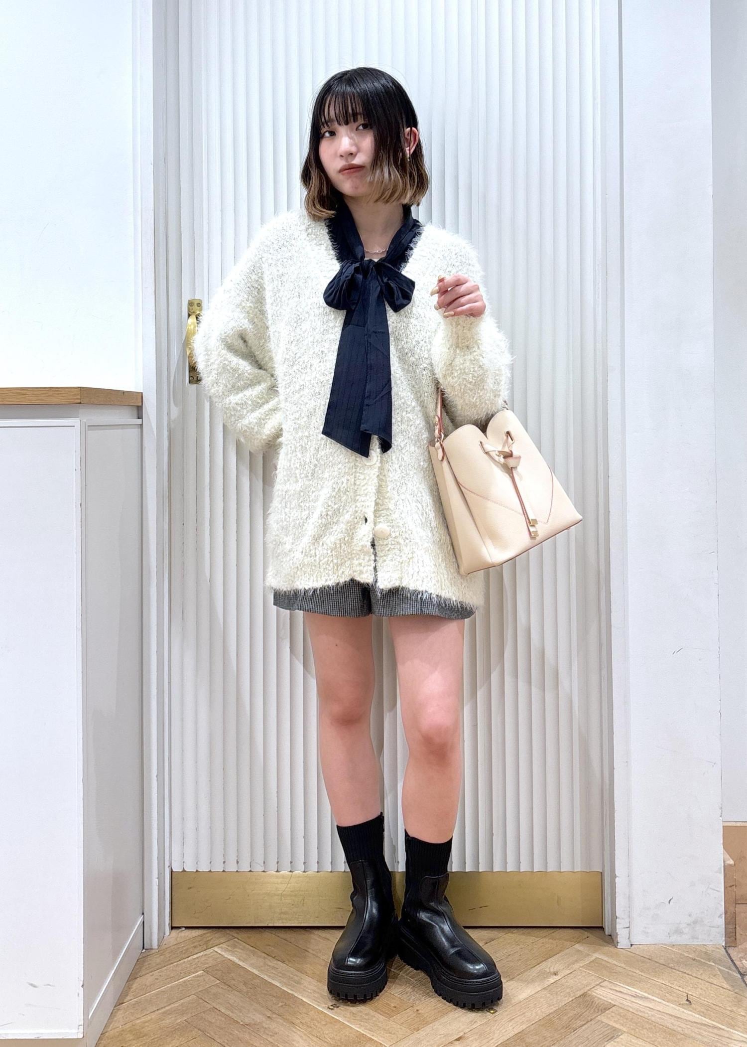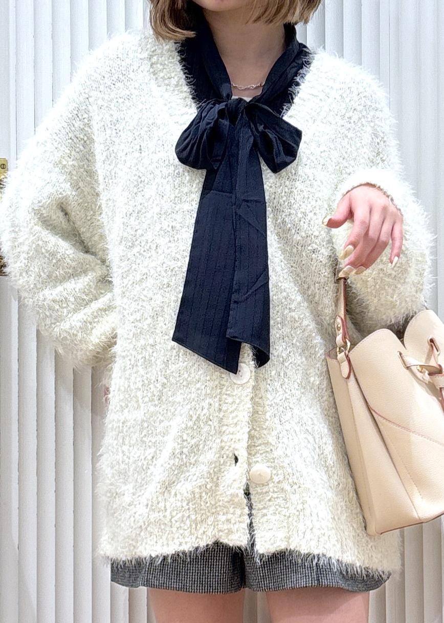 ゆったりしたサイズ感のカーディガンが主役の甘めコーデです!リボンブラウスを合わせることで甘さが引き立ちます☺︎