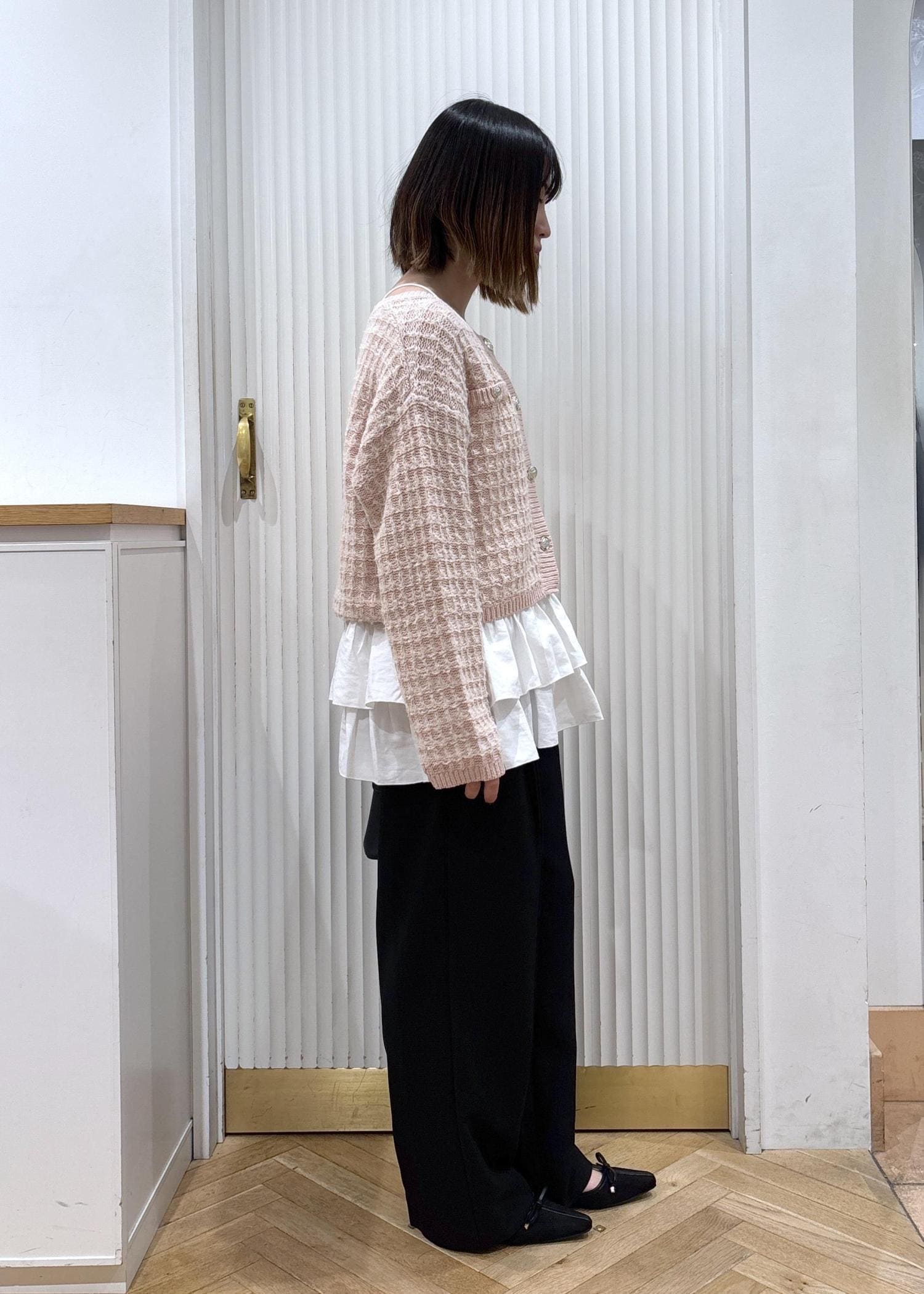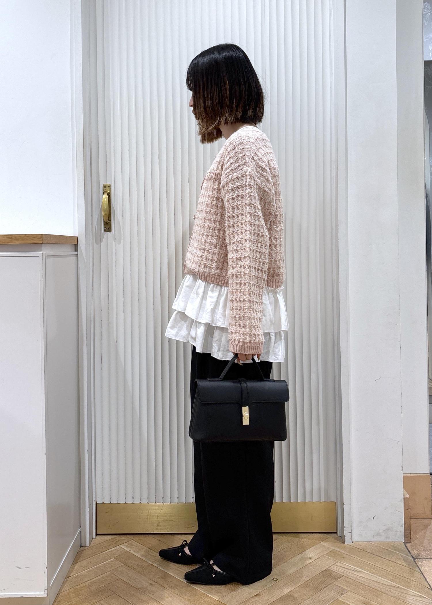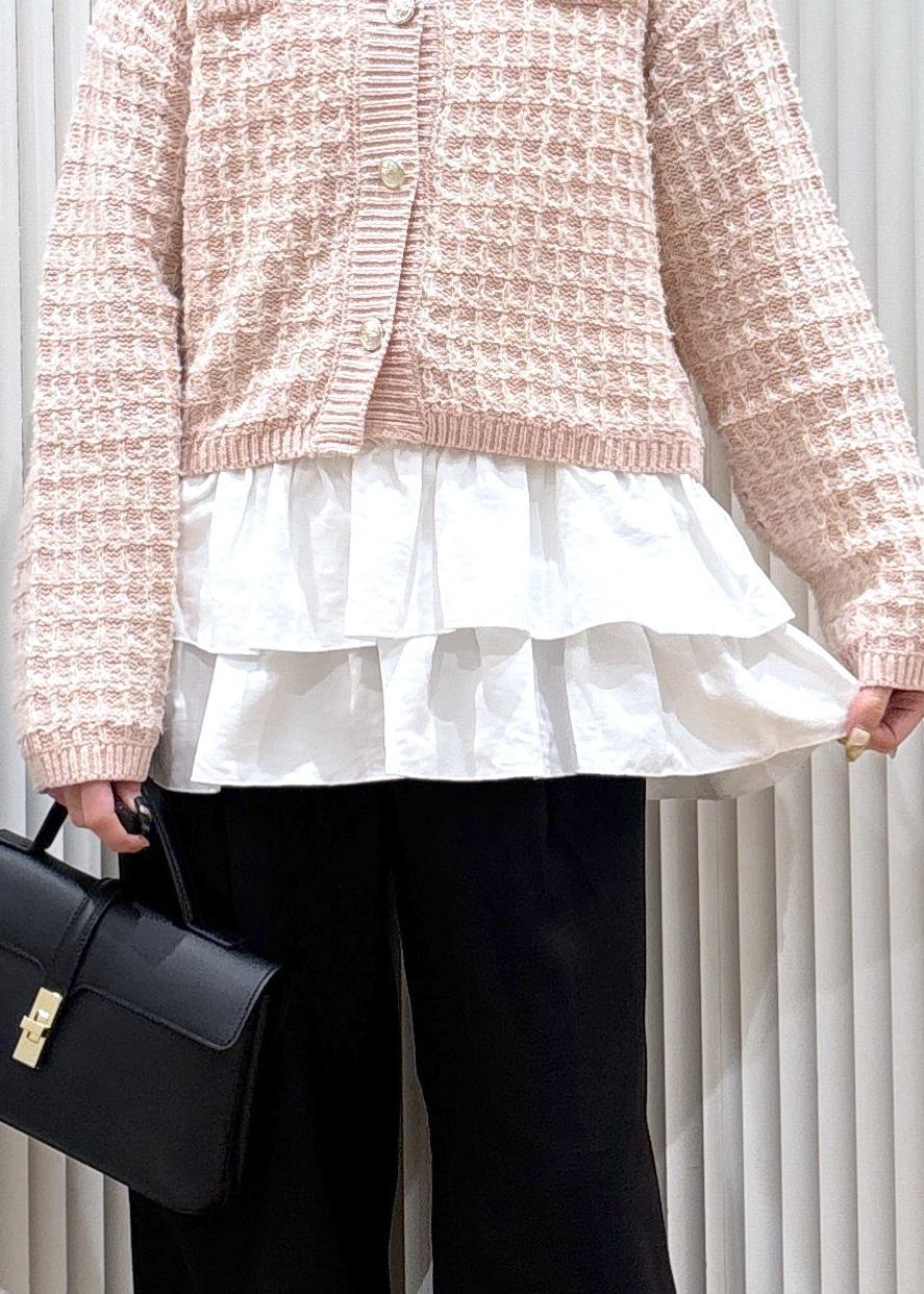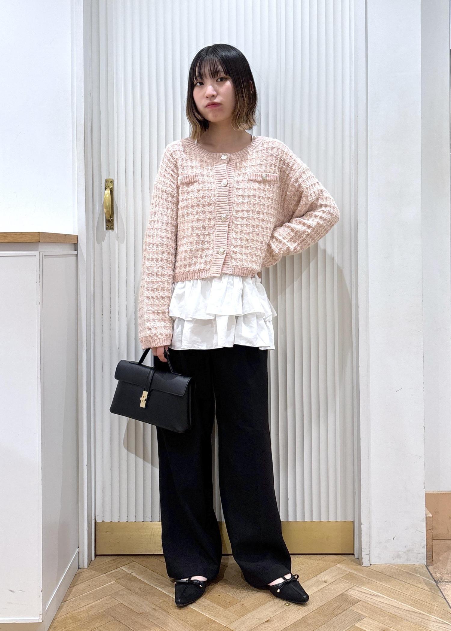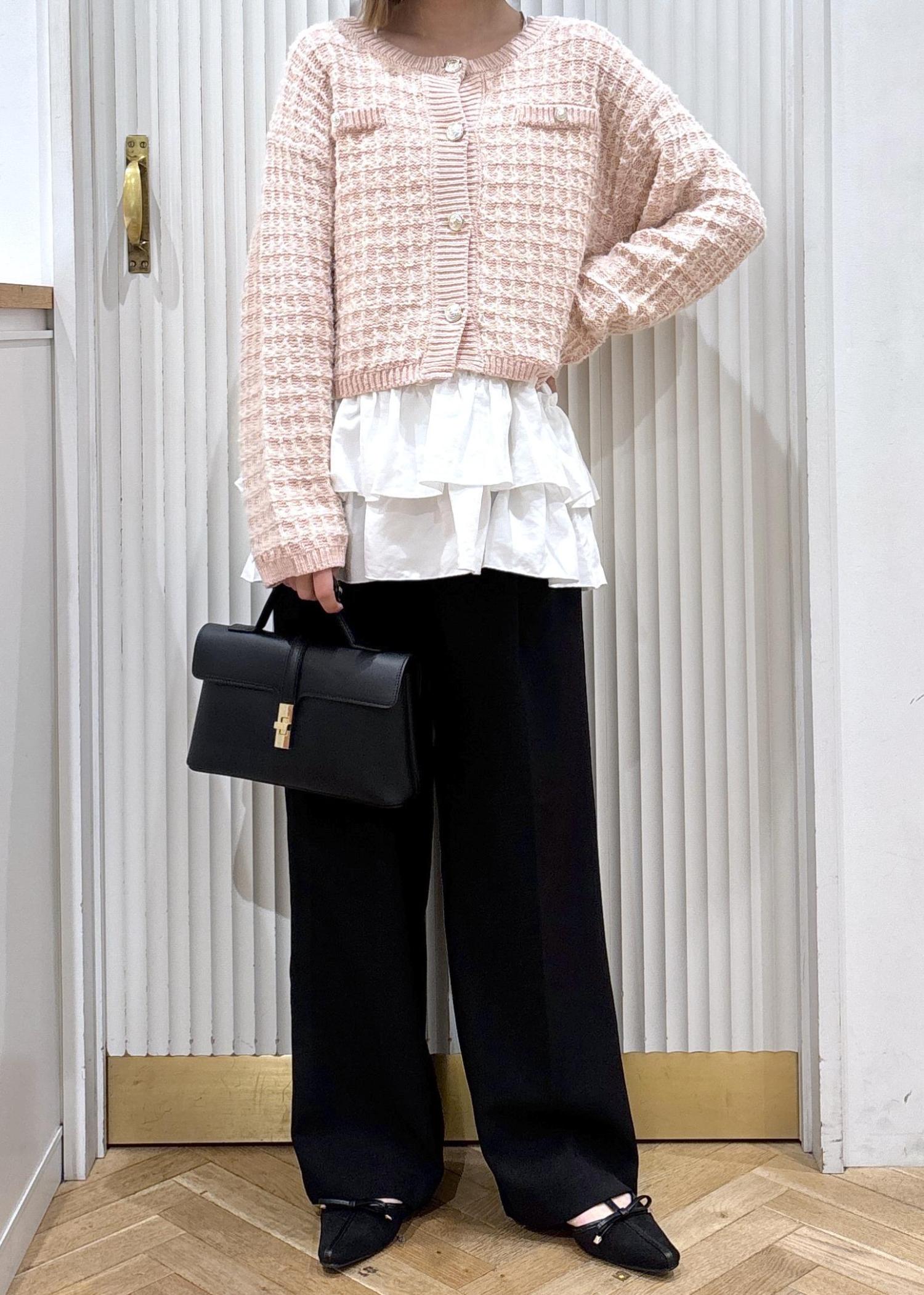ピンクのツイードカーディガンが目を惹くコーディネートです!カーディガンとパンツでもバランスがいいのですが、カーディガンの中にフリルが着いたキャミソールを合わせることでコーデが一気に華やかになります。パンツや靴、バッグと下に黒を持ってくることで色味のバランスが取れます!