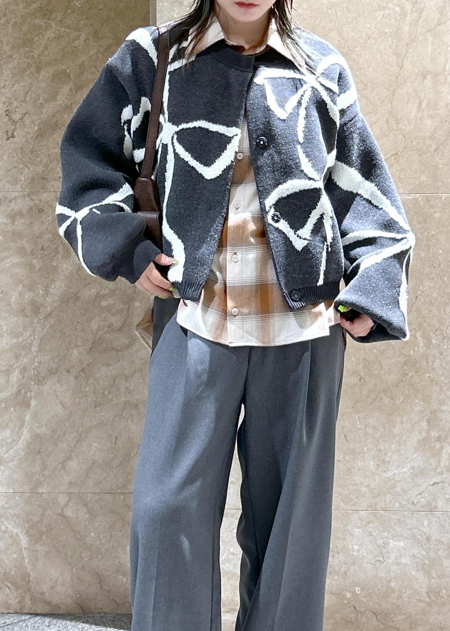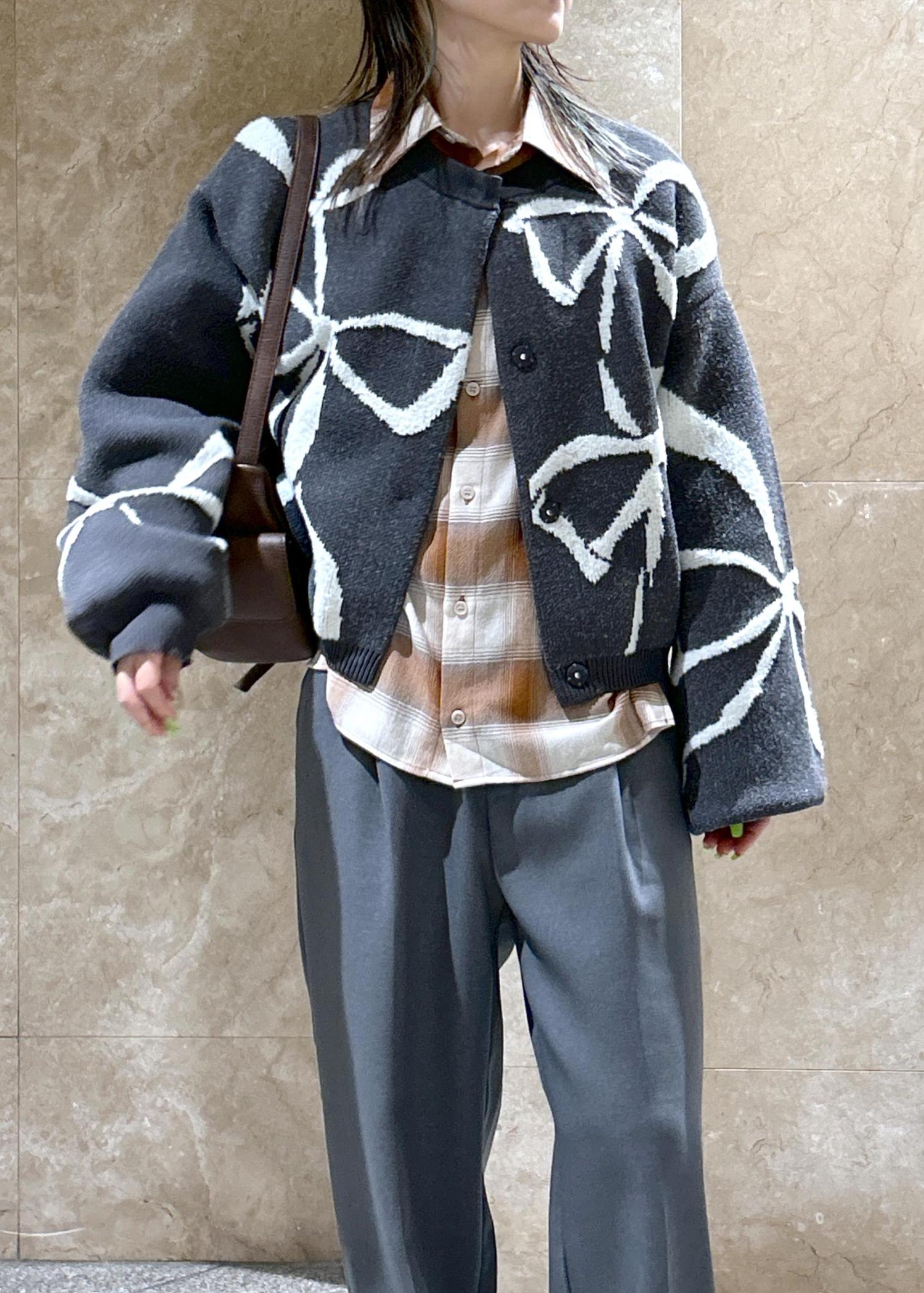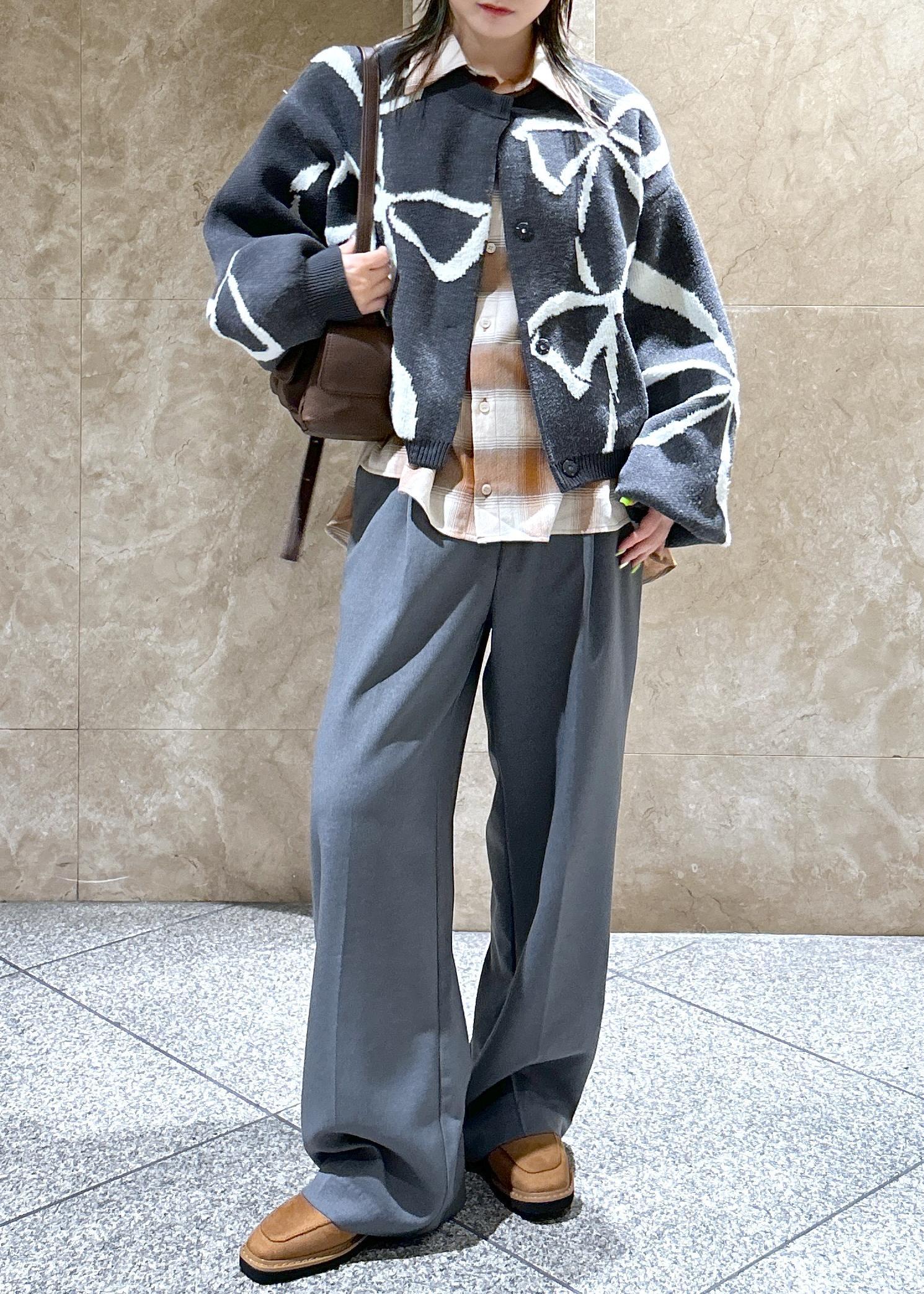 VISリボンモチーフジャガードカーディガン/イージーケアグレー / F¥6,919レビュー大きなリボンのデザインが目を引くカーディガン!