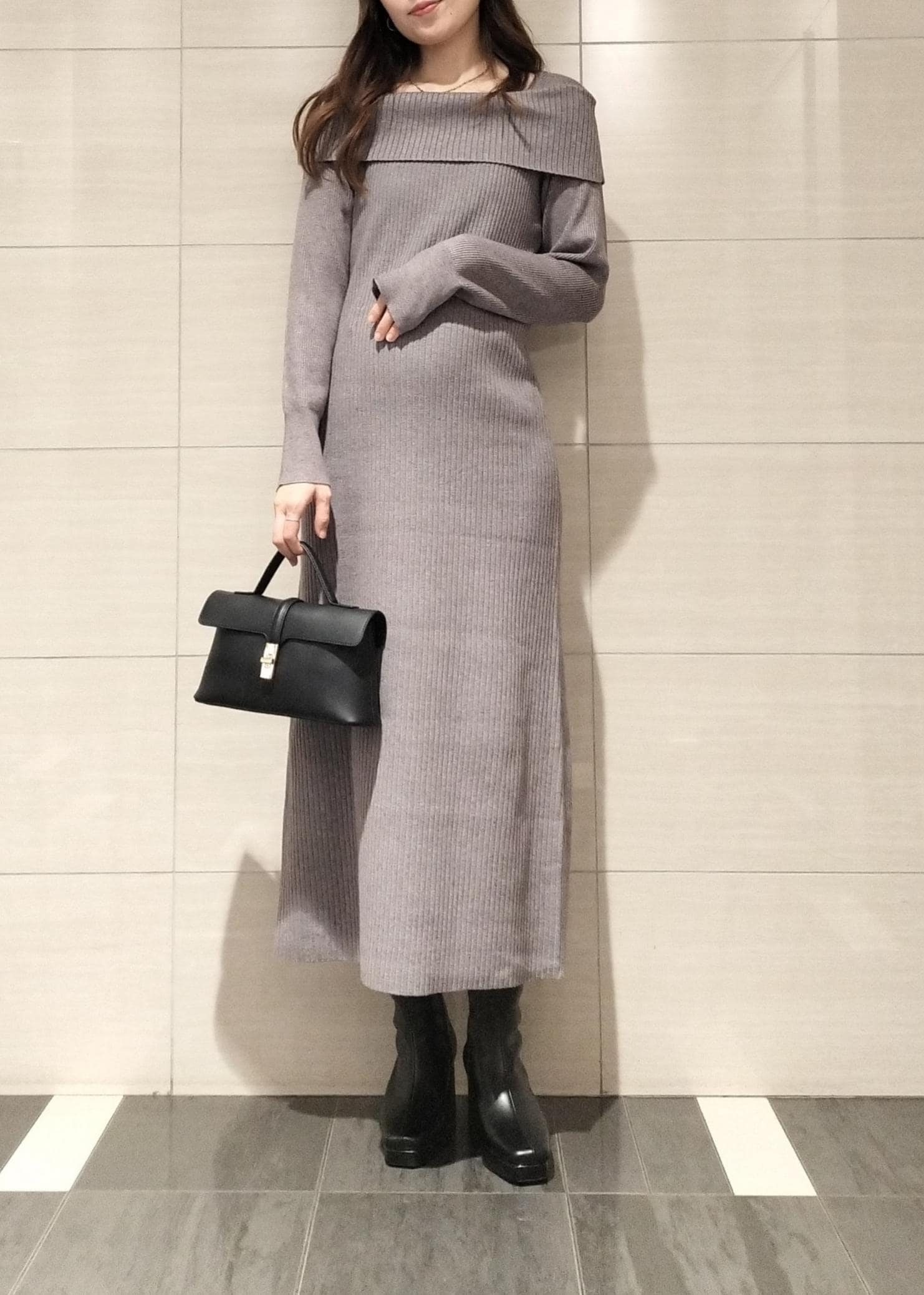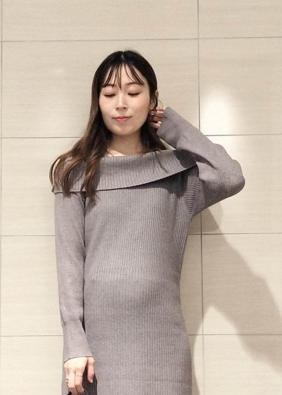 VISアシメオフショルリブニット美シルエットワンピース/着丈が選べるグレー / F¥8,899レビュー着丈が選べるオフショル風ワンピース♪
