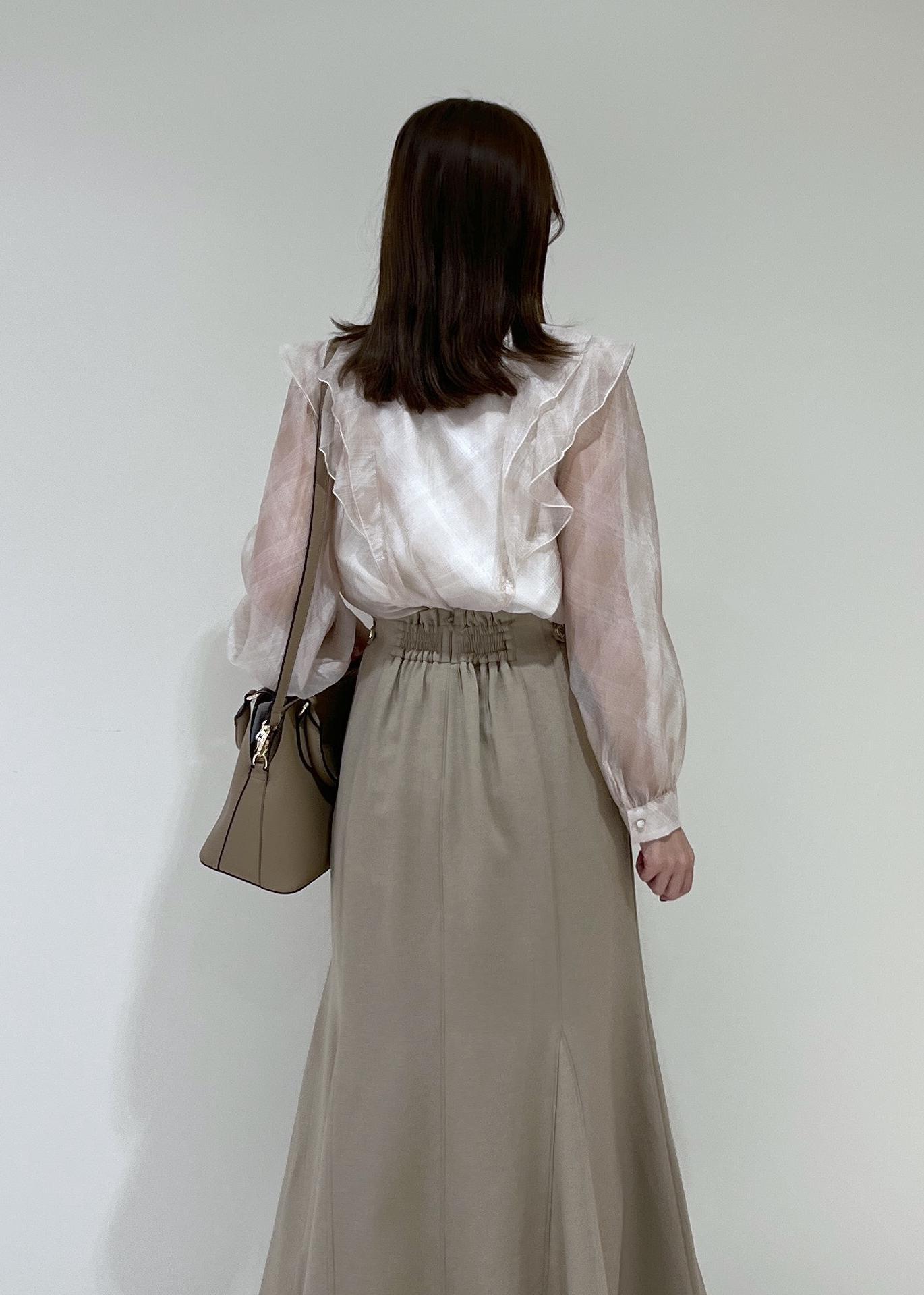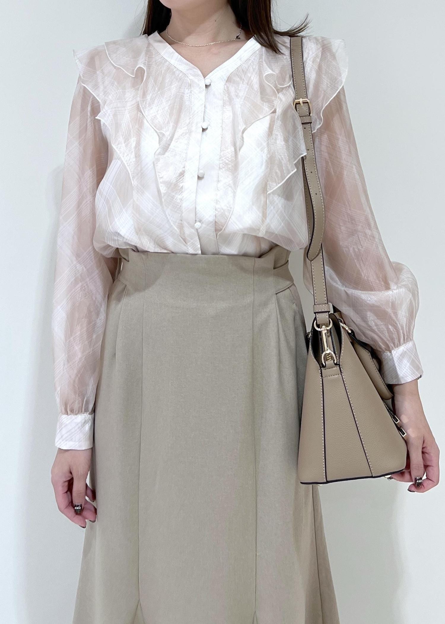 VISフロントフリルシアーチェックブラウス/イージーケアベージュ系 / F¥4,612レビュー大き過ぎないフリルがポイントで、お袖に透け感のあるデザインです!程よく余裕のあるサイズ感です。