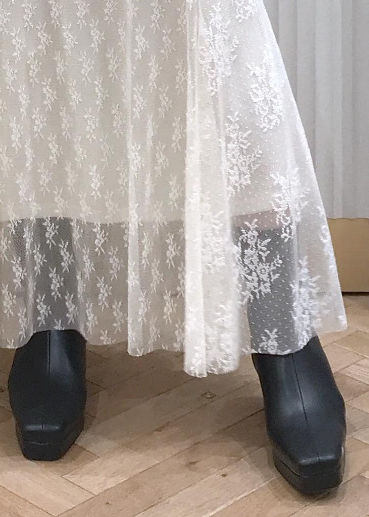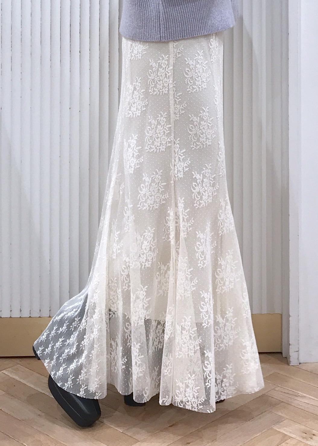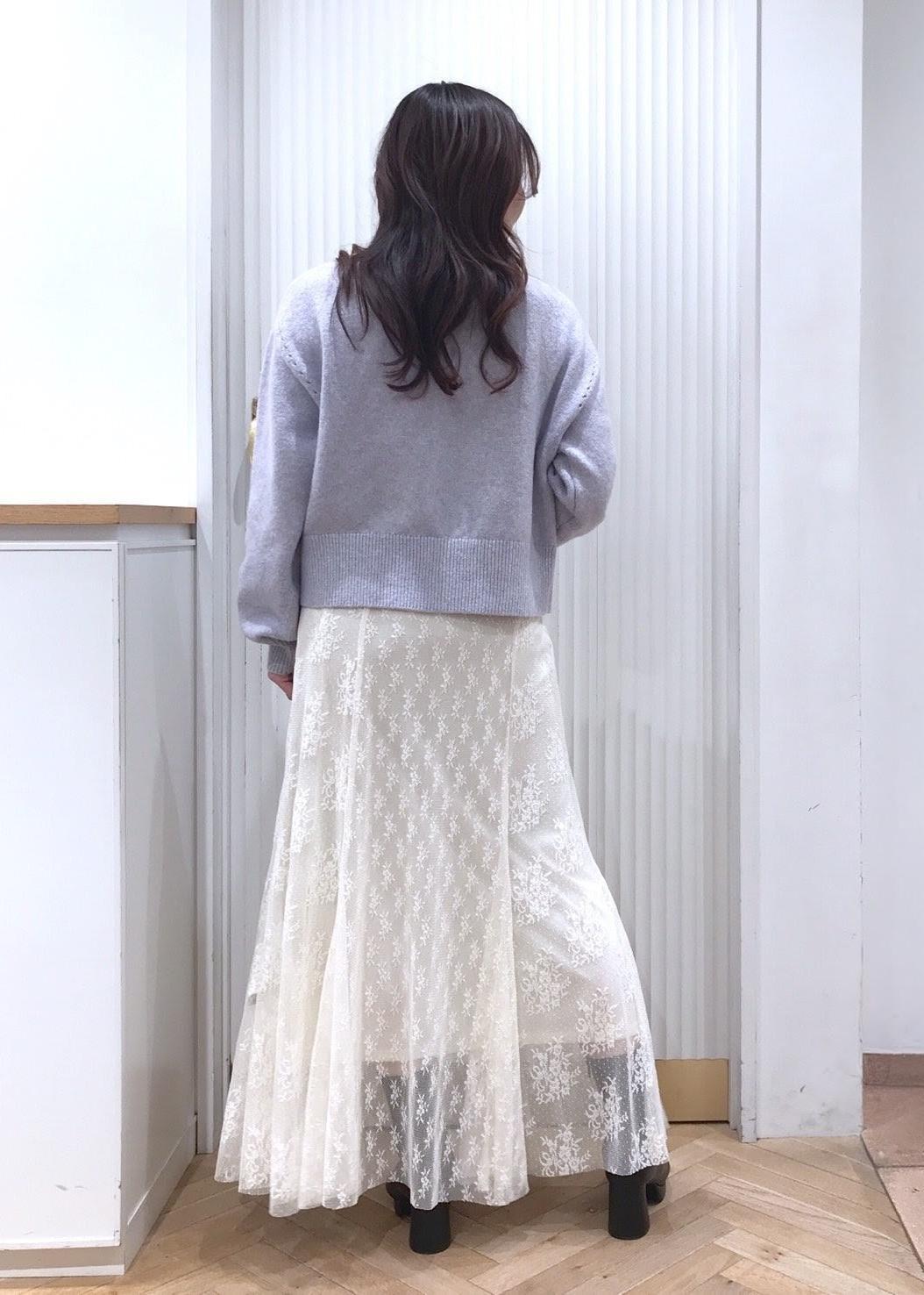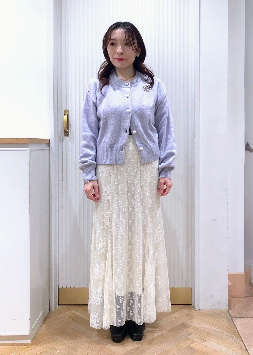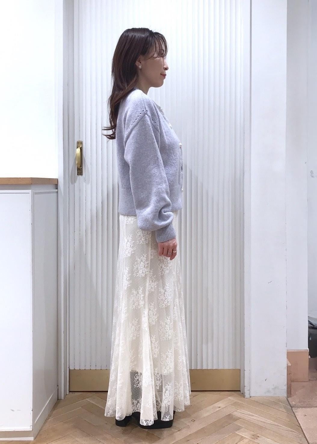 厚手のニットカーデを軽やかなレーススカートと合わせて抜け感を出したコーデです。
