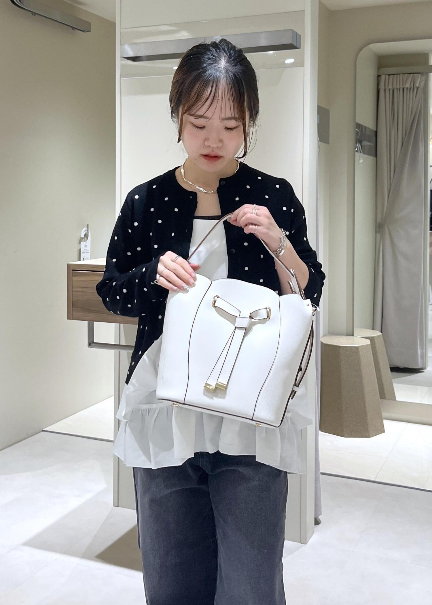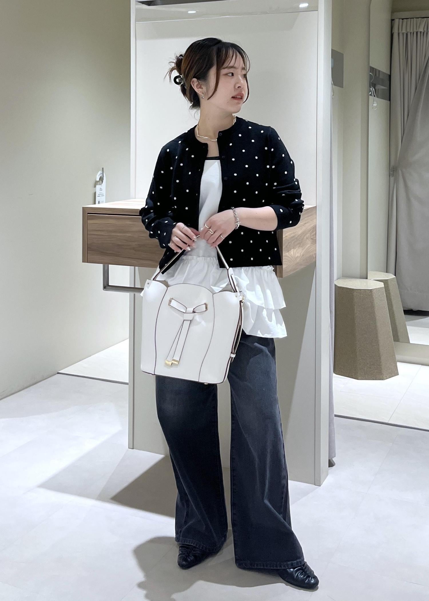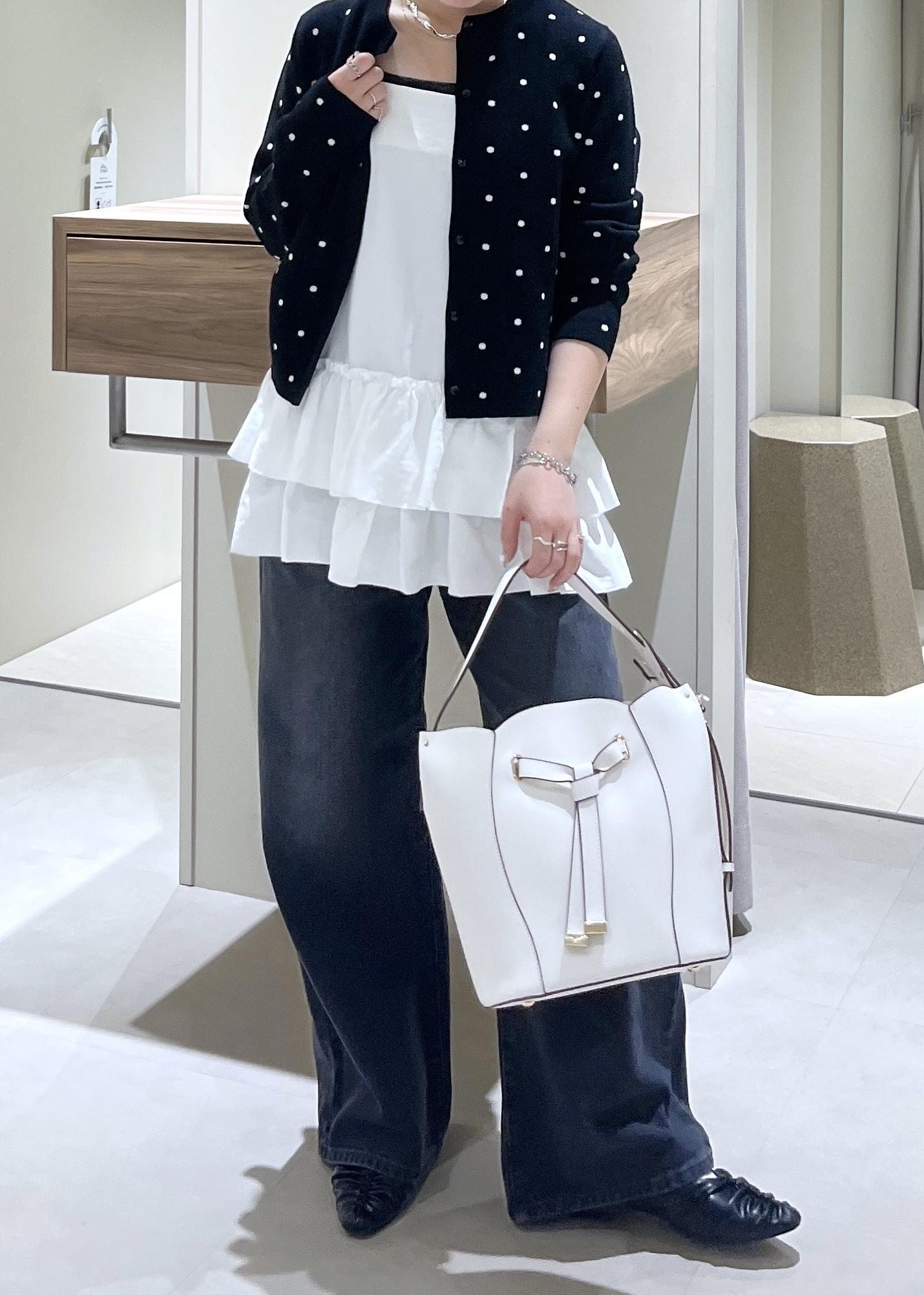 紐部分がアシンメトリーなデザインになるので、デコルテ周りがあいているトップスを着ても可愛いなと思いました☺︎