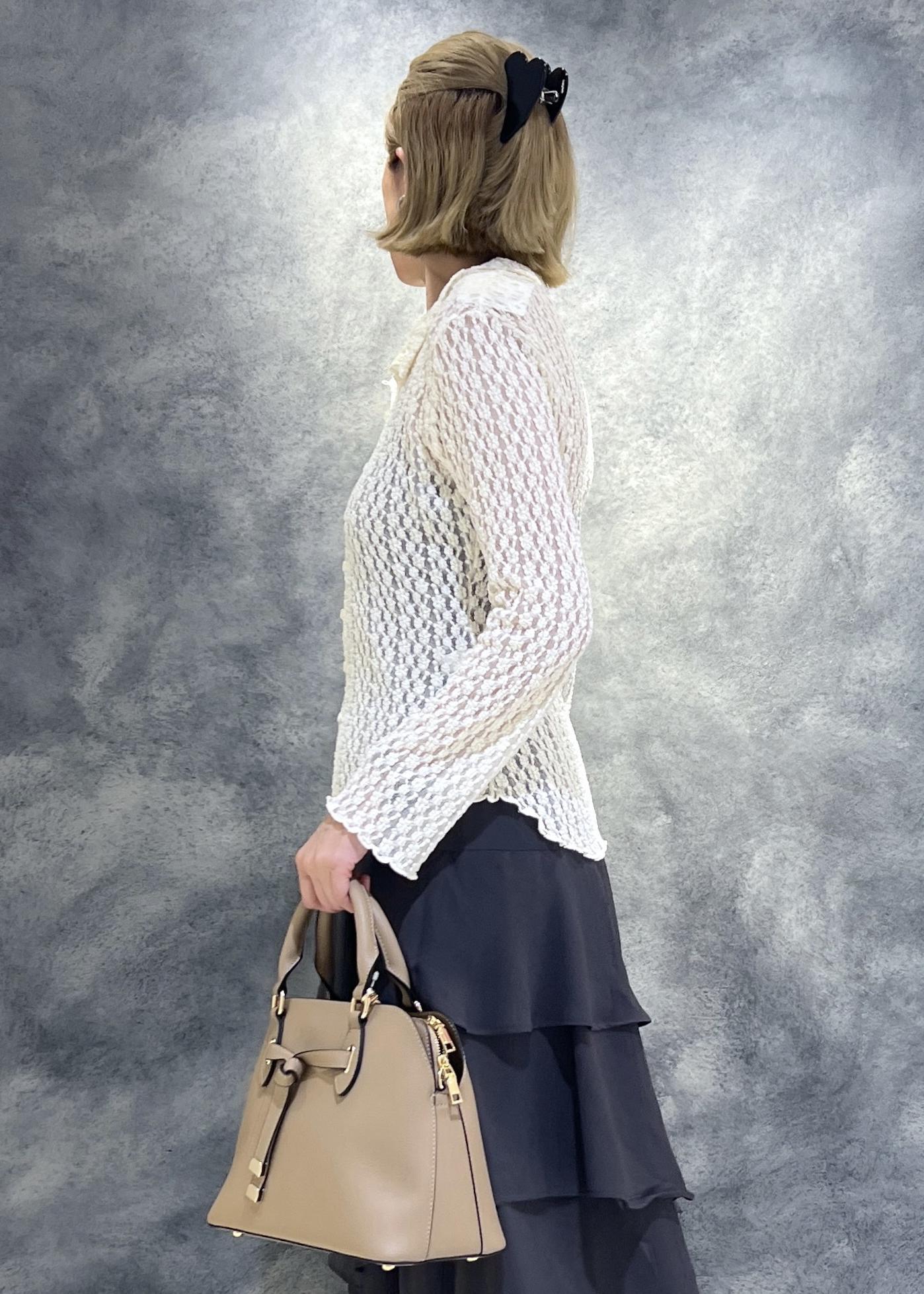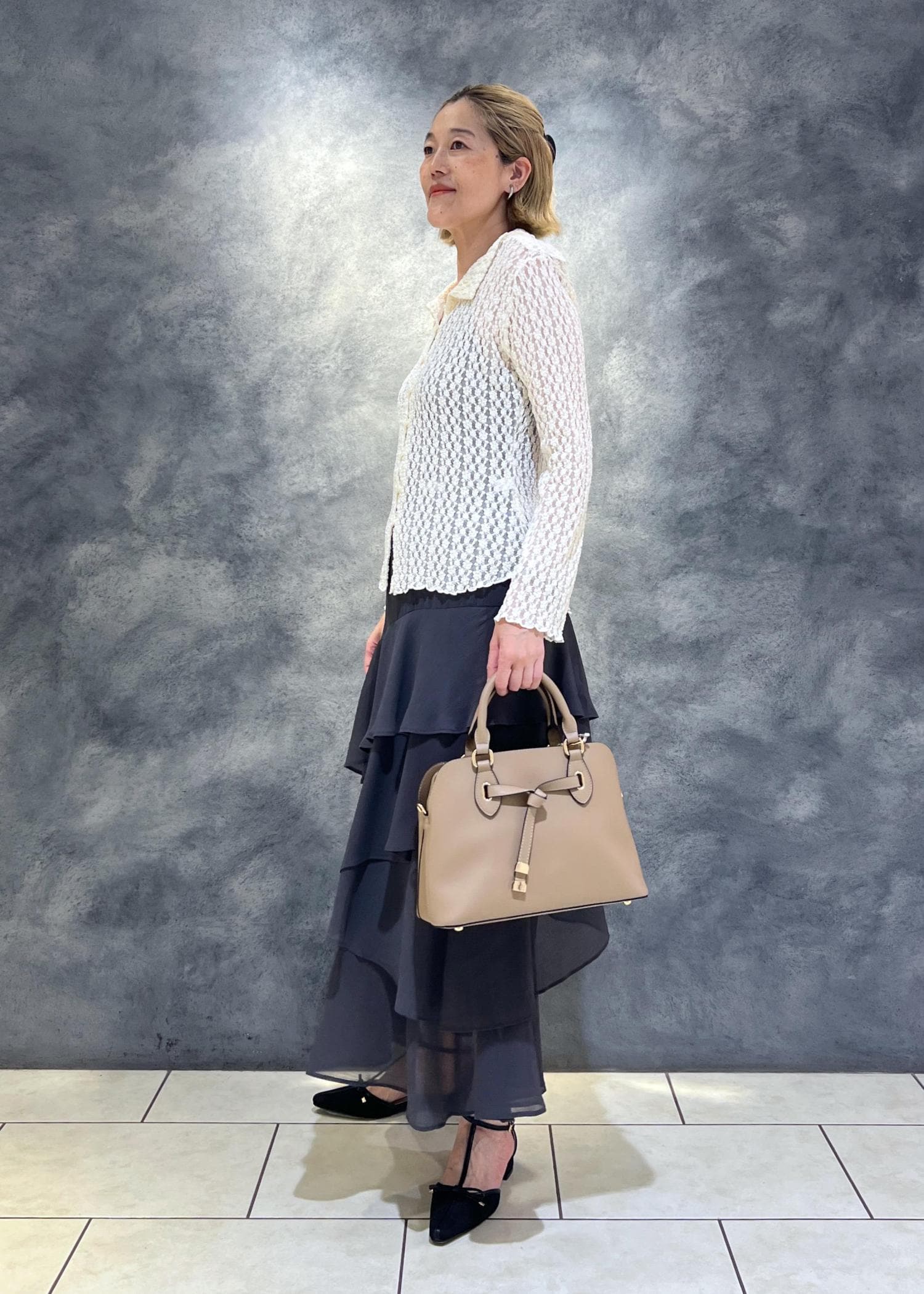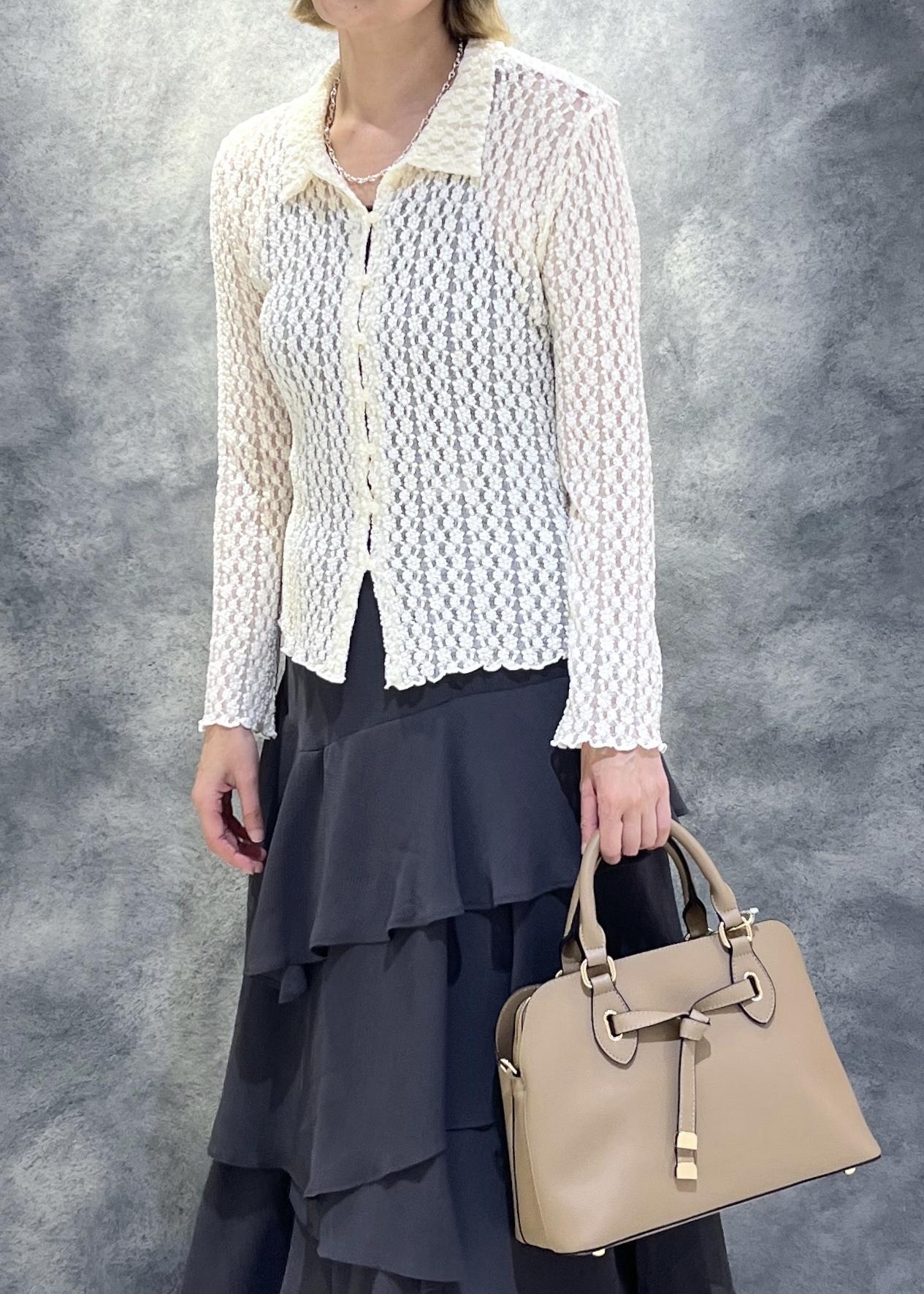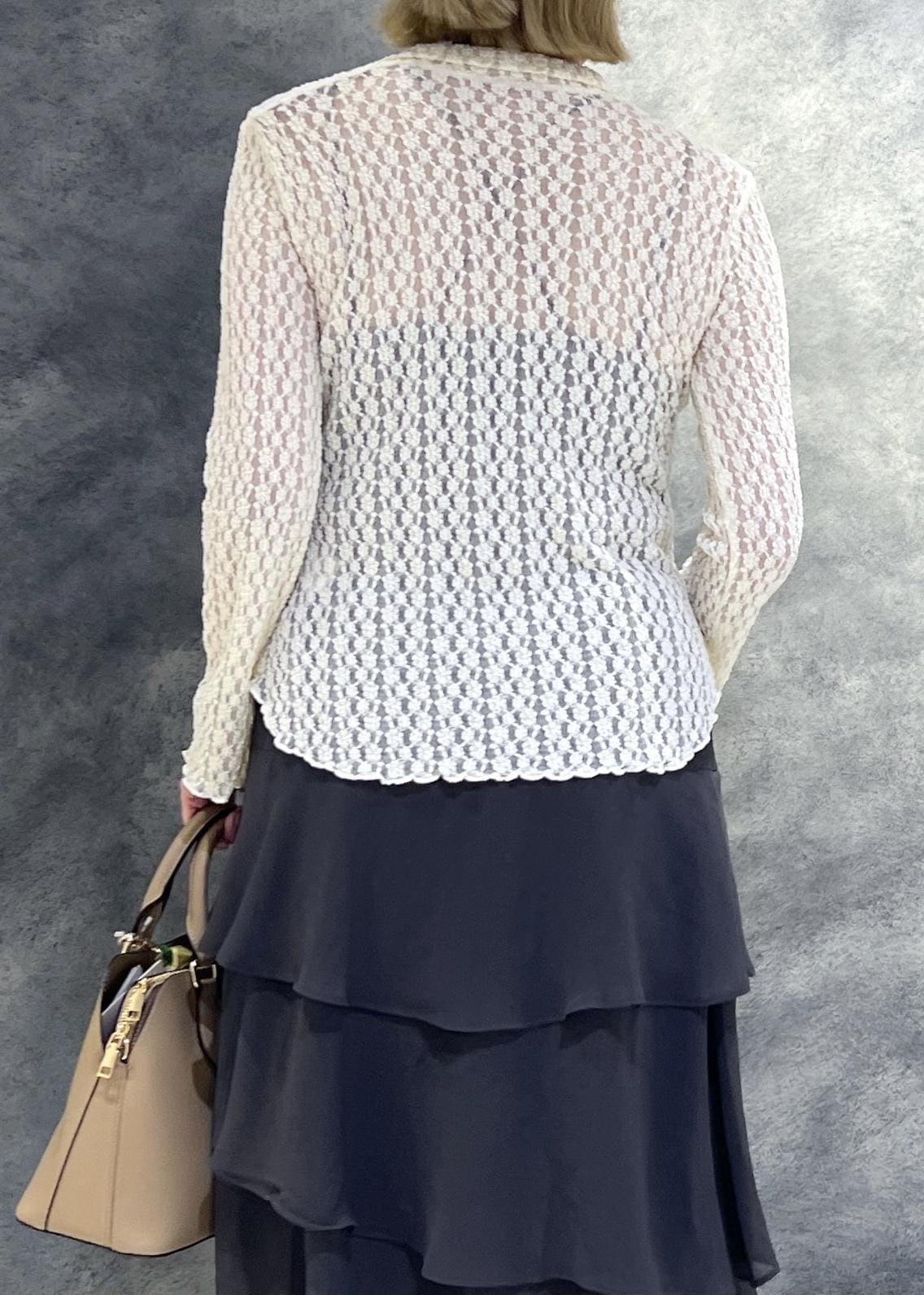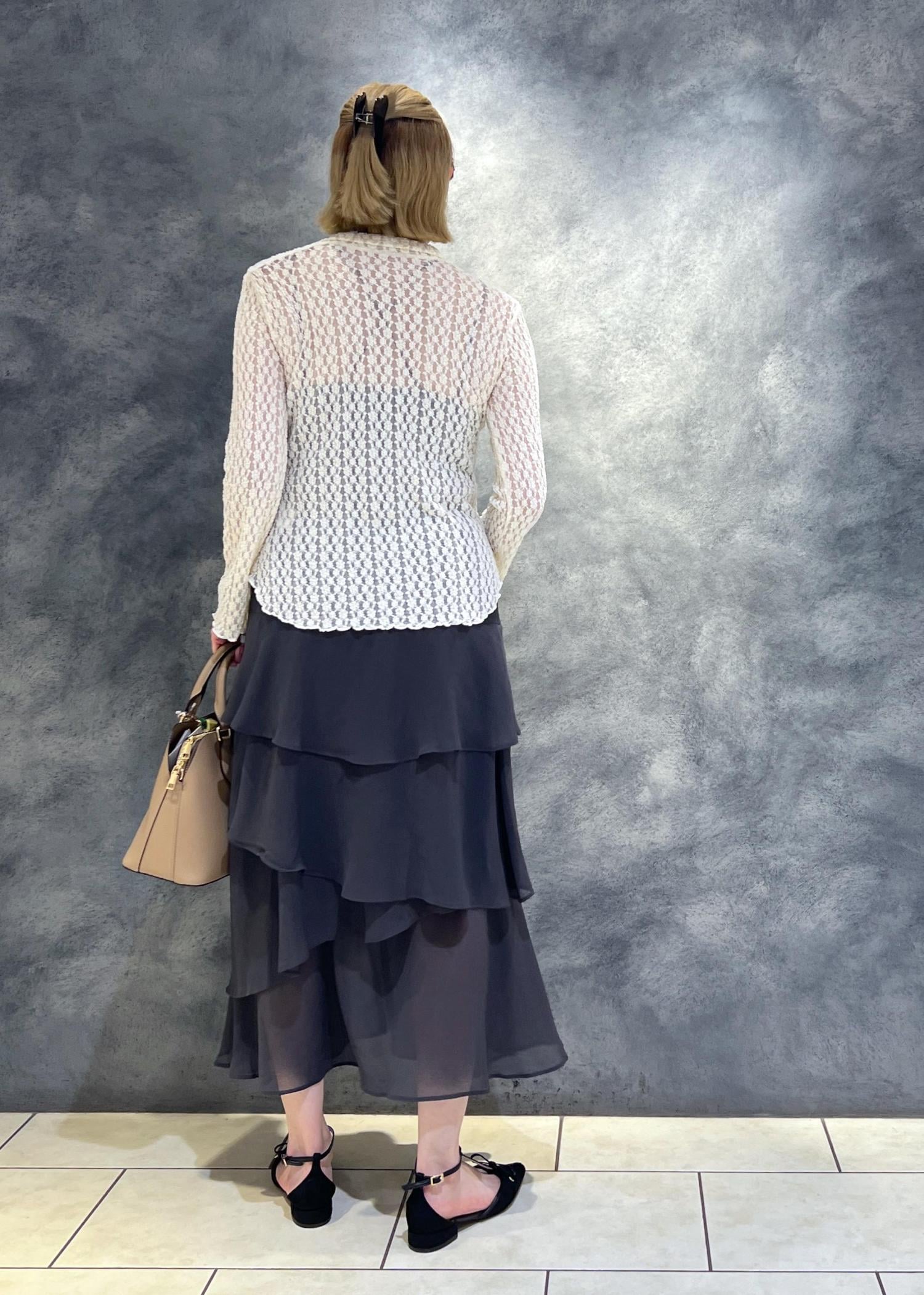 カーディガンなのでシルエットにも余裕がありレースなので通気性もあるため残暑の早い時期から着用可能。