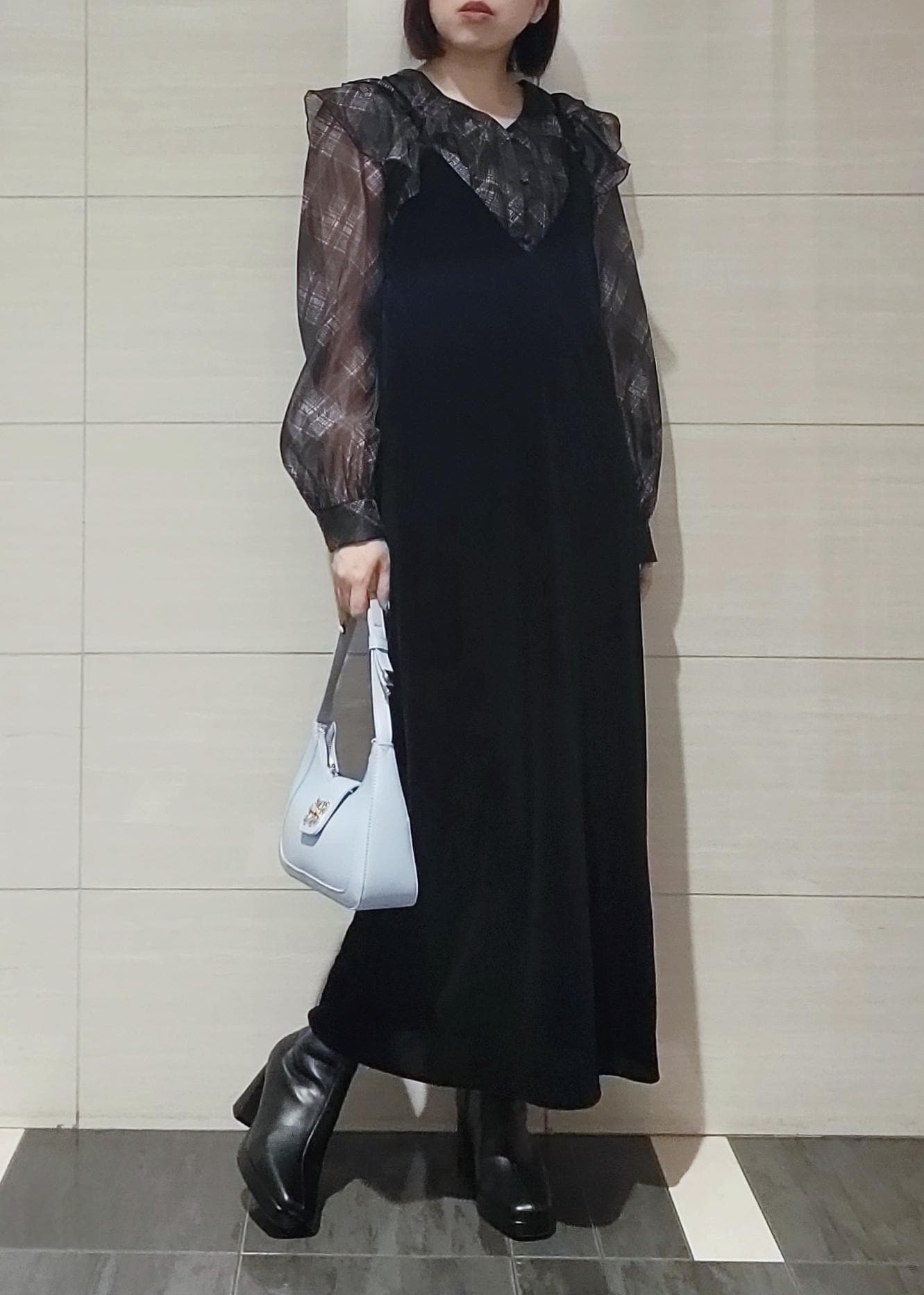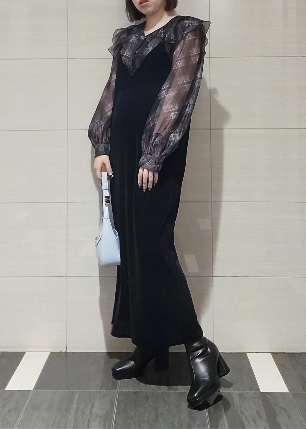 ベロア素材で季節感◎!ブラックでまとめたコーディネートのポイントにカラーバッグを合わせました。