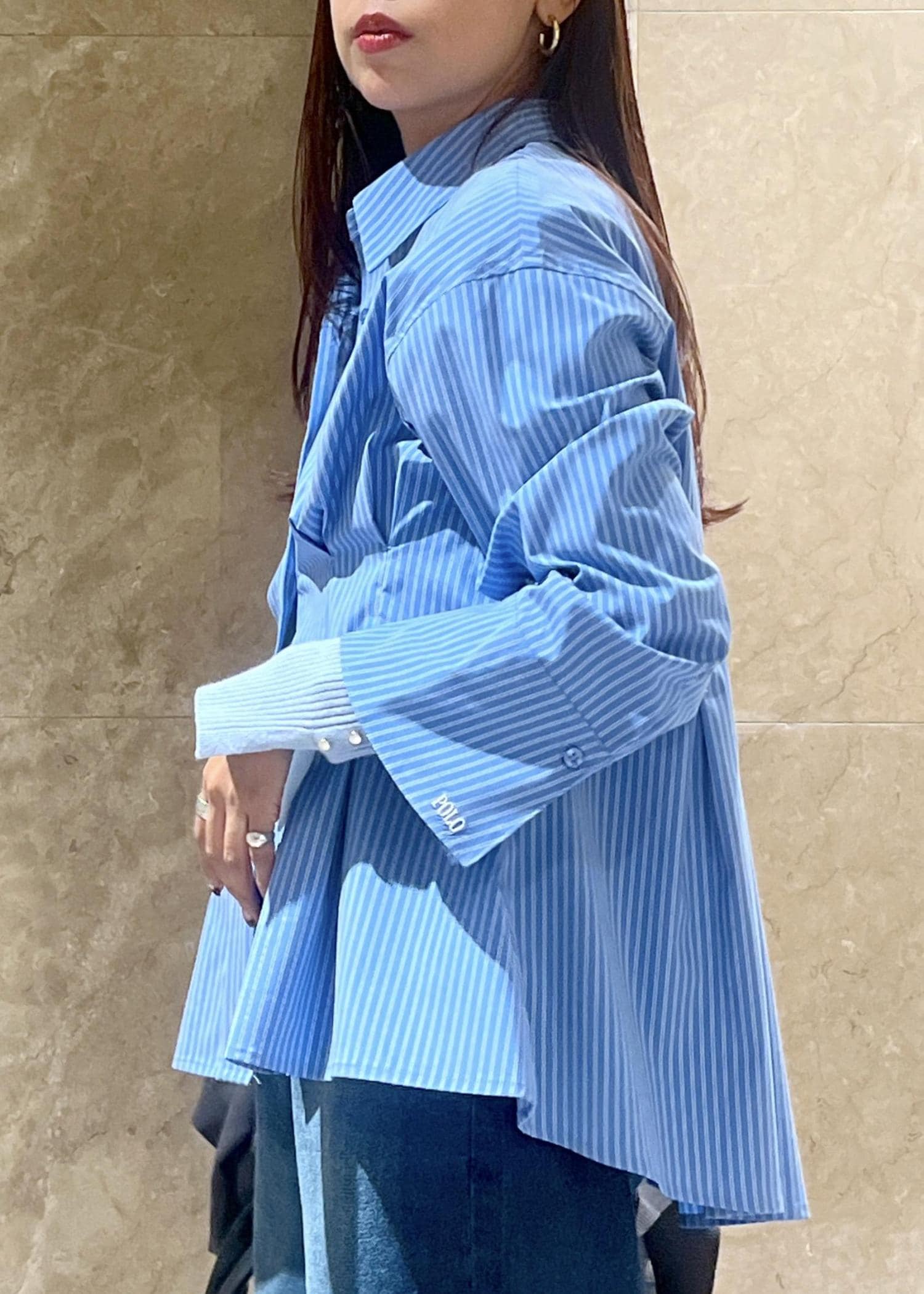 シャンとしたシャツのほどよいハリはありながら、思ったよりも柔らかい素材感なので、すっきりめの羽織を合わせたり、上からスウェット、ニットなど重ねてもゴワつかずに着用できそう!写真のコーディネートではブラックのインナーを着用しており、少し透け感あり。
