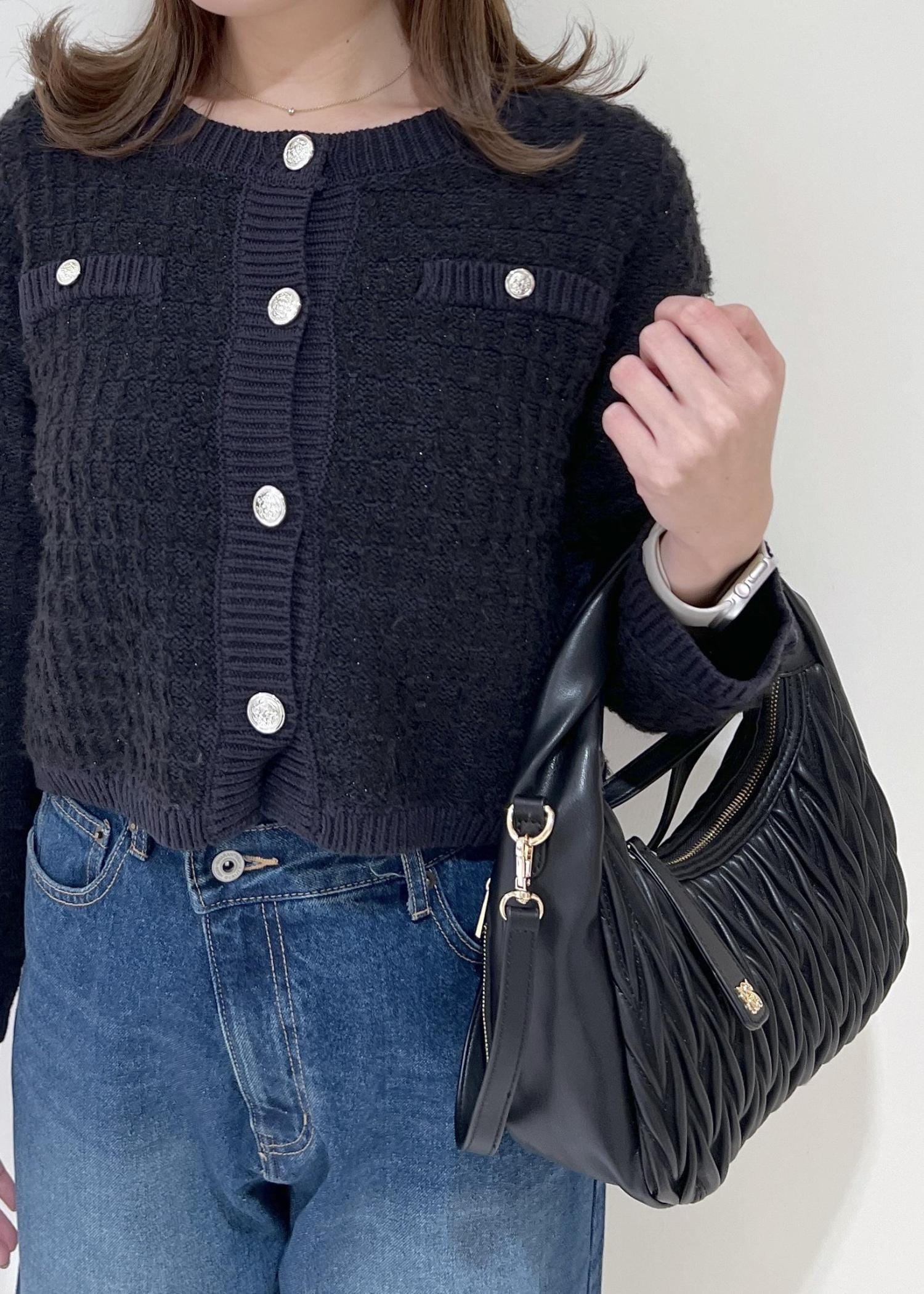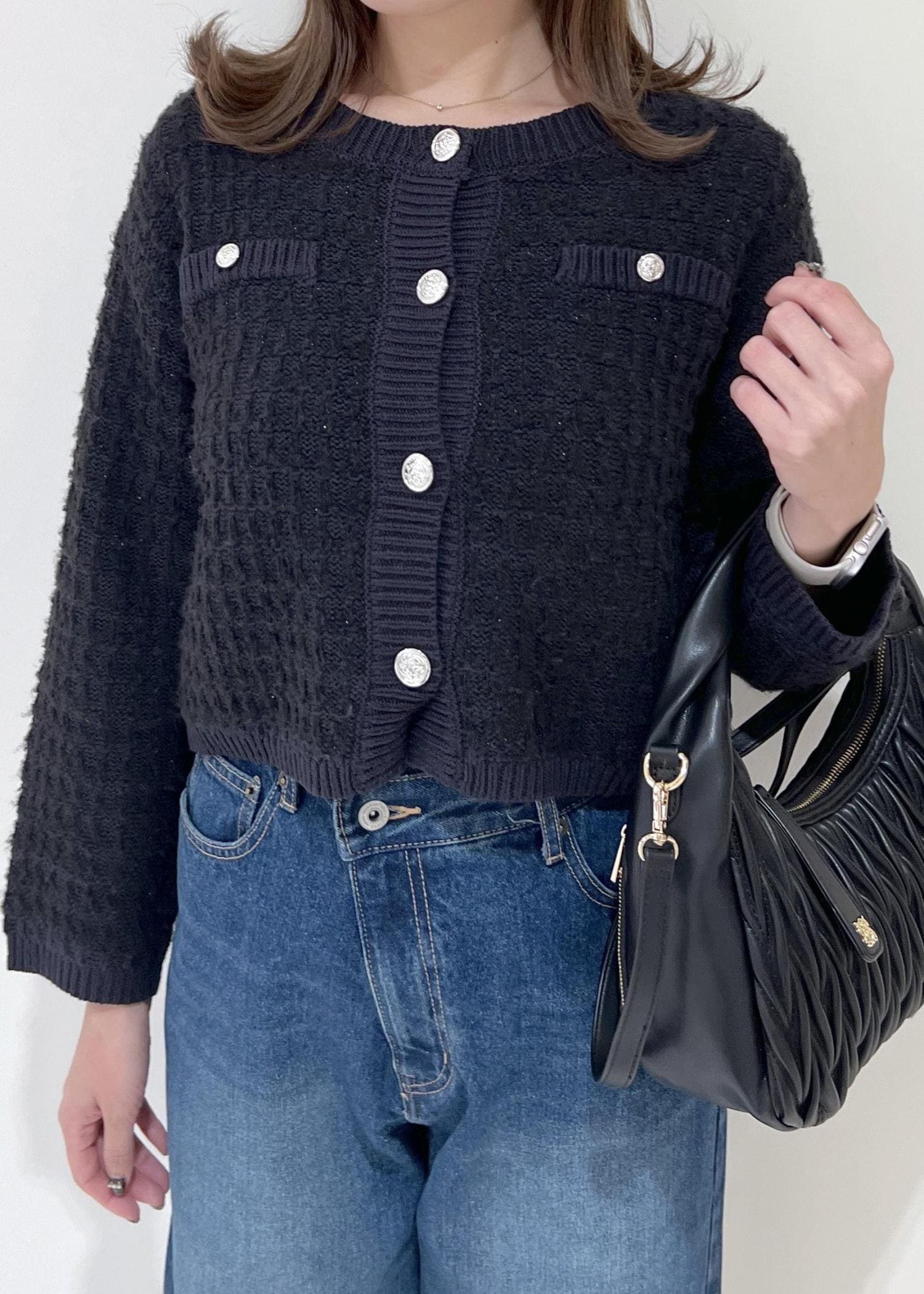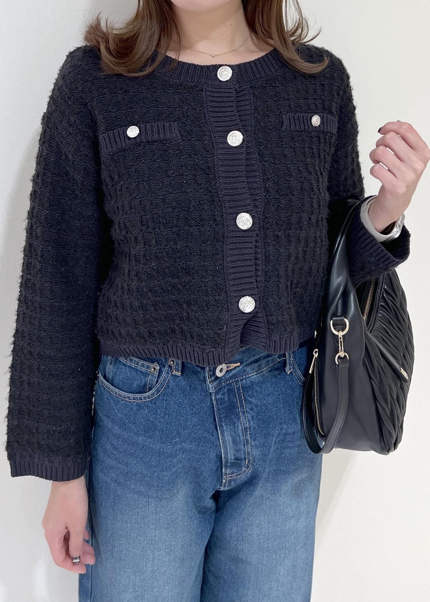 VISファンシーツイードメタルボタンカーディガンネイビー系 / F¥6,589レビューラメ入りですがザラ付きやチクチクが気にならない生地感です!インナーにロンTやシャツ、ブラウス等も重ねられるサイズ感でした。丈は腰にかかるくらいの長過ぎないのでロング丈ボトムともバランス良く着用出来ます◎