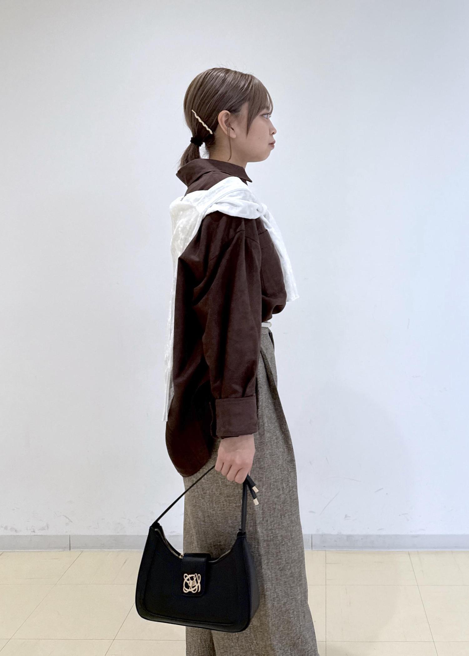 メリハリをつけるためにベルトを白にし、ベロアのTシャツを肩掛けしました◎
