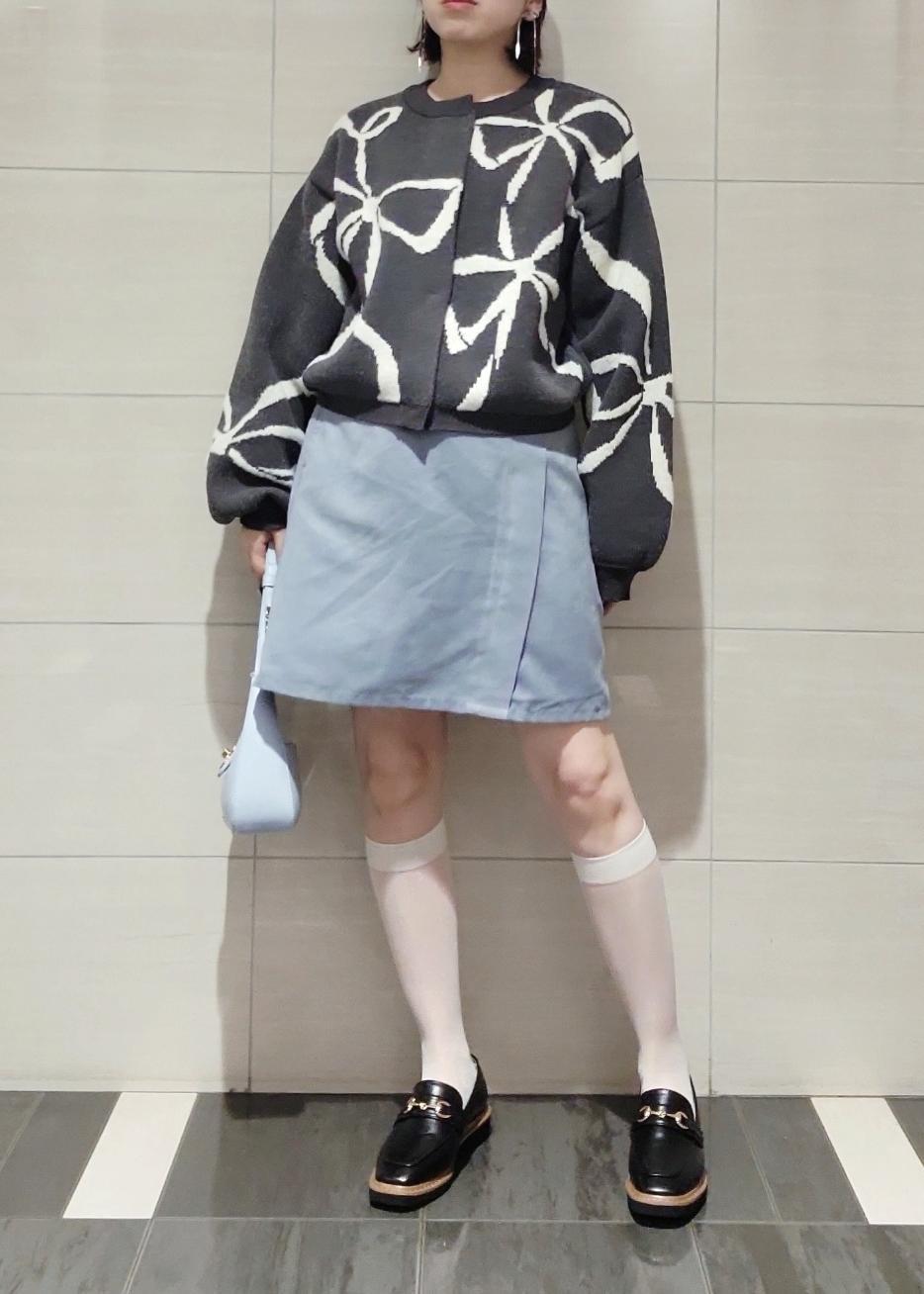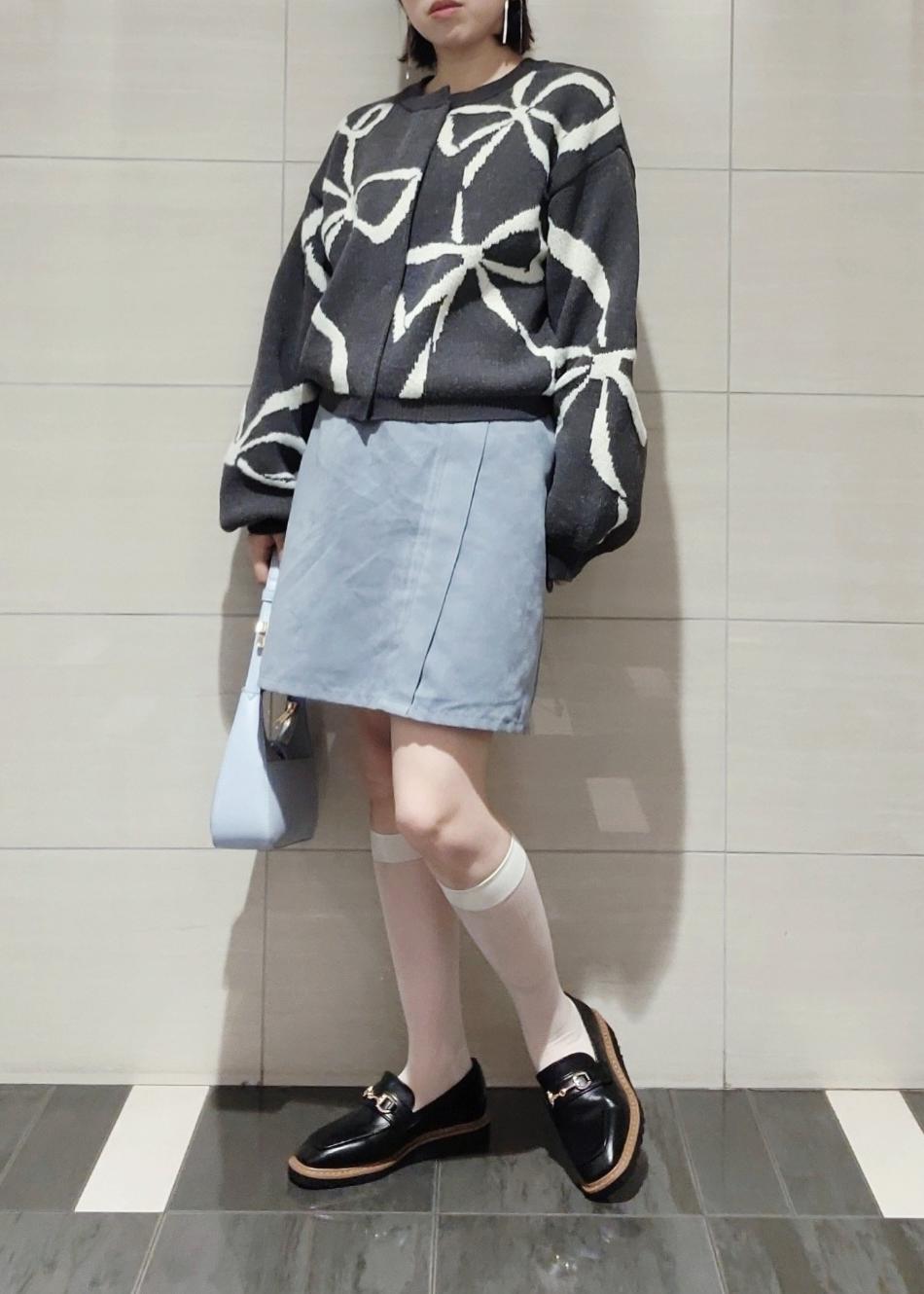 リボンモチーフのカーディガンにミニスカートを合わせてフェミニンな組み合わせにしました。甘くなりすぎないようにキャップでカジュアル感を足しました。