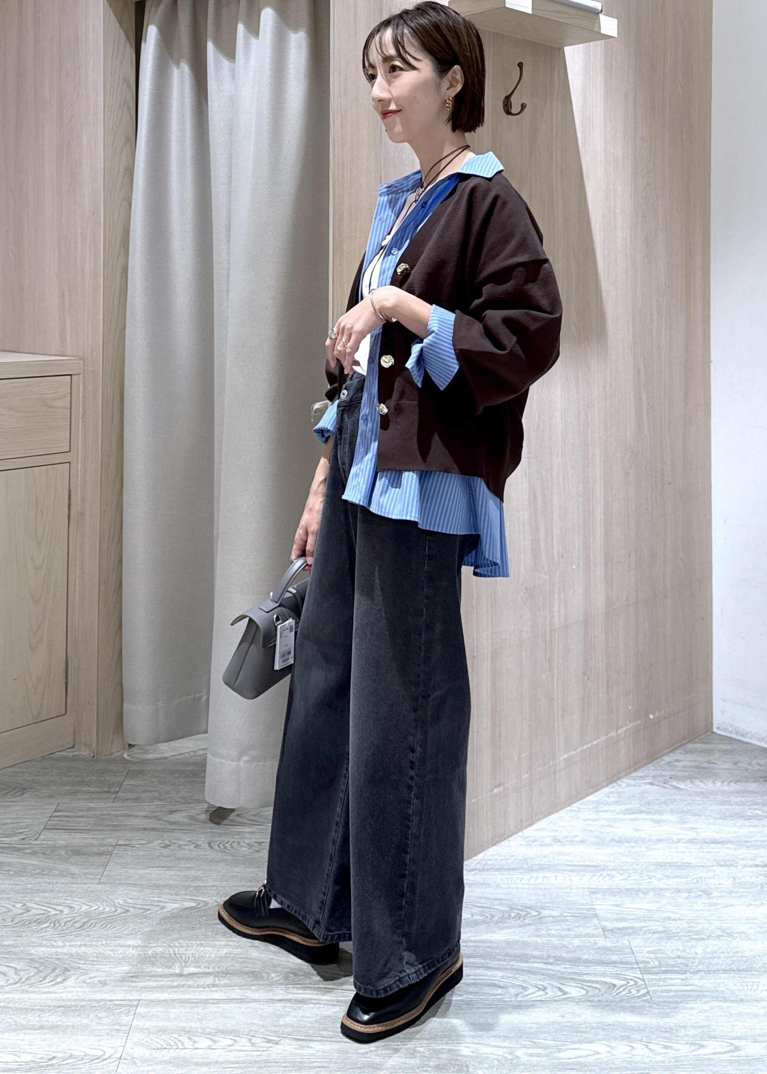 POLOのタックシャツに今年らしいブラウンのカーディガンを合わせた、アラフォーのカジュアルお出かけコーデです!