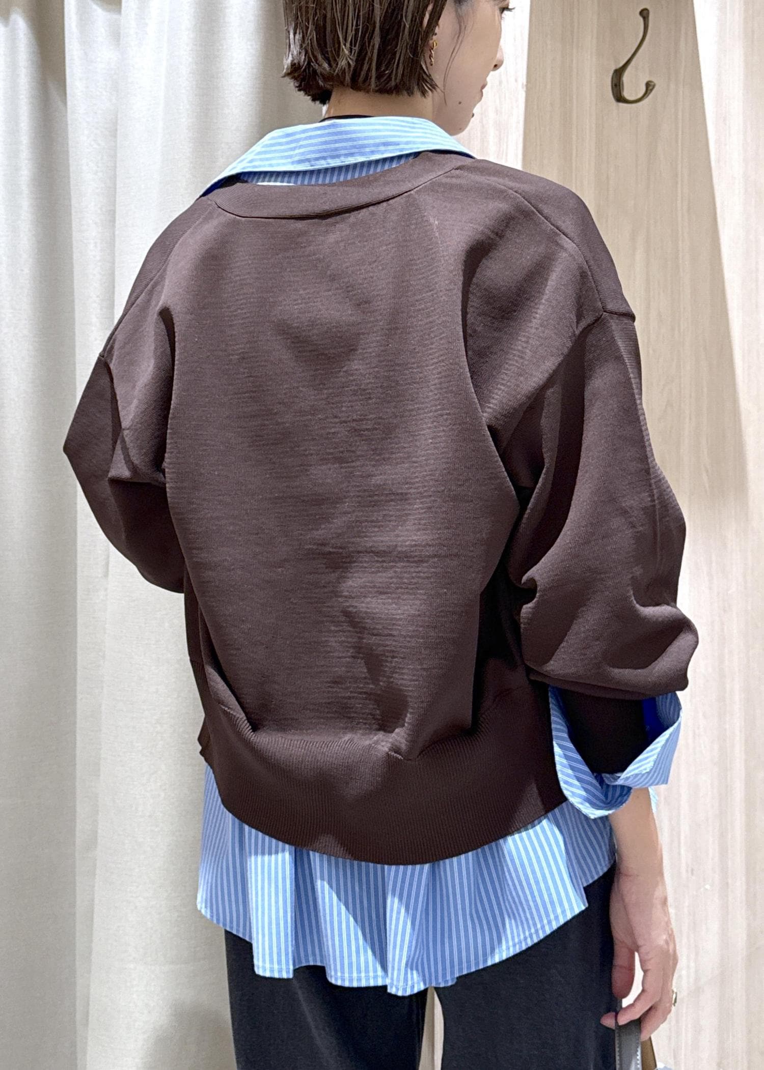 ポリエステルのサラッとした軽い素材感のカーディガンです。肩周りがゆったりとしていて、ルーズに着こなせる深めのVネックデザイン!