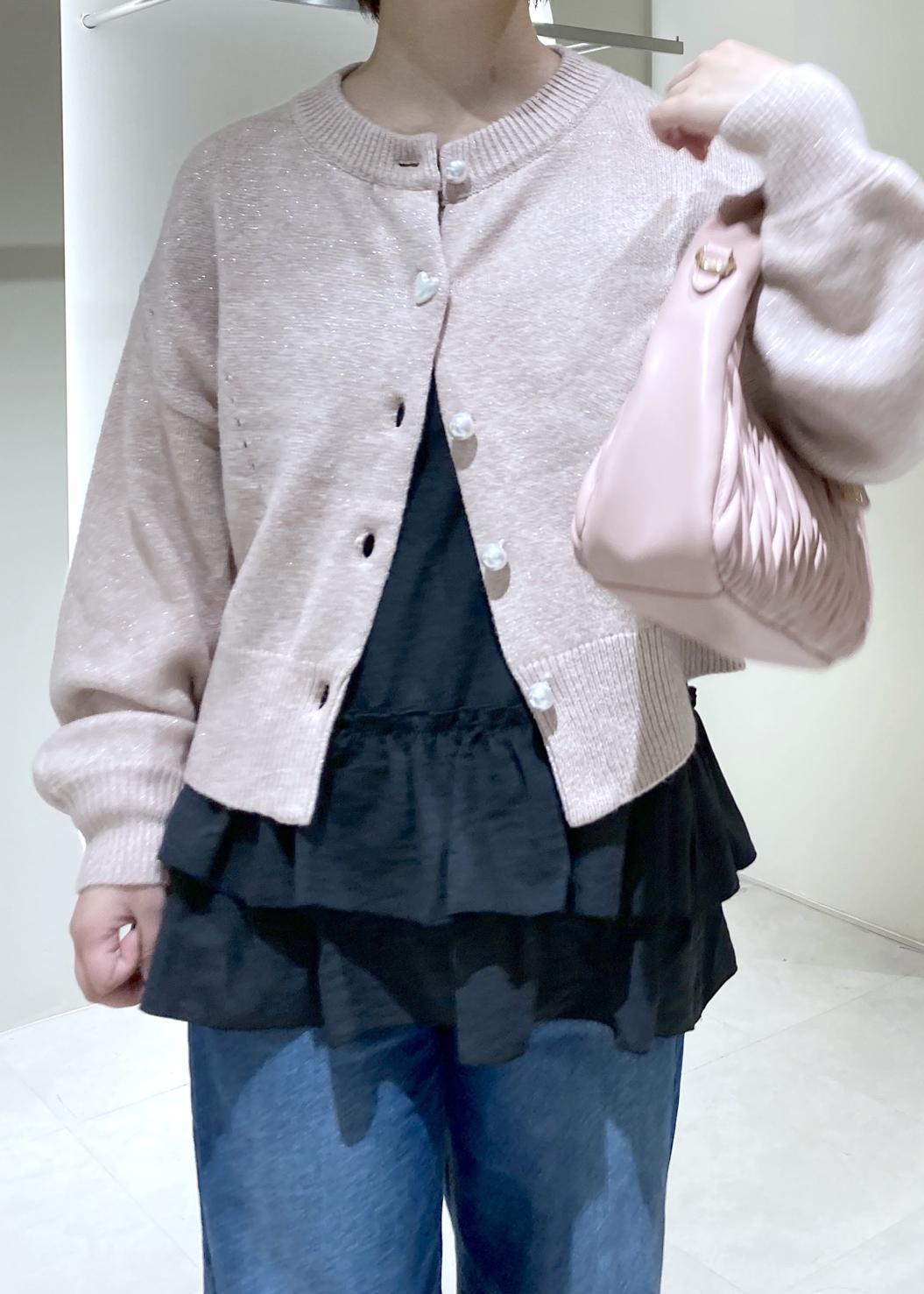 VISハートアソートパール釦ラメミックスカーディガン/イージーケア・一部WEB限定カラーピンク系 / F¥5,489レビュー155cmで腰上くらいの丈感で、パンツともスカートとも合わせすい丈感です。
