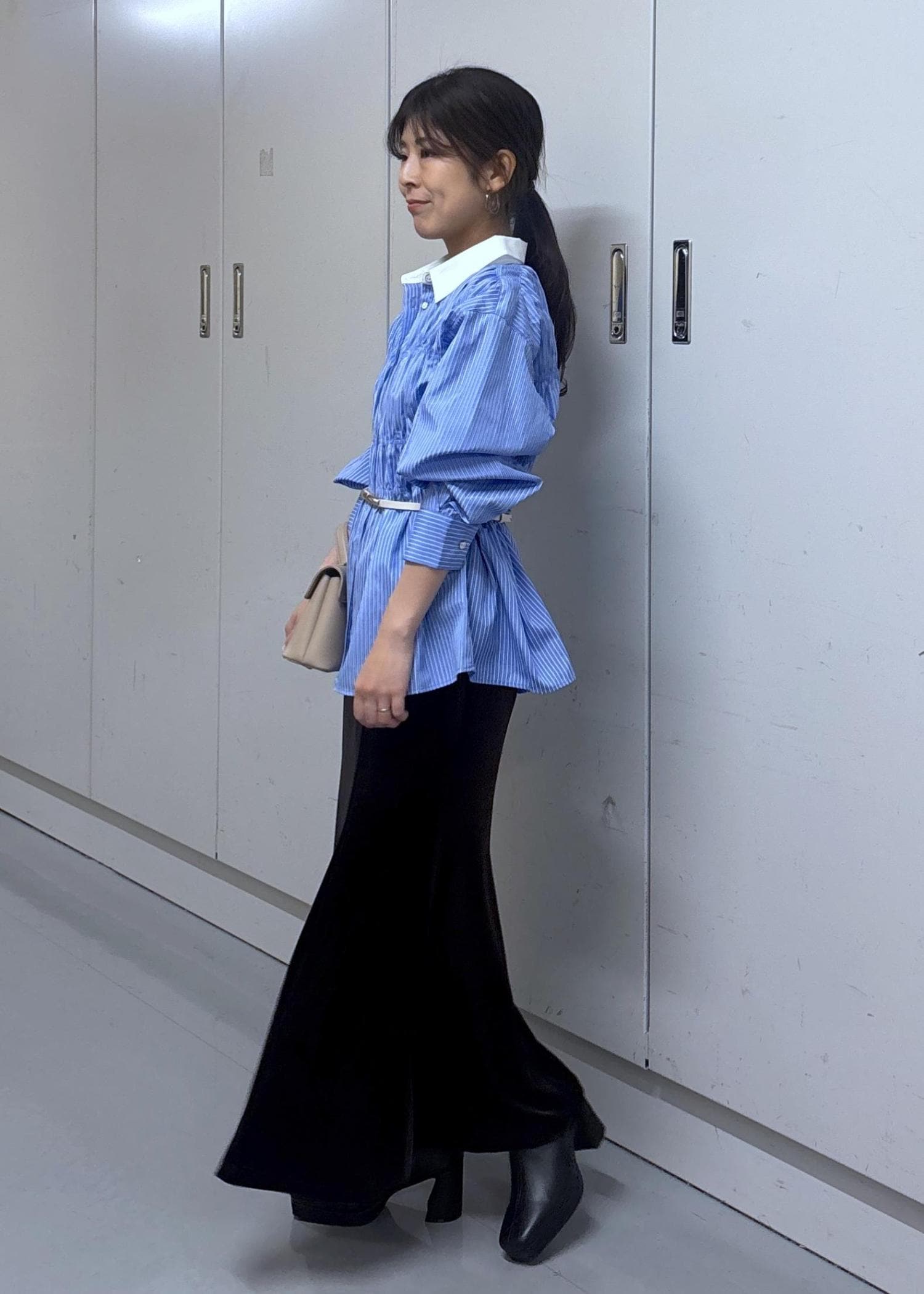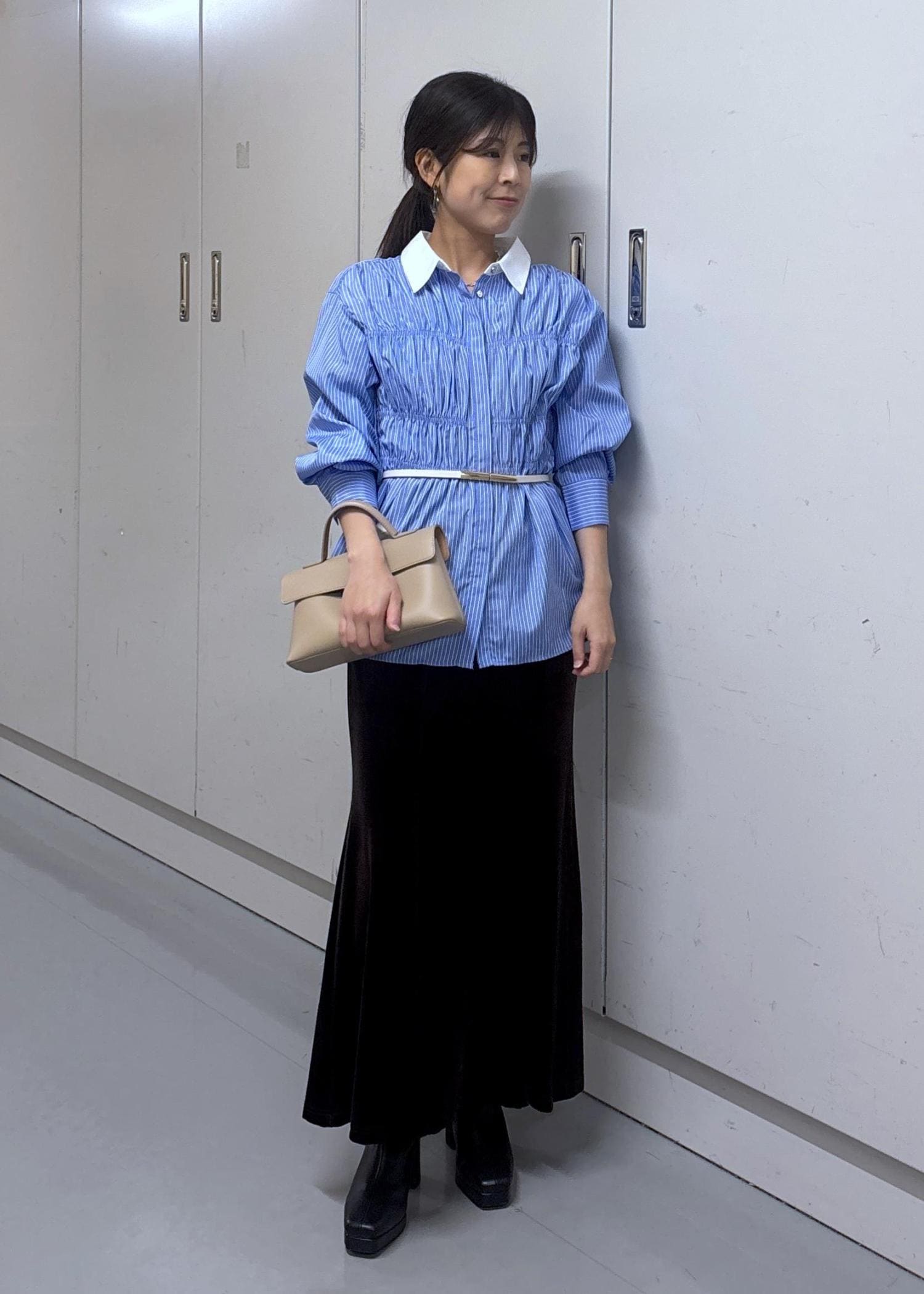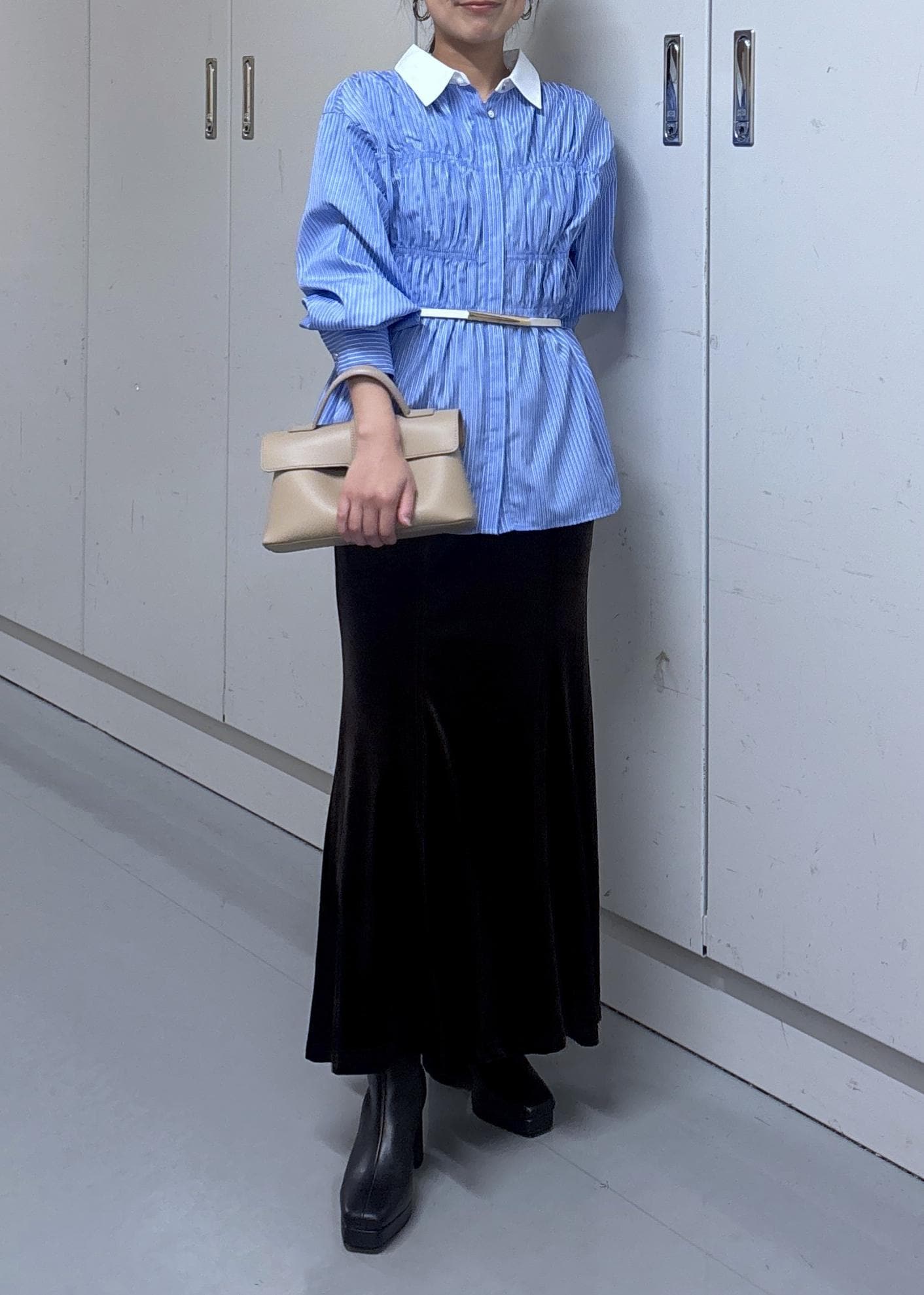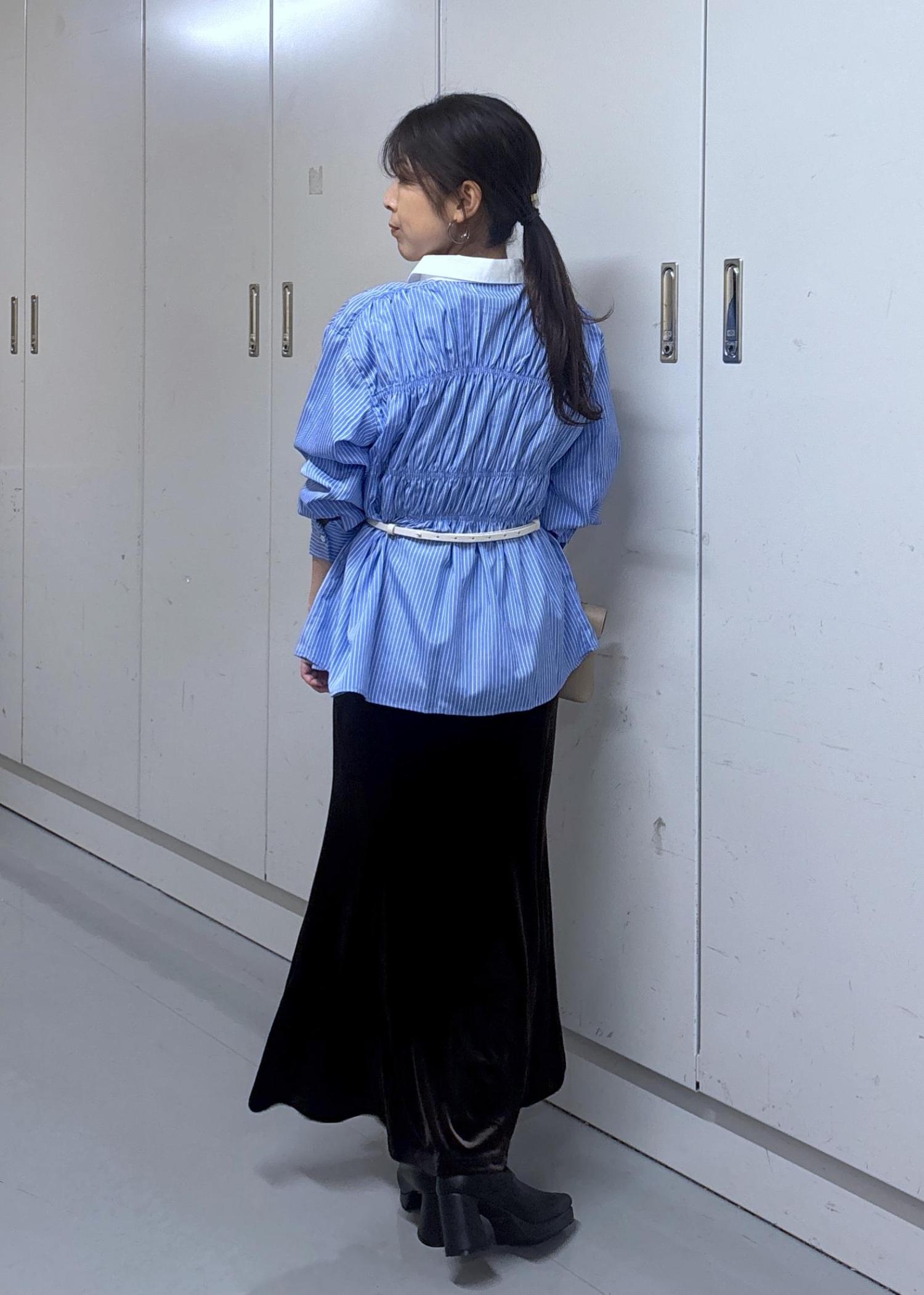 VISシャーリングデザインシャツブルー系 / F¥5,489レビュー156cm/F着用。着丈はおしりが半分隠れる長さです。ハリはある素材ですが、薄手なのでニットやスウェットのトップスと合わせて着ることも◎ギャザーデザインでカジュアルな雰囲気ですが襟があるのでキチンと見えもできます!