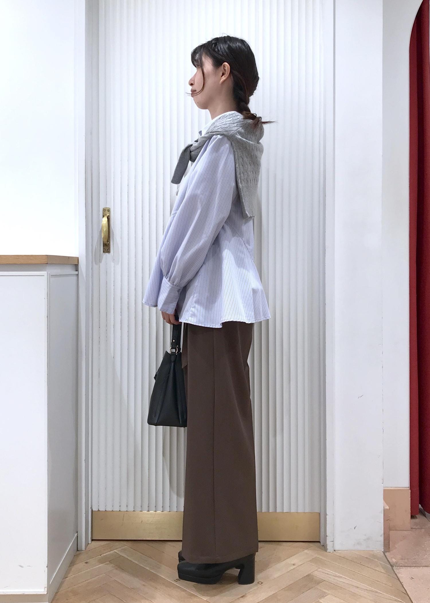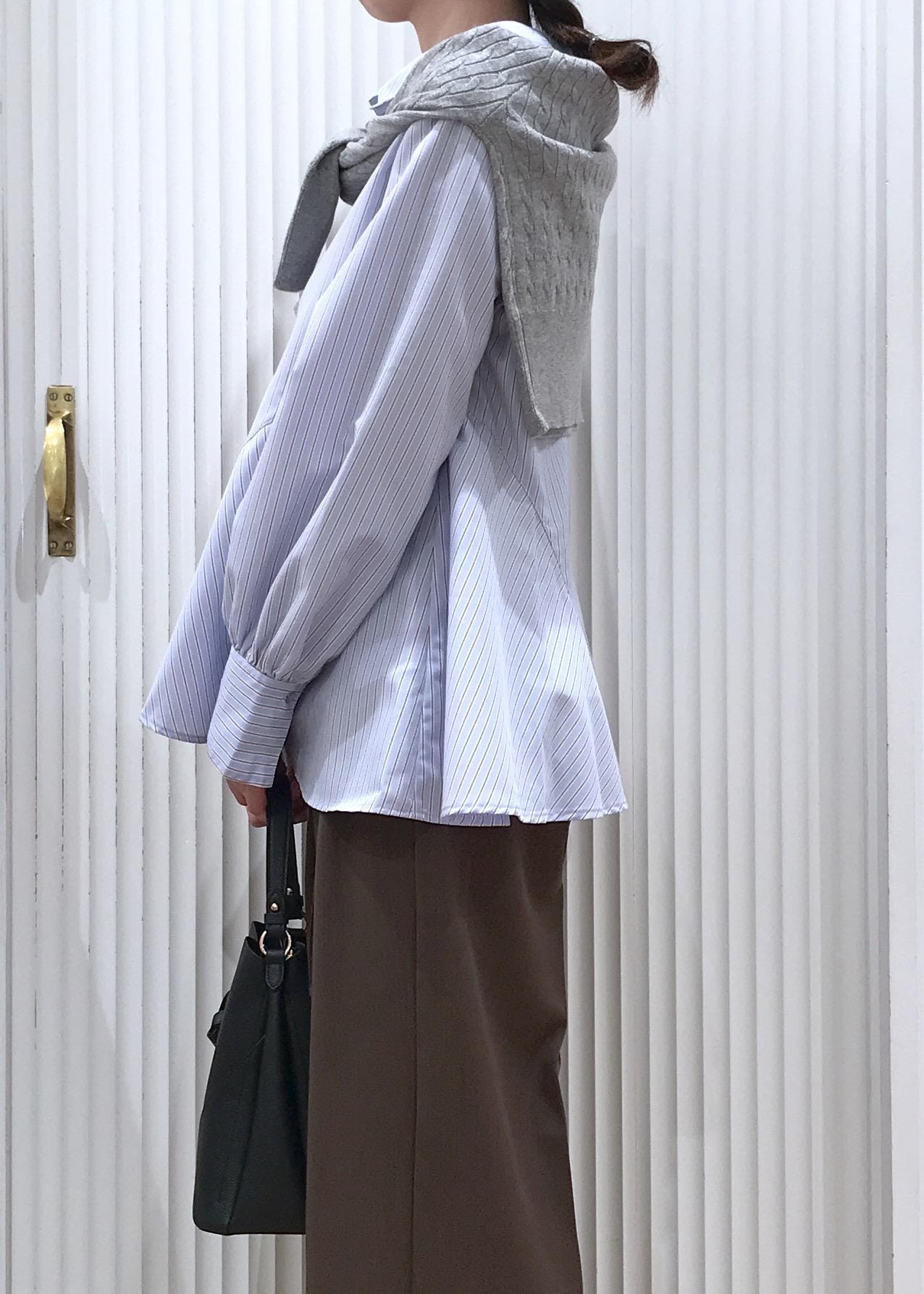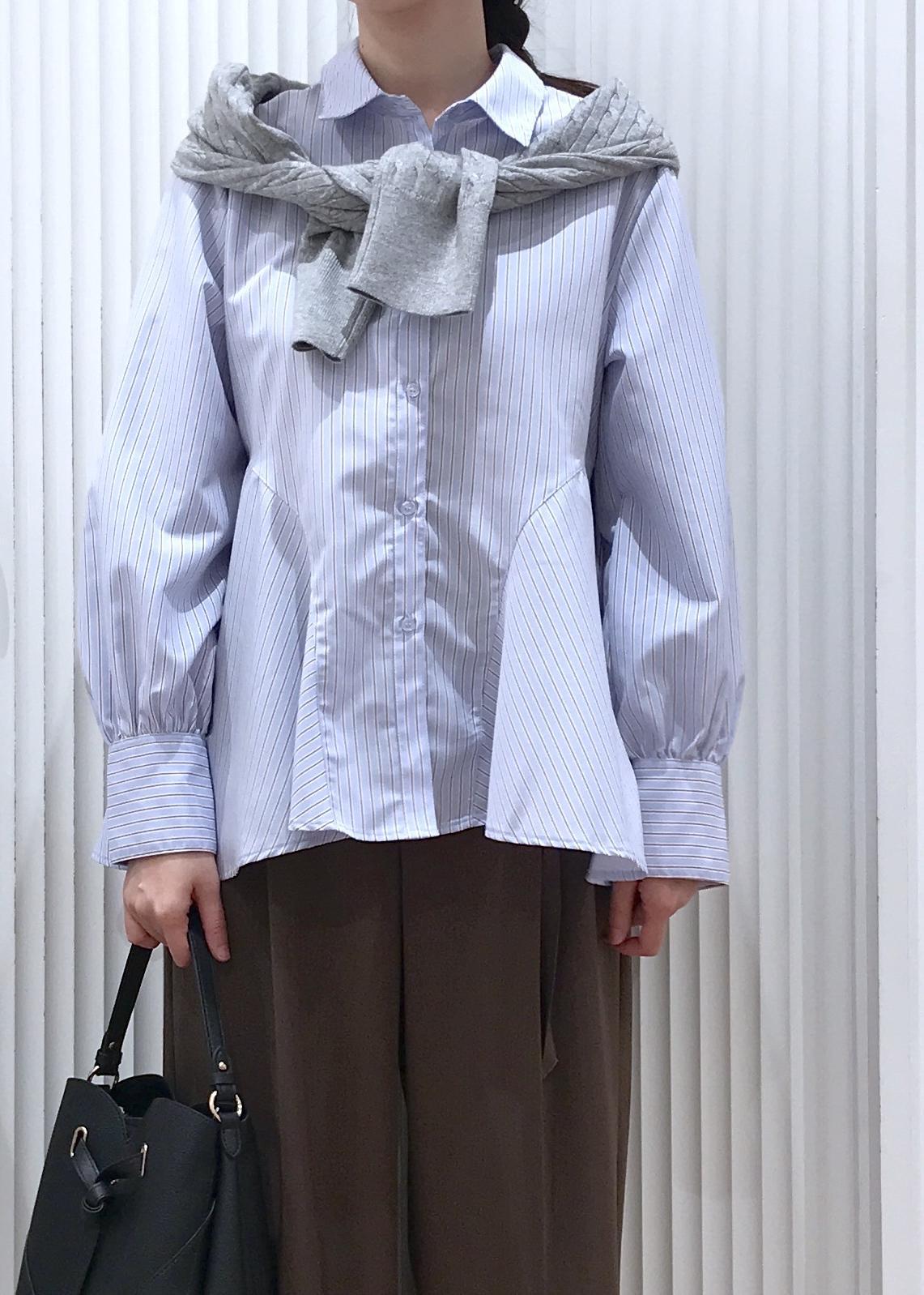 ストライプがかわいいヘムデザインシャツのキレイ目コーデです。