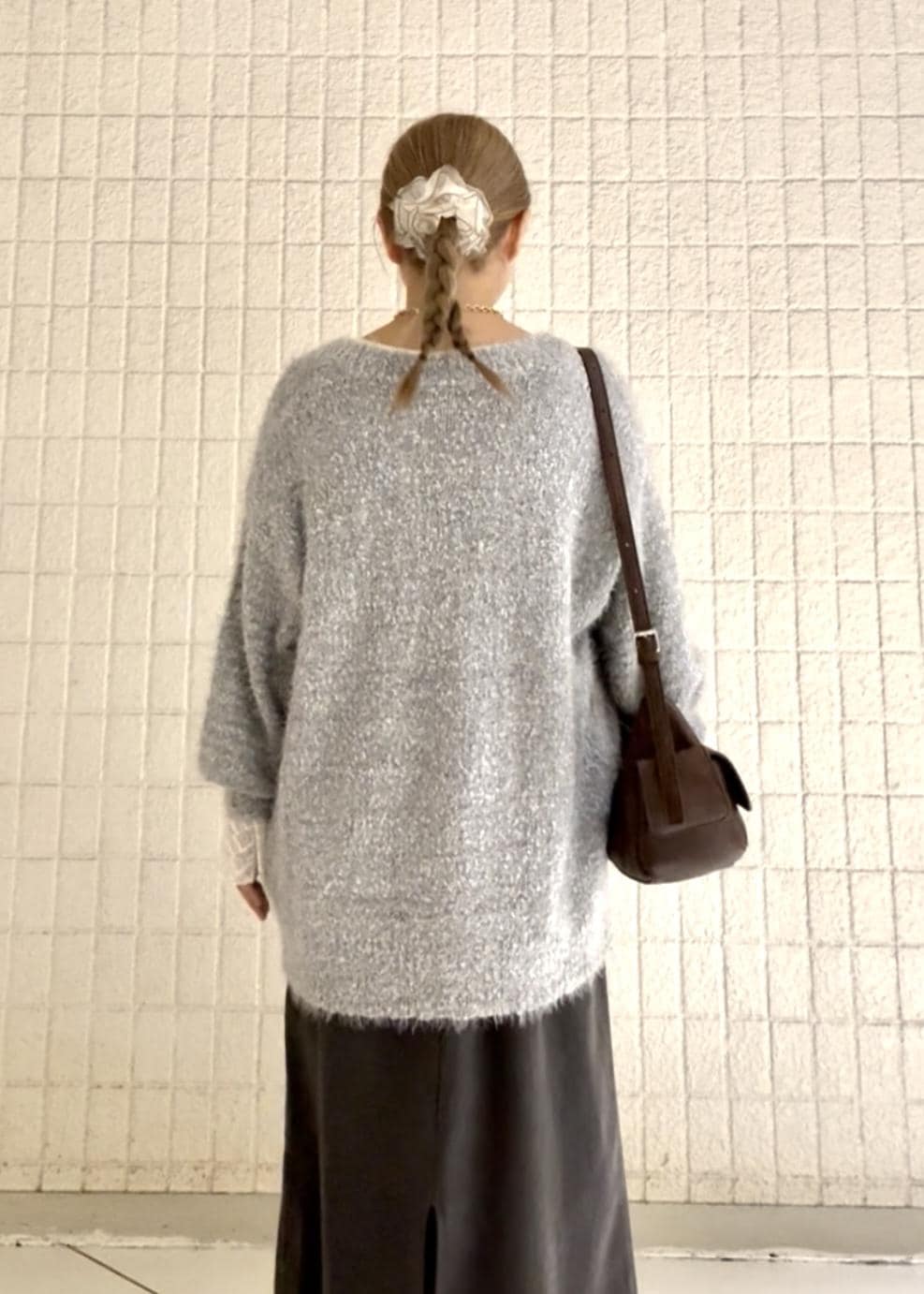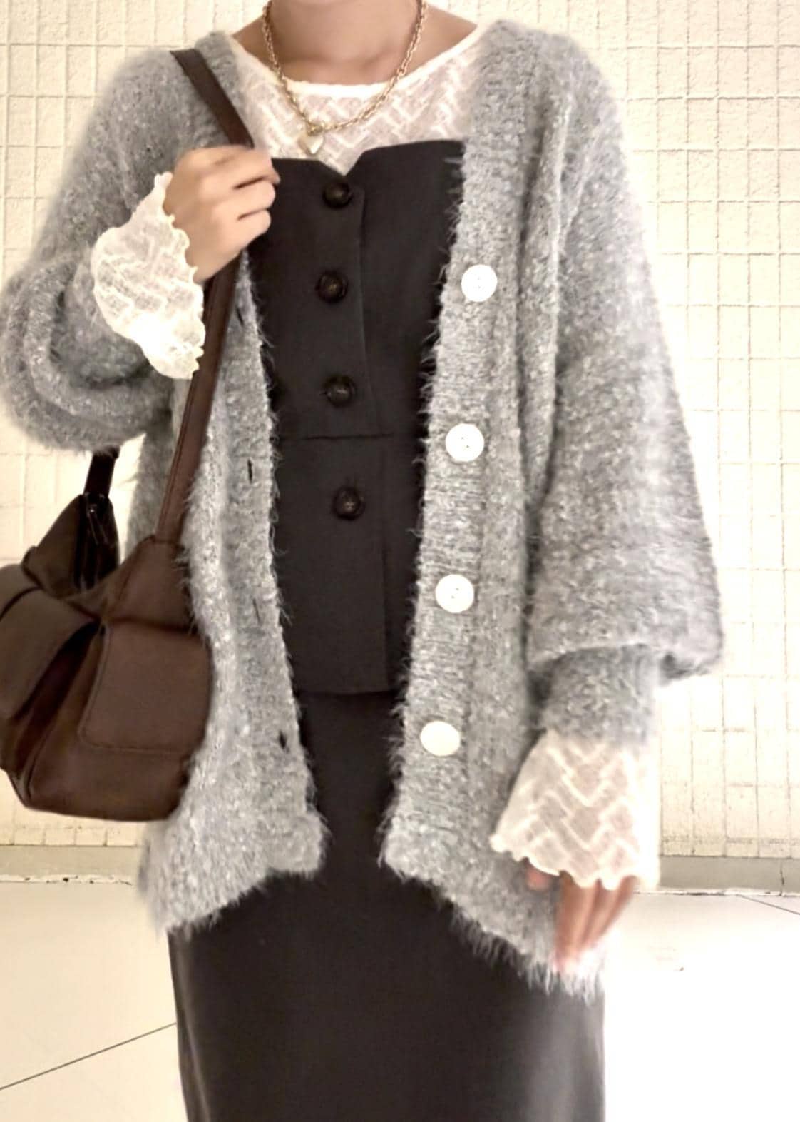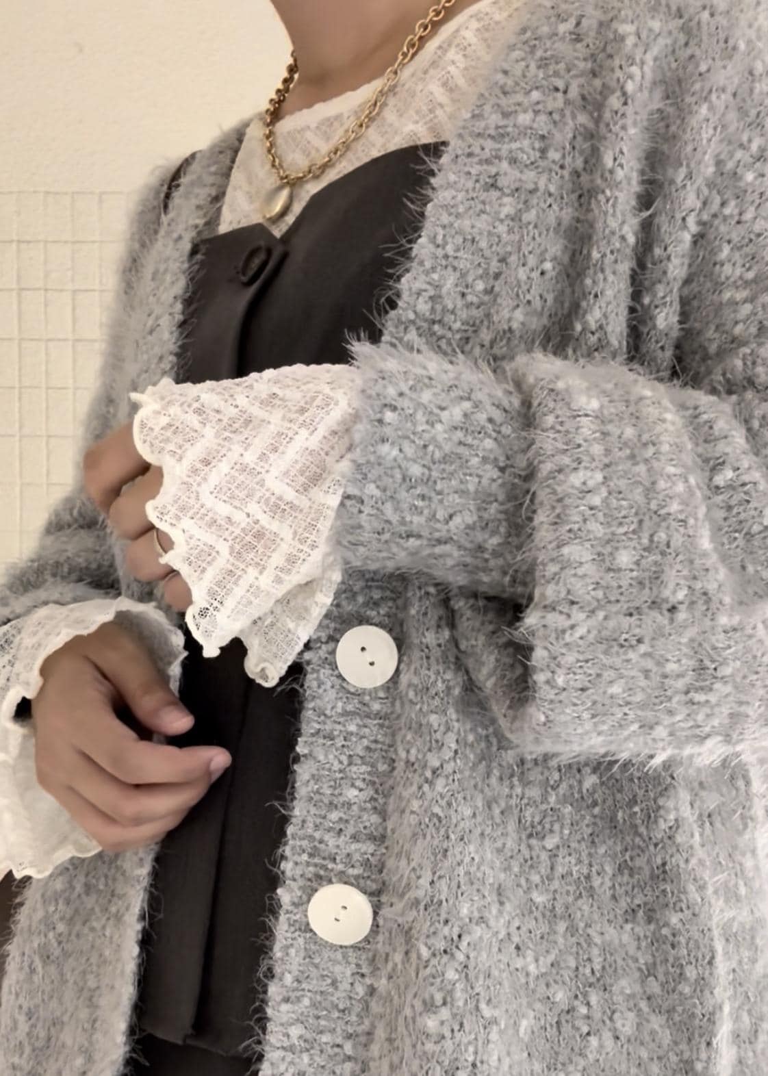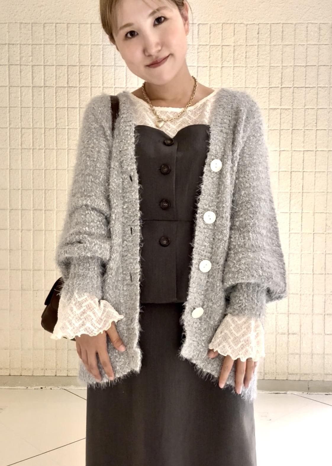 VISポップコーンヤーンラメフェザーニットカーディガン/WEB限定FSサイズライトグレー / F¥5,271レビュー152cmで腰下くらいの長めの着丈です。