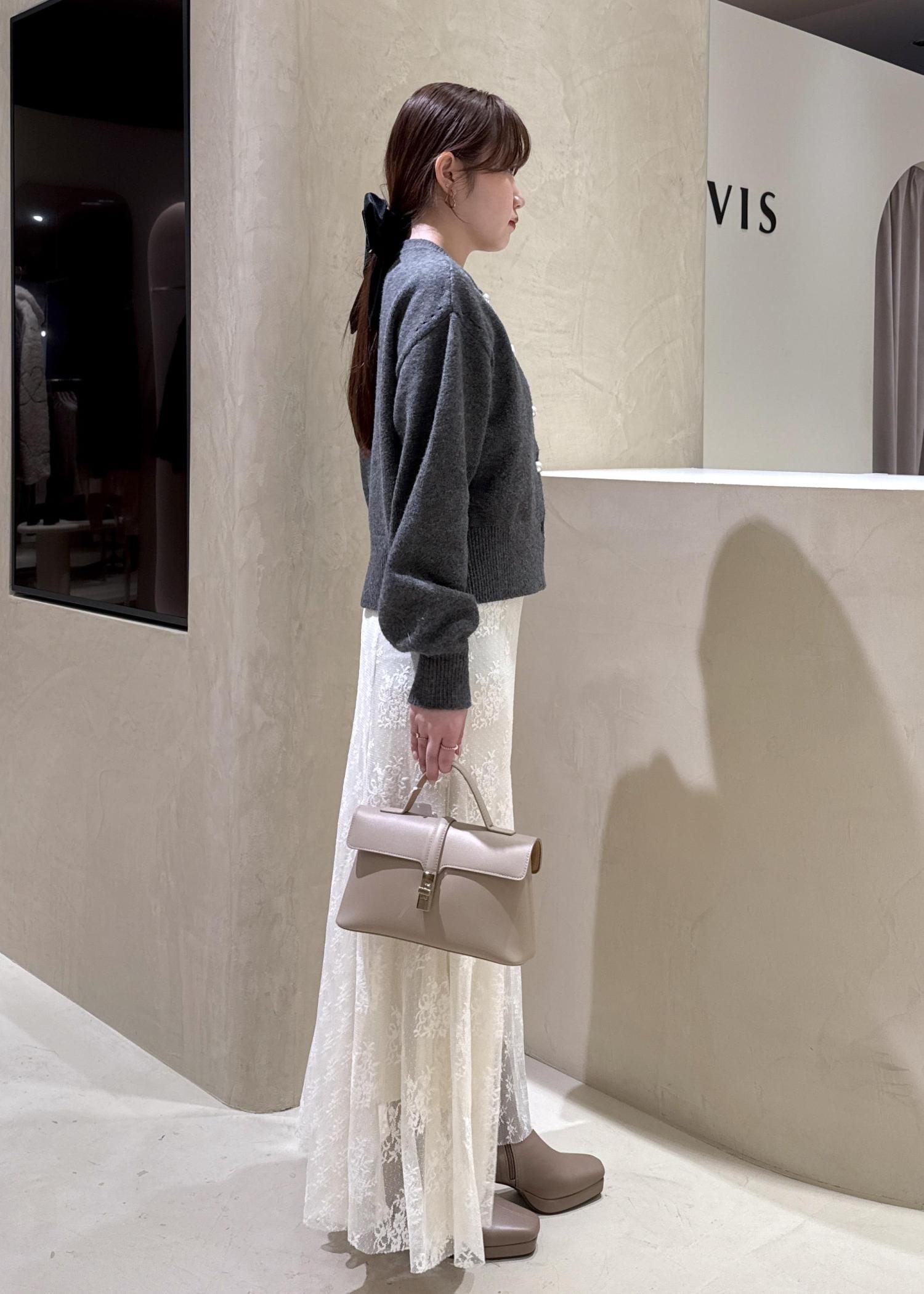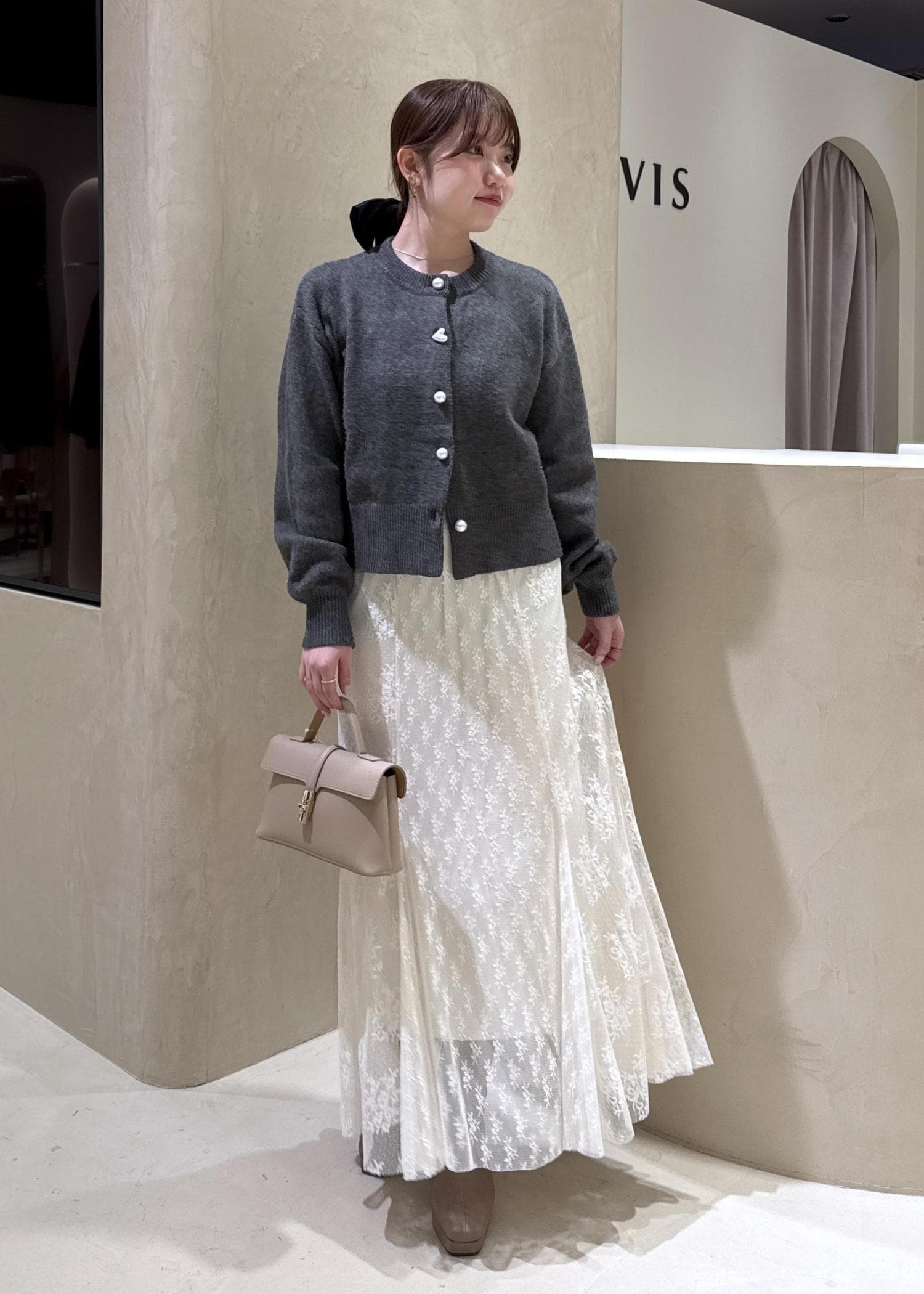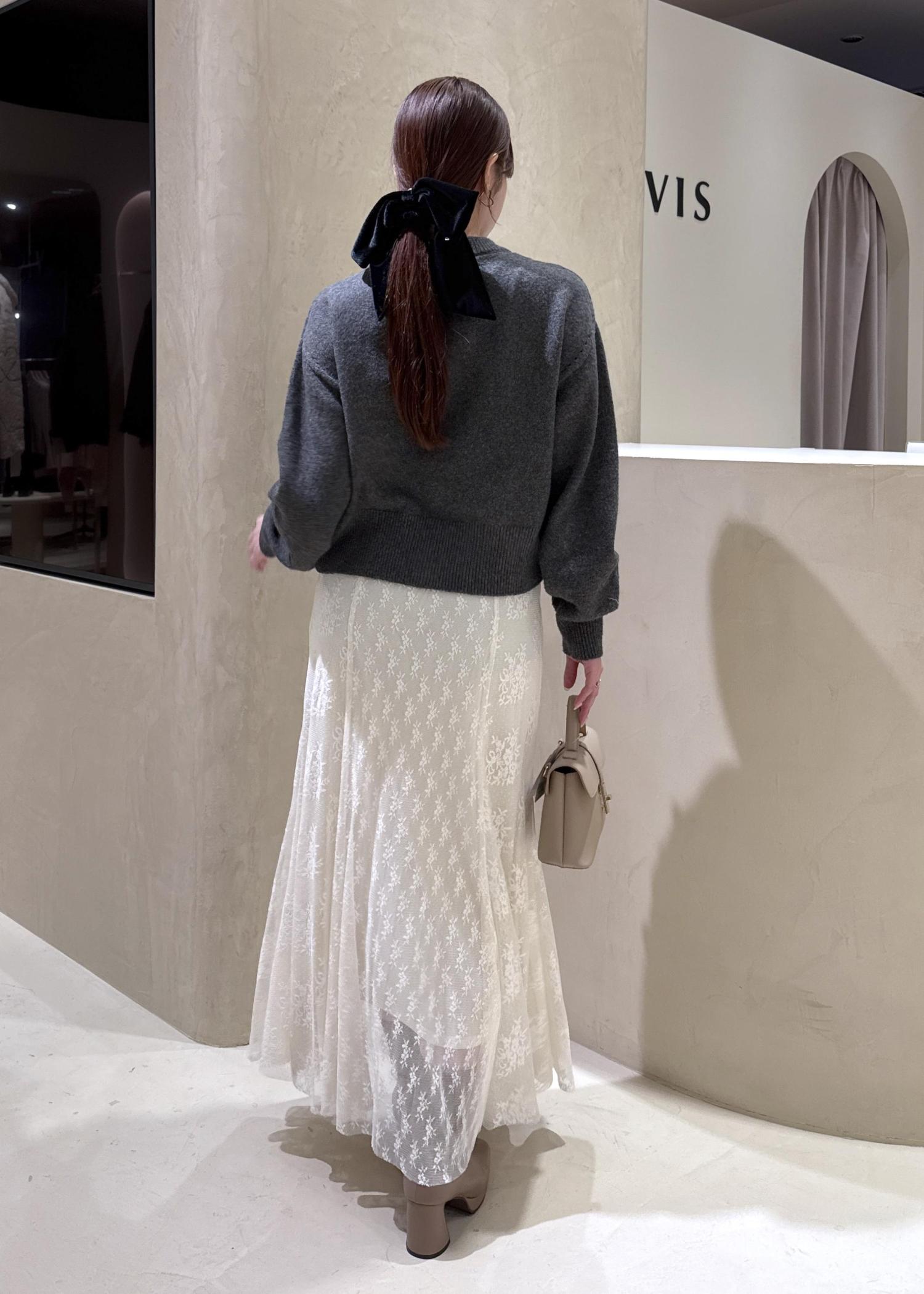 落ち着いたカラーでまとめつつ、パールのボタンがポイントのカーディガンやレースのスカートで女性らしいフェミニンな印象に♡ ヘアカフのベロアリボンもポイントに!