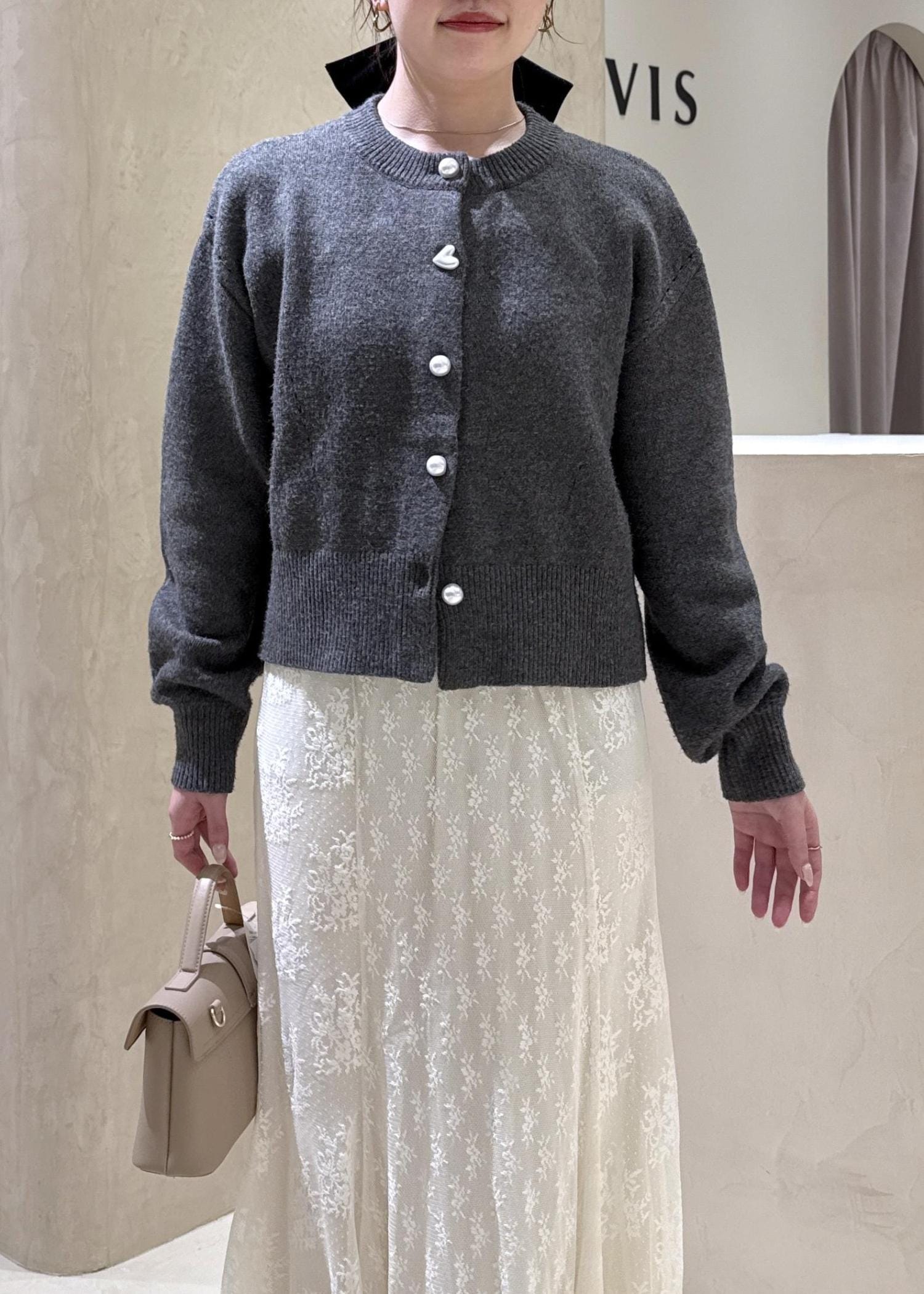 VISハートアソートパール釦ラメミックスカーディガン/イージーケア・一部WEB限定カラーチャコール / F¥5,489レビュー身長158cmで、着丈はウエストが隠れる丈感。