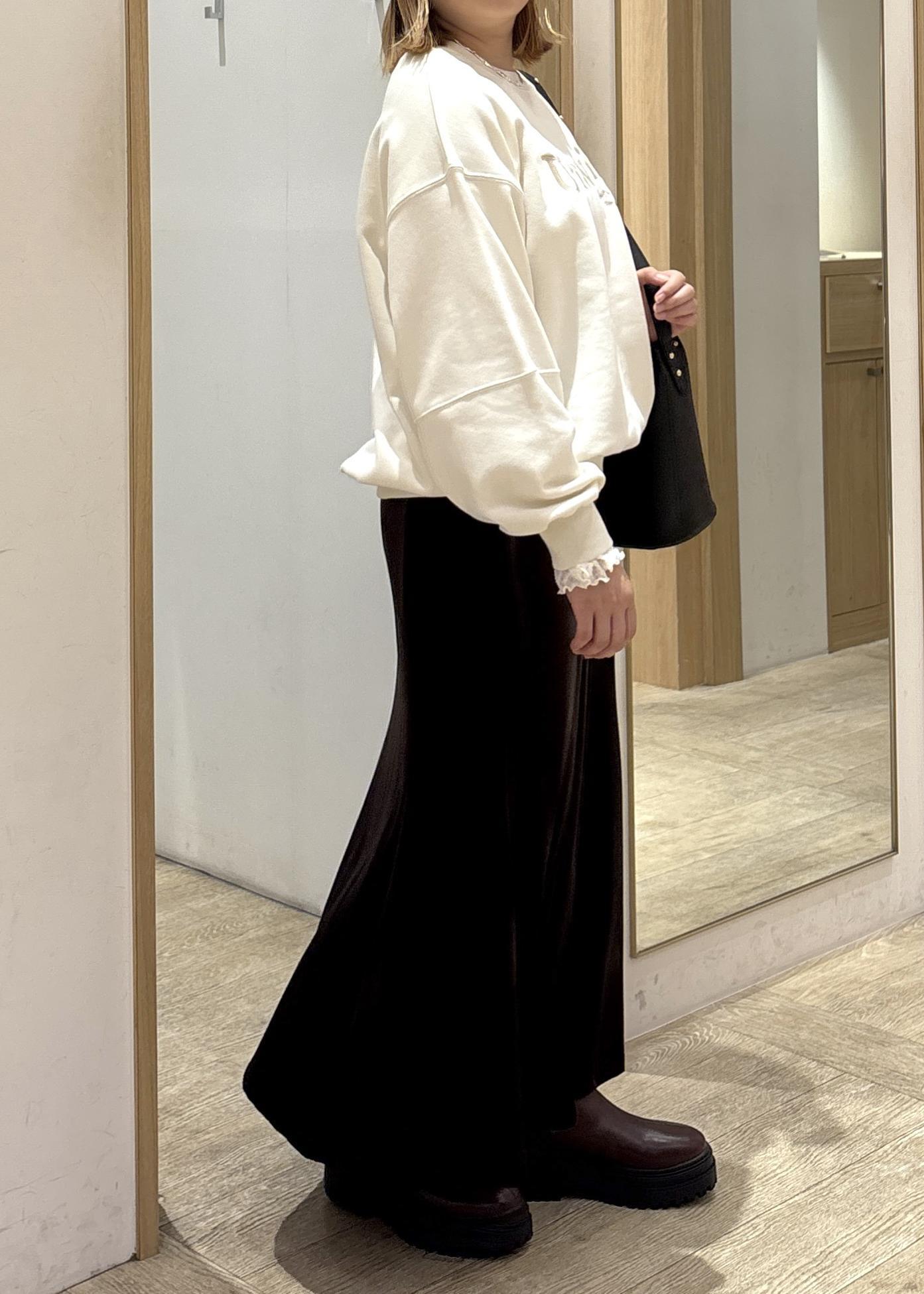 ウエストがゴムなので脱ぎ着もしやすく、どんなスタイルの方にも綺麗に履いていただけるシルエットです!