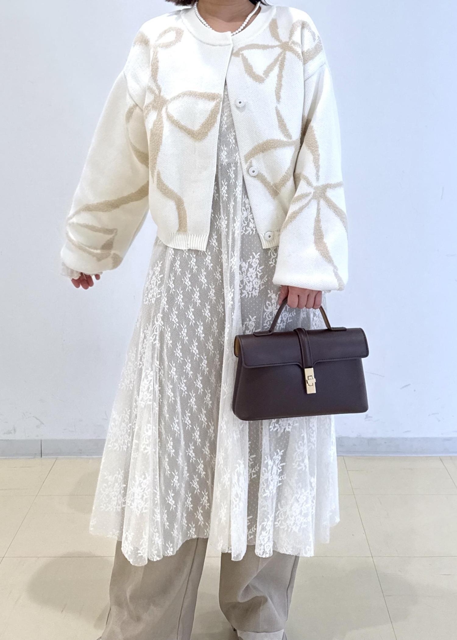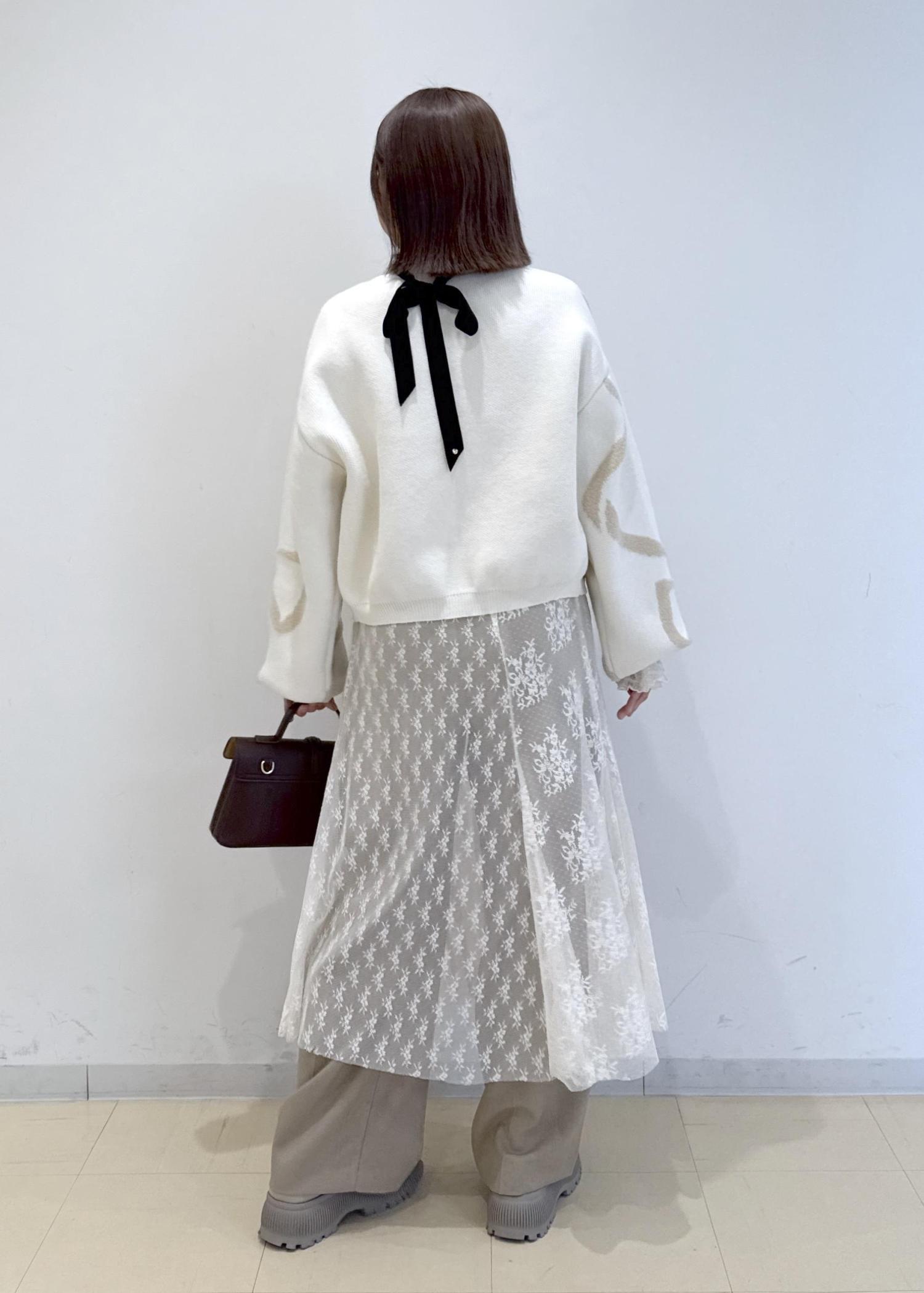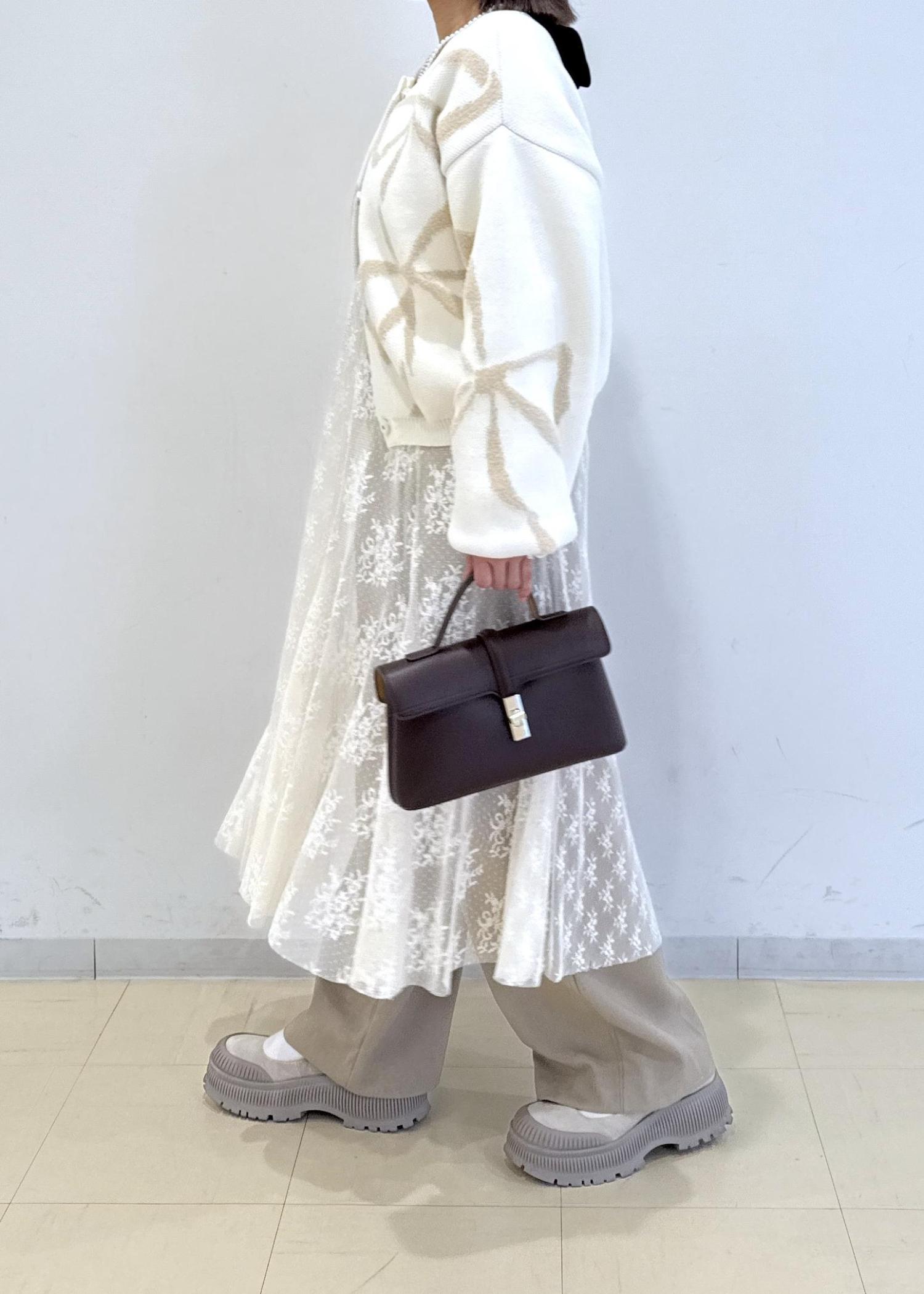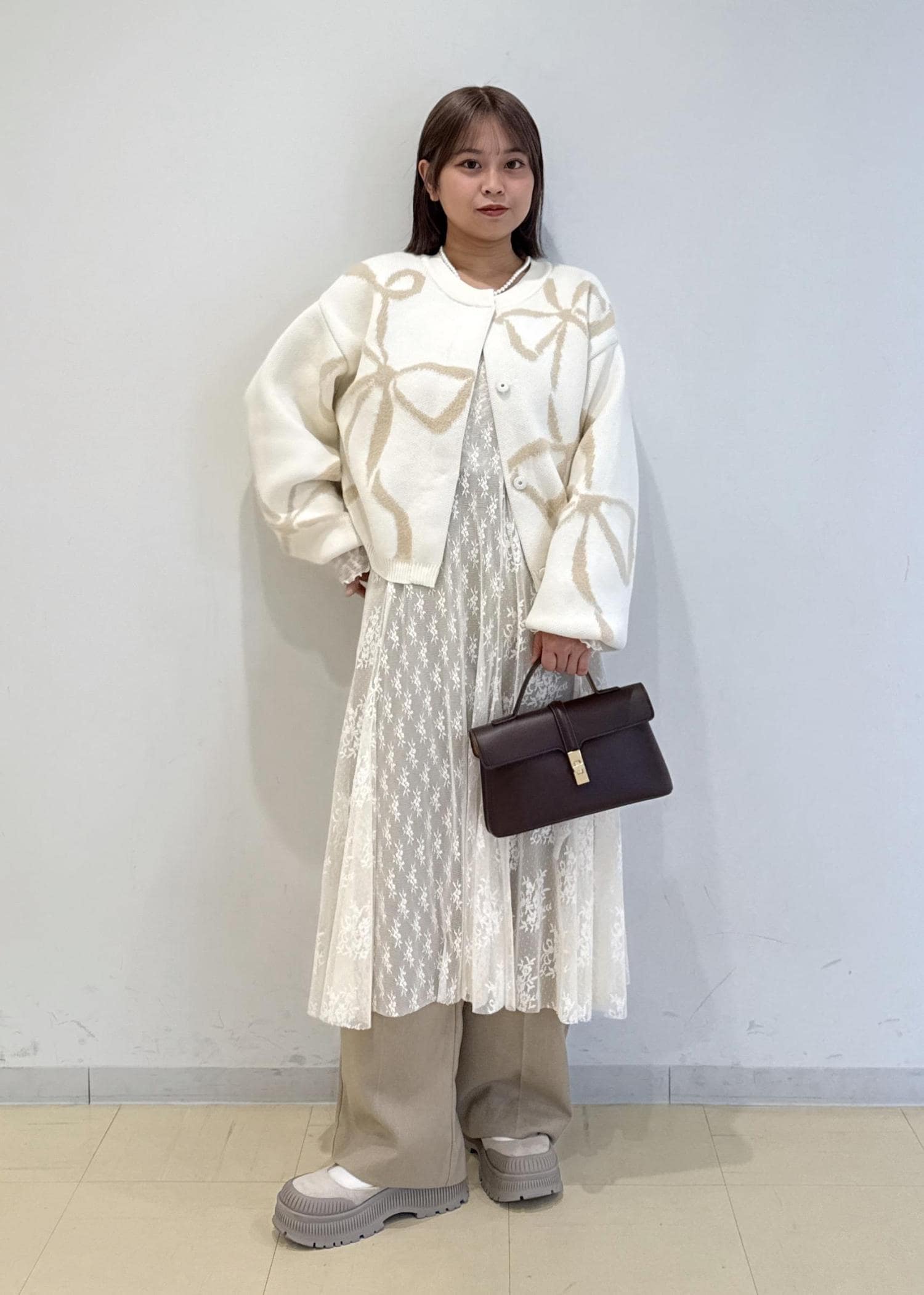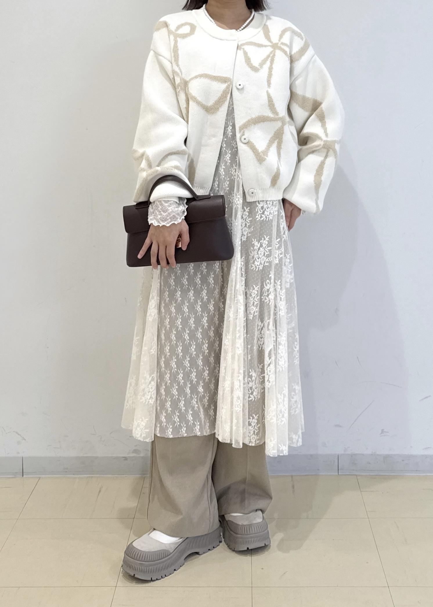 リボンのカーディガンにレースのスカートを合わせた甘めのコーディネートなのでパンツをレイヤーし、程よくかっこよさをプラスすることで甘すぎないコーディネートにしました。
