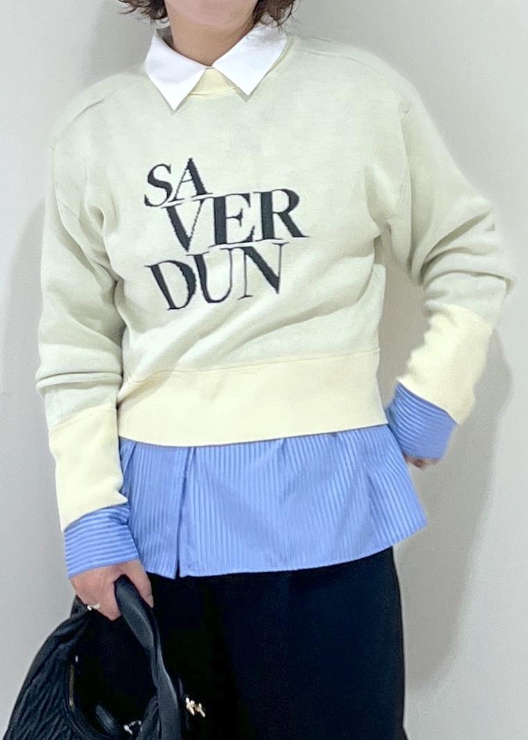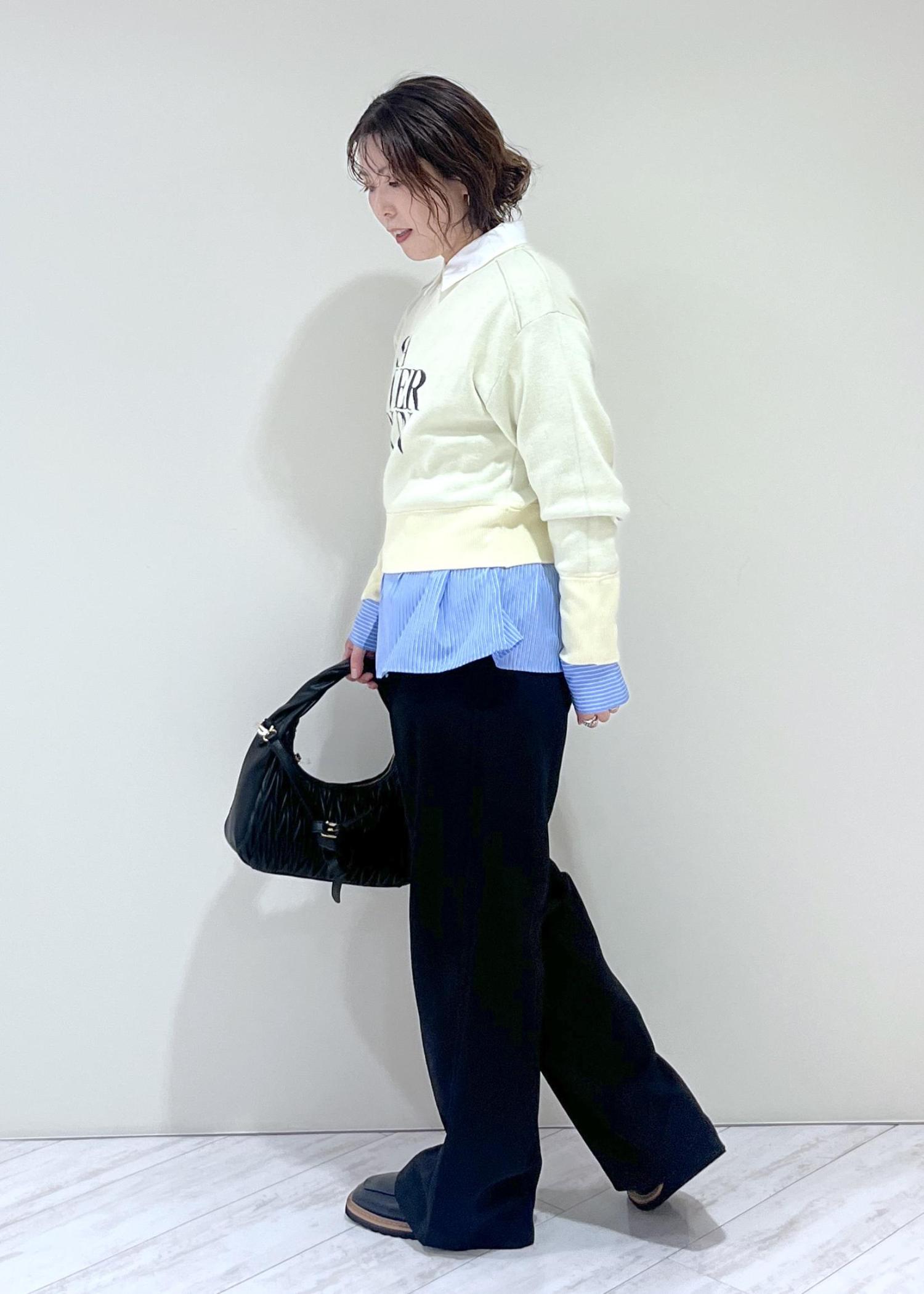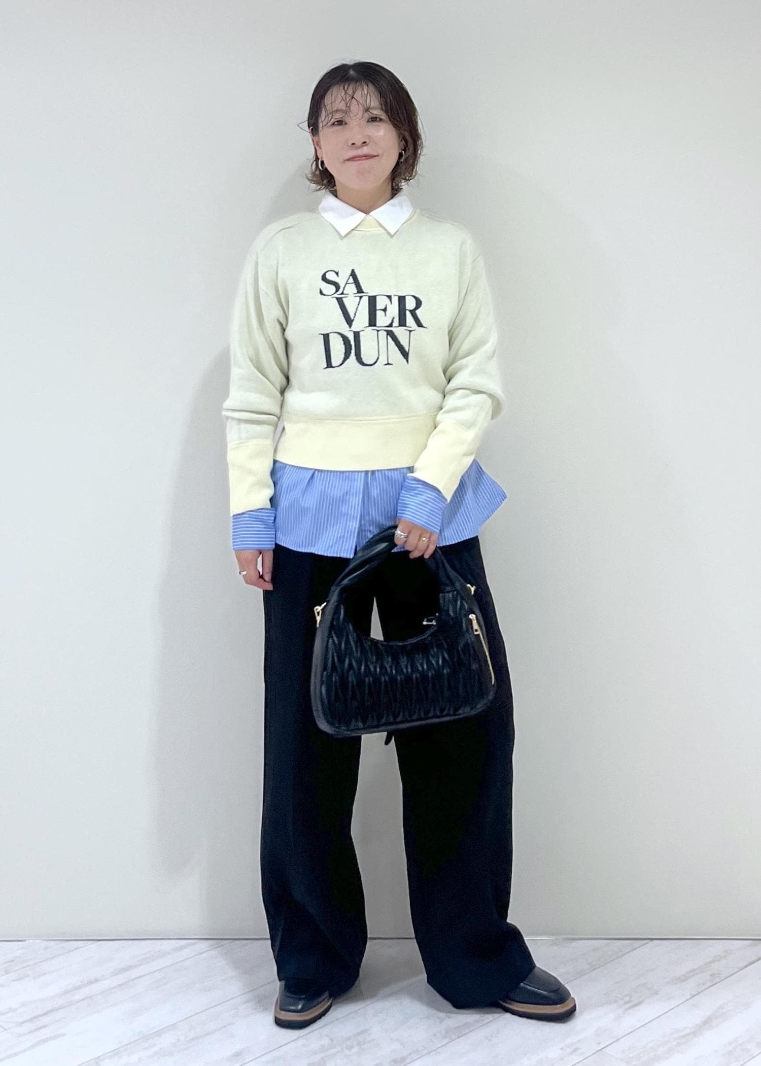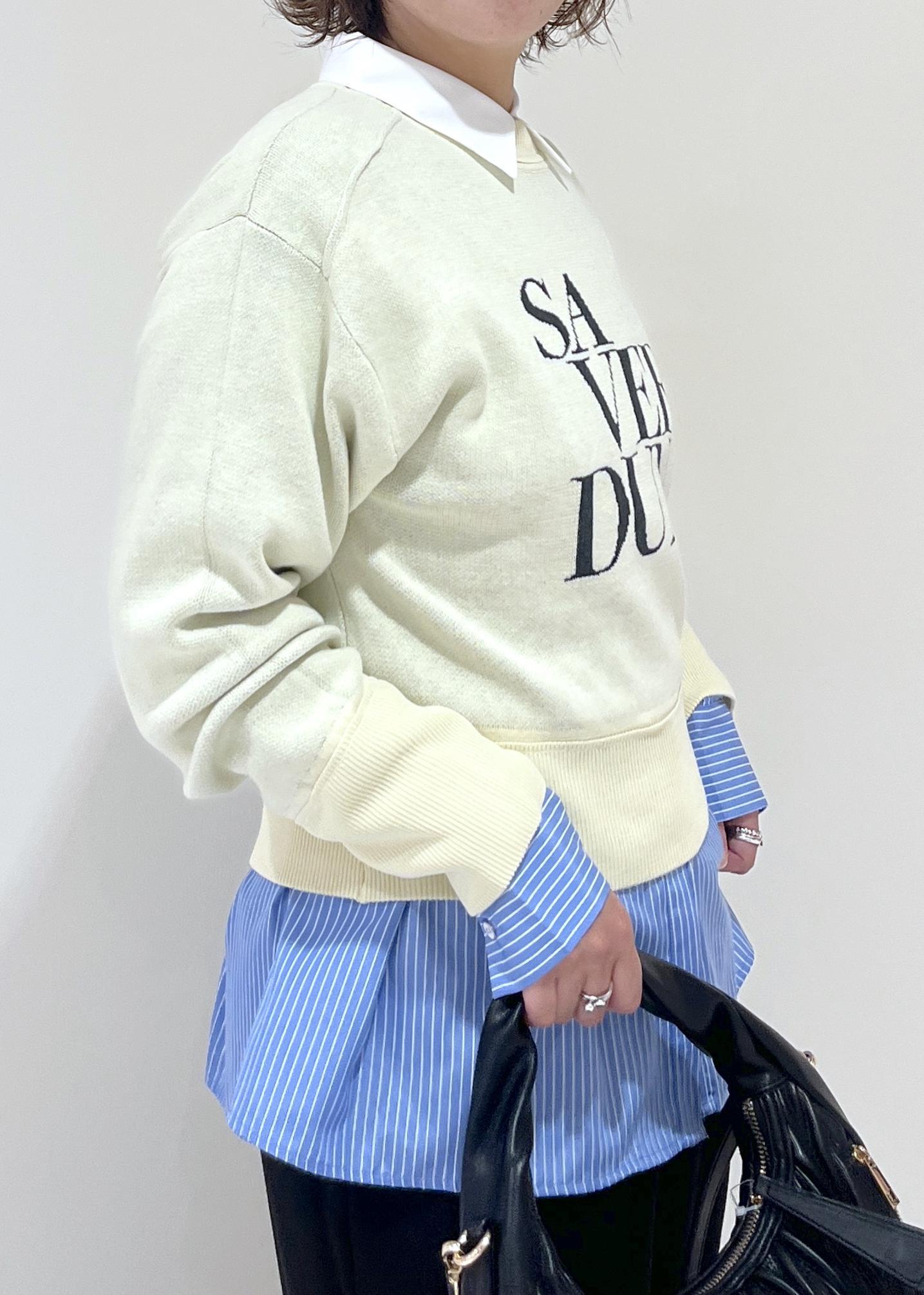 大きめなロゴとイエローが目に止まるスウェットライクなニットにシャツをレイヤードしてオシャレ度アップ!