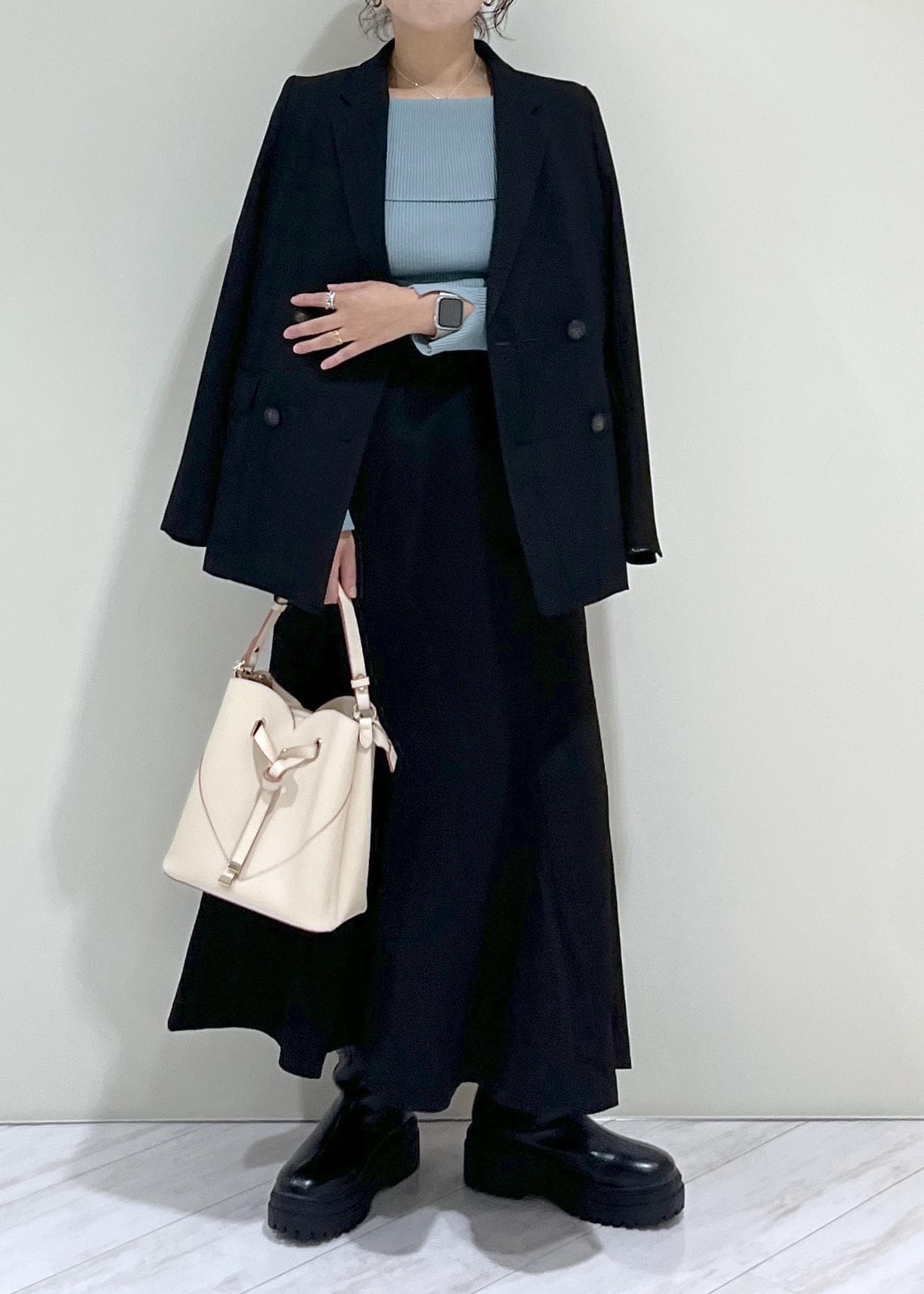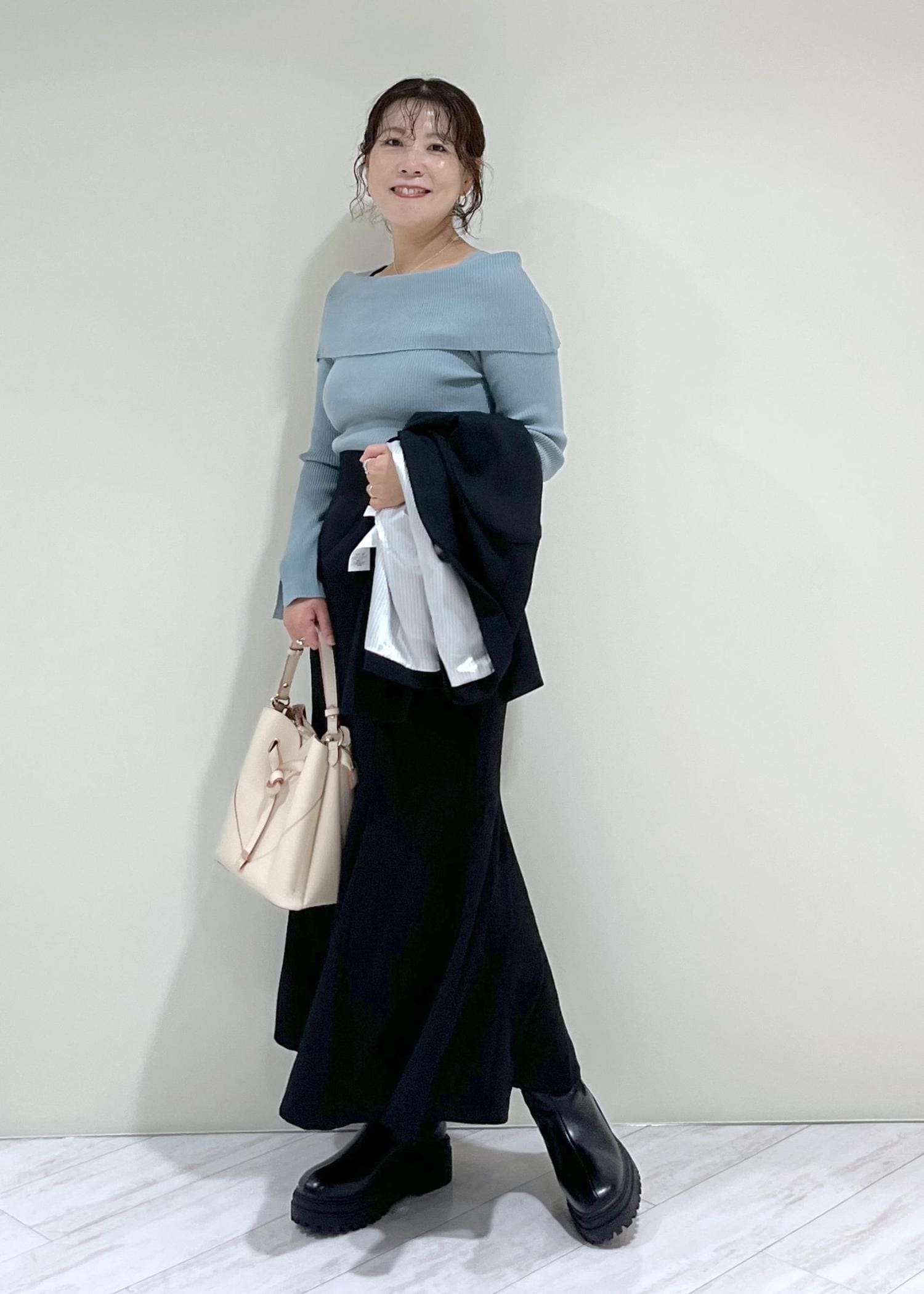 肩のサイズはジャストで、ヒップライン隠れる着丈です。程よくゆとりがあり、リブニットなどを合わせても◎