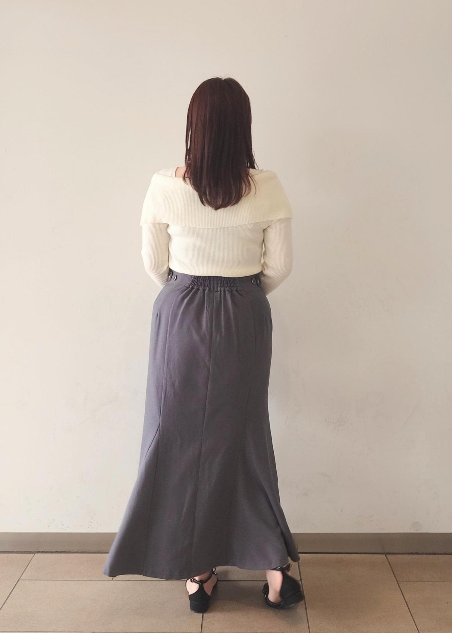 薄手のトップスや、ウエストインしない時はボタンを締めて着たりと、体型やインナーによってウエスト調節ができるのポイントです。 -