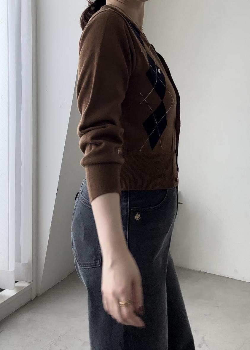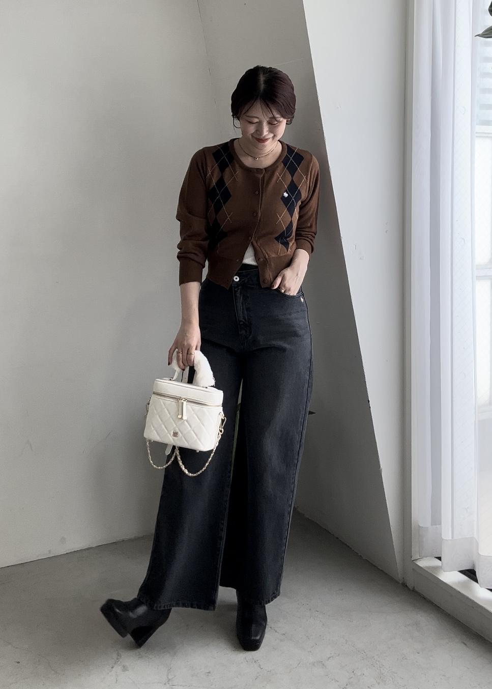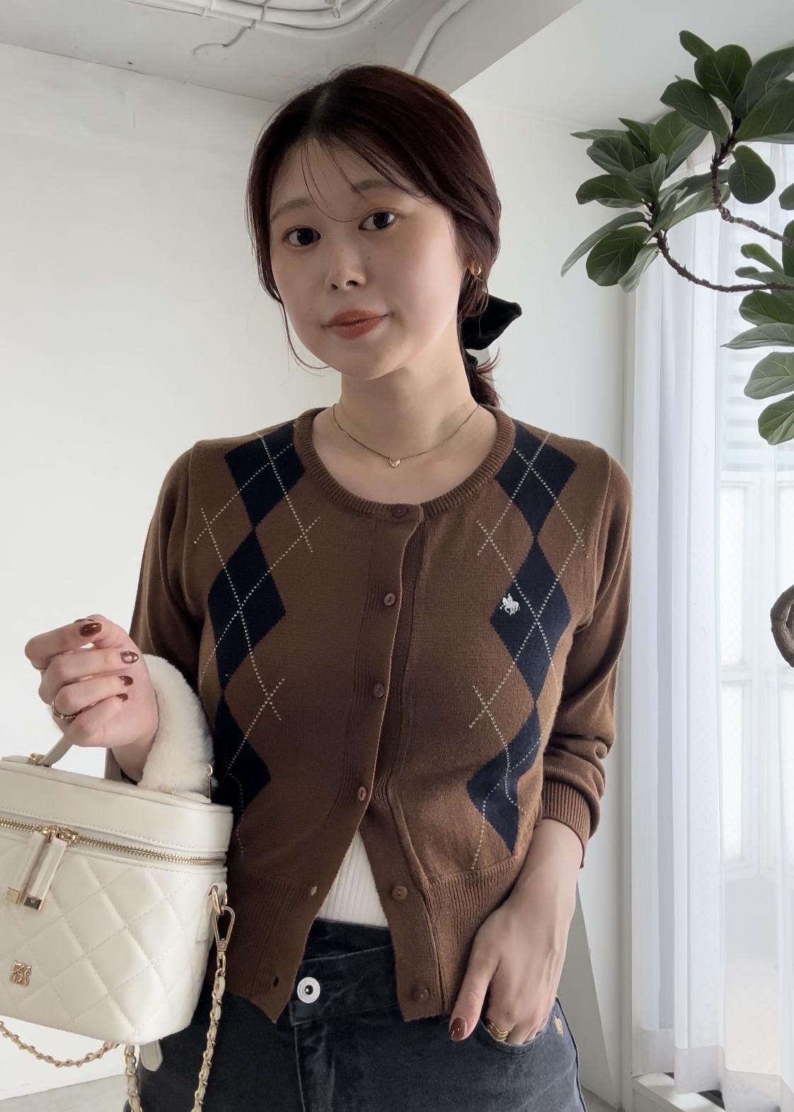 POLOのカーディガンはアーガイル柄のブラウンに、デニムを合わせ、ヒールブーツで大人っぽさもプラスしたカジュアルコーデにしてみました!