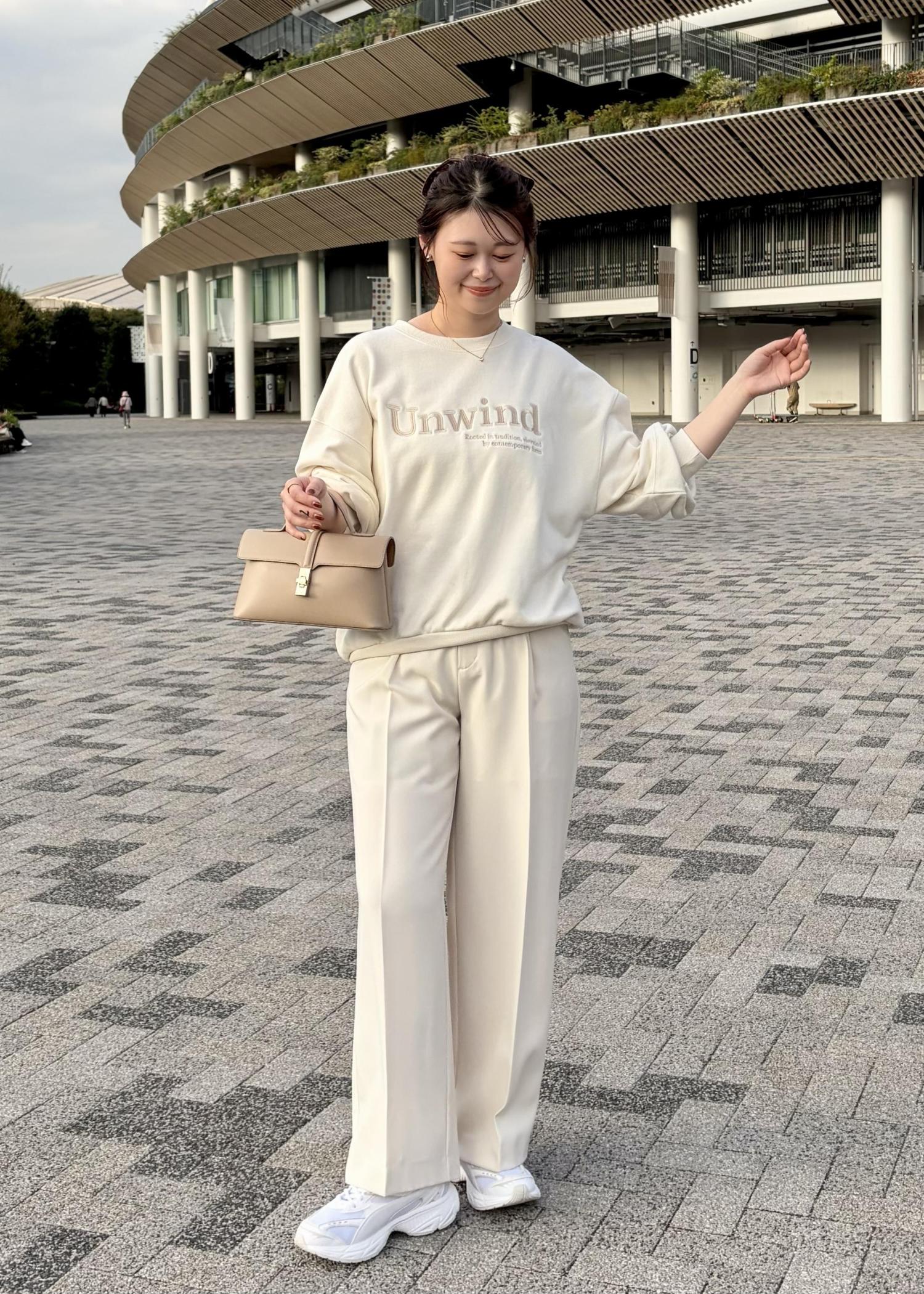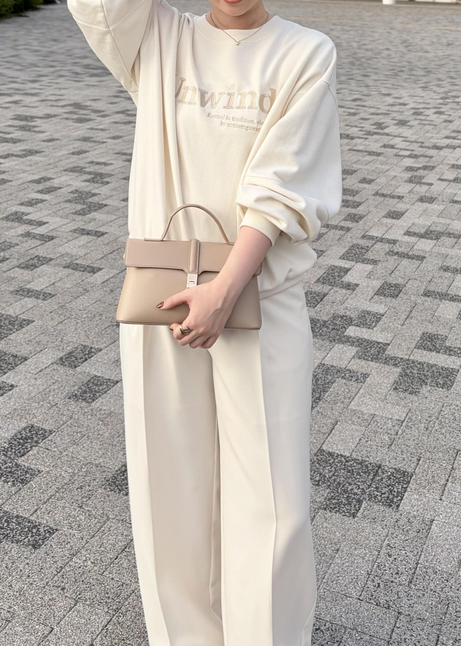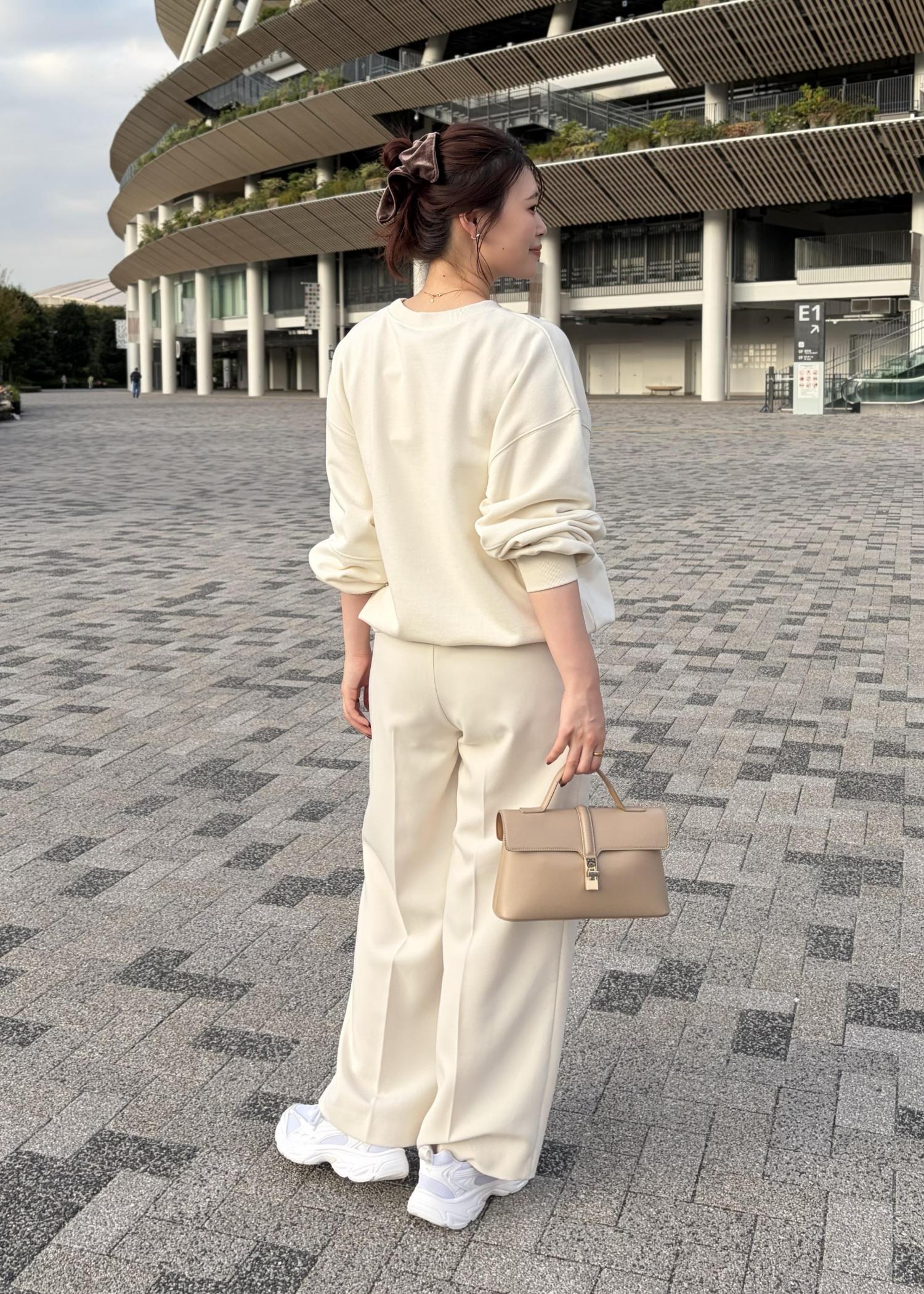 ラフに着られるスウェットにワイドパンツを合わせ、バックはコンパクトなサイズのきれいめバックにスニーカーで大人かわいいコーデにしてみました!