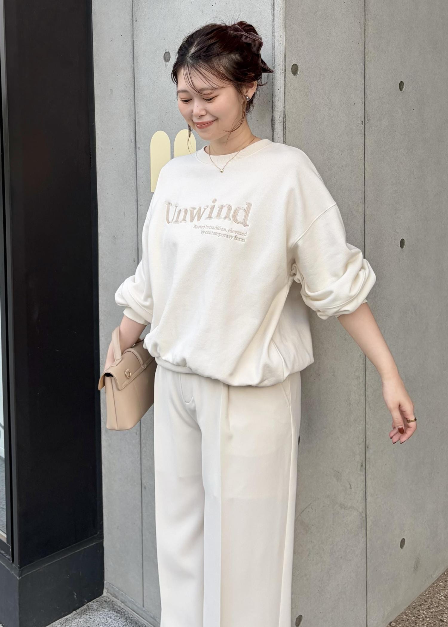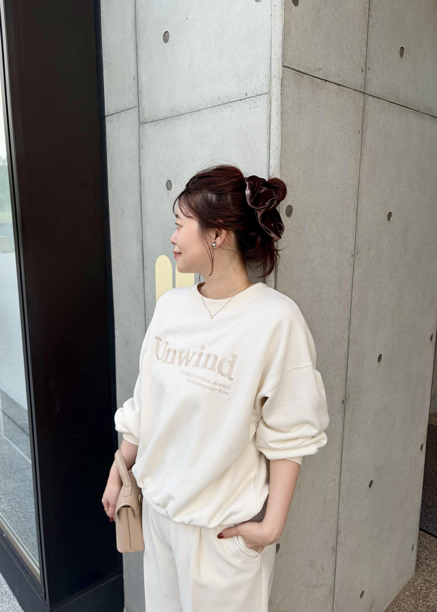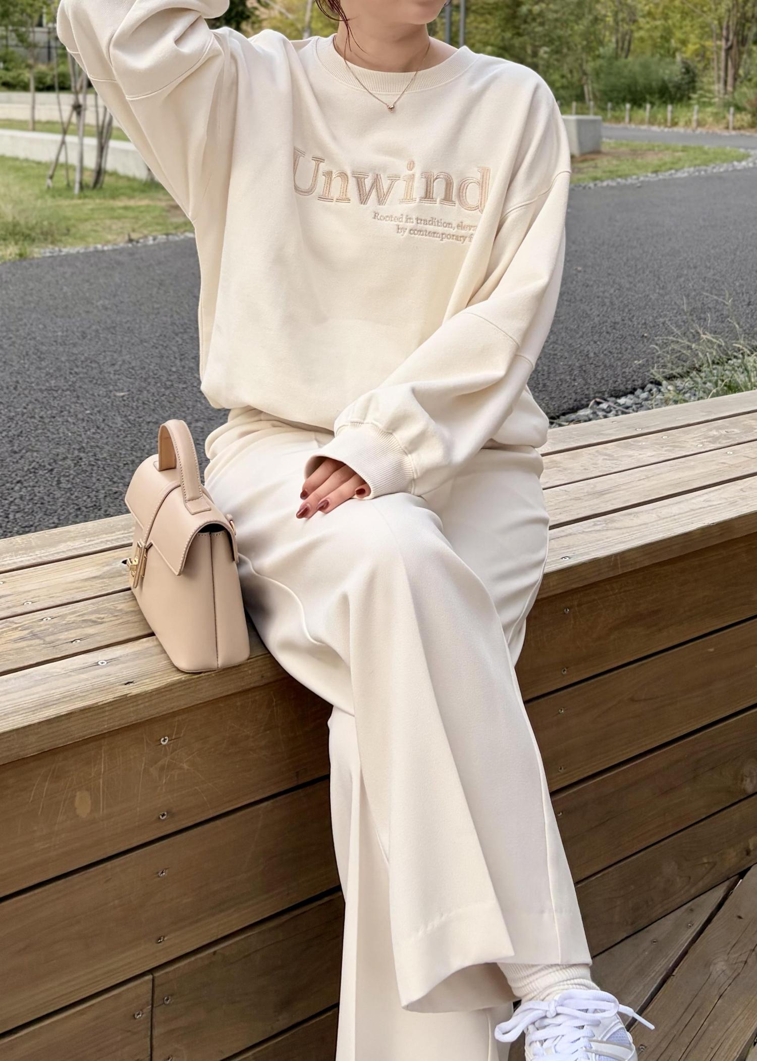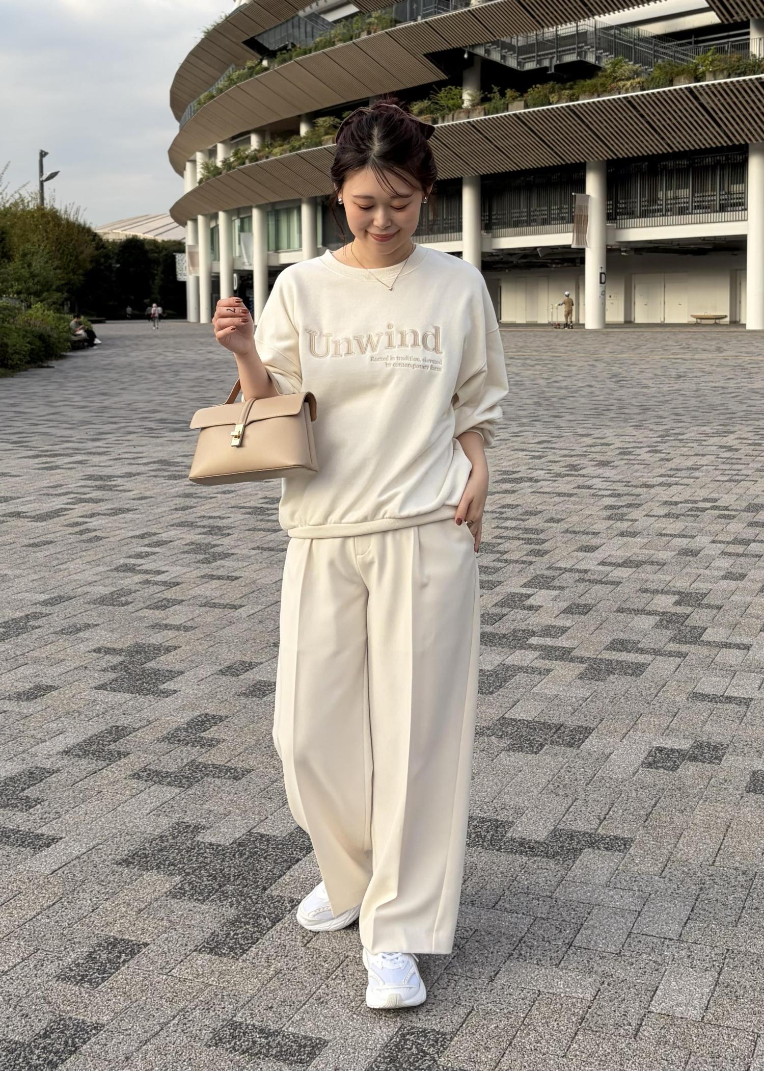 ラフに着られるスウェットにワイドパンツを合わせ、バックはコンパクトなサイズのきれいめバックにスニーカーで大人かわいいコーデにしてみました!