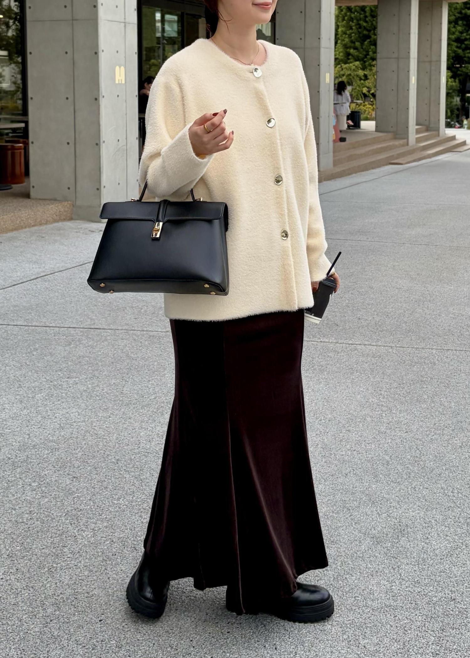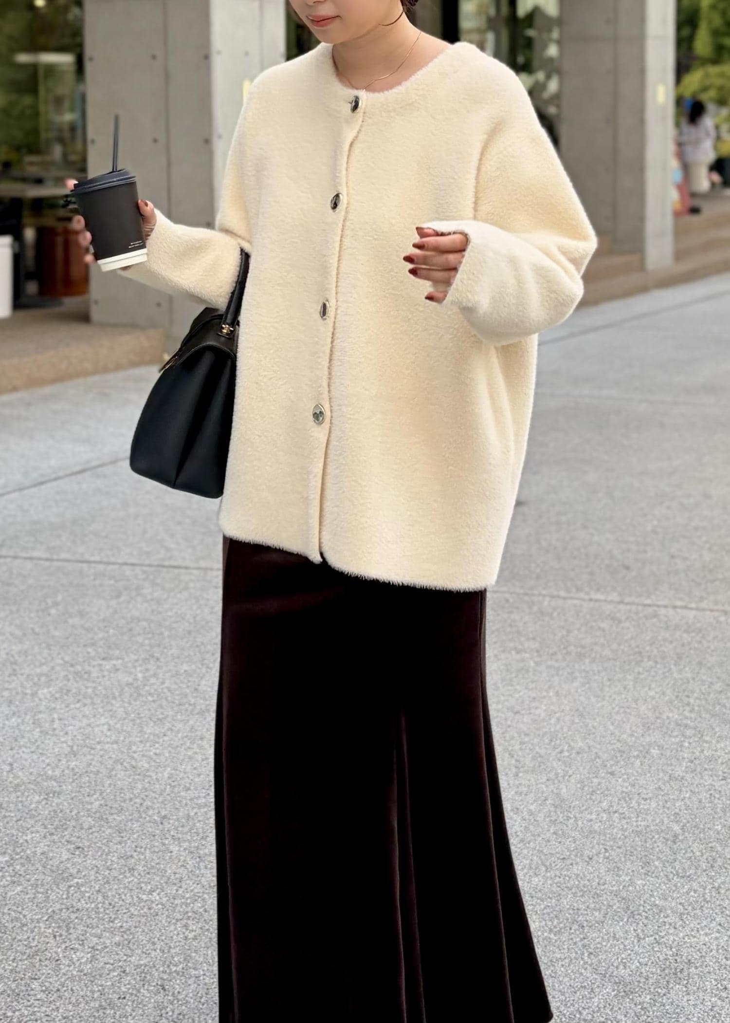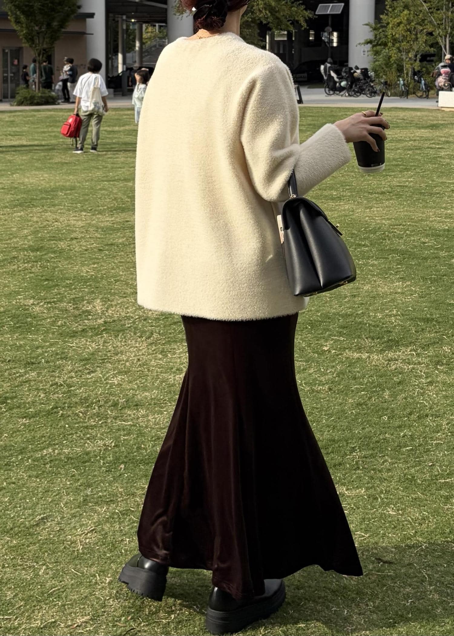 長さのあるきれいめニットアウターにベロアスカートはブラウンを合わせ、バックはきれいめにお出かけやデートシーンでも使えるスタイリングに◎