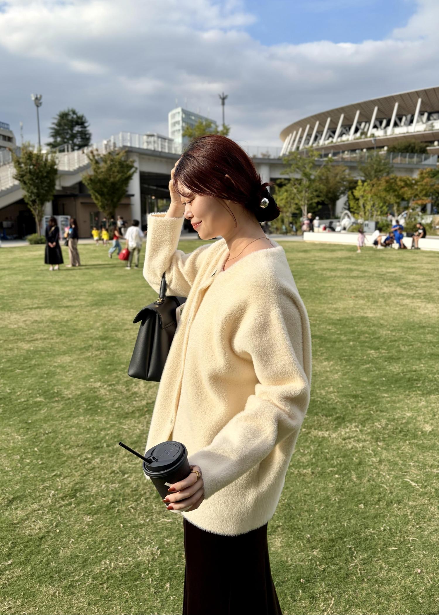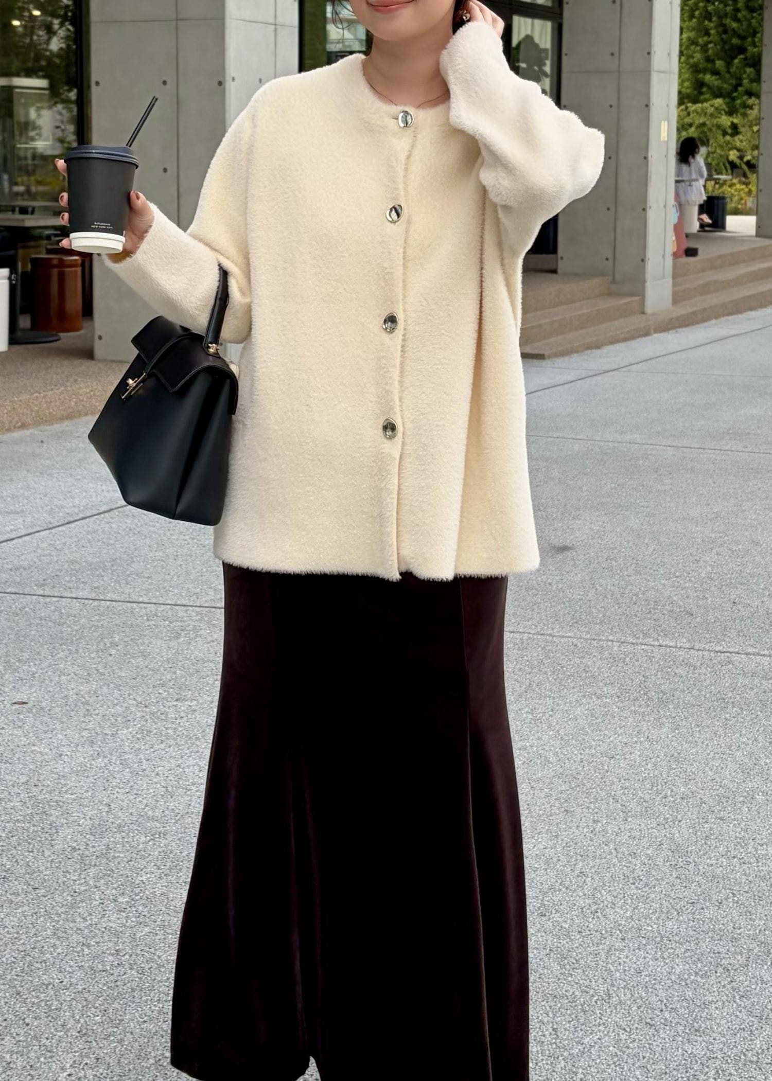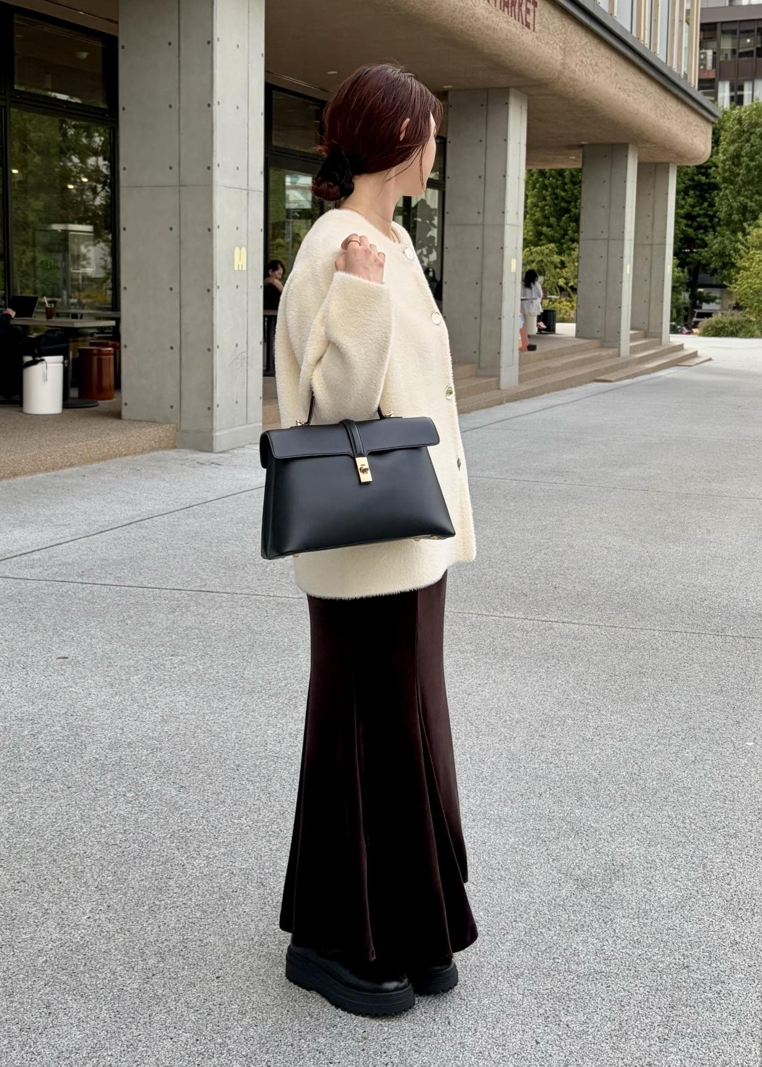 長さのあるきれいめニットアウターにベロアスカートはブラウンを合わせ、バックはきれいめにお出かけやデートシーンでも使えるスタイリングに◎