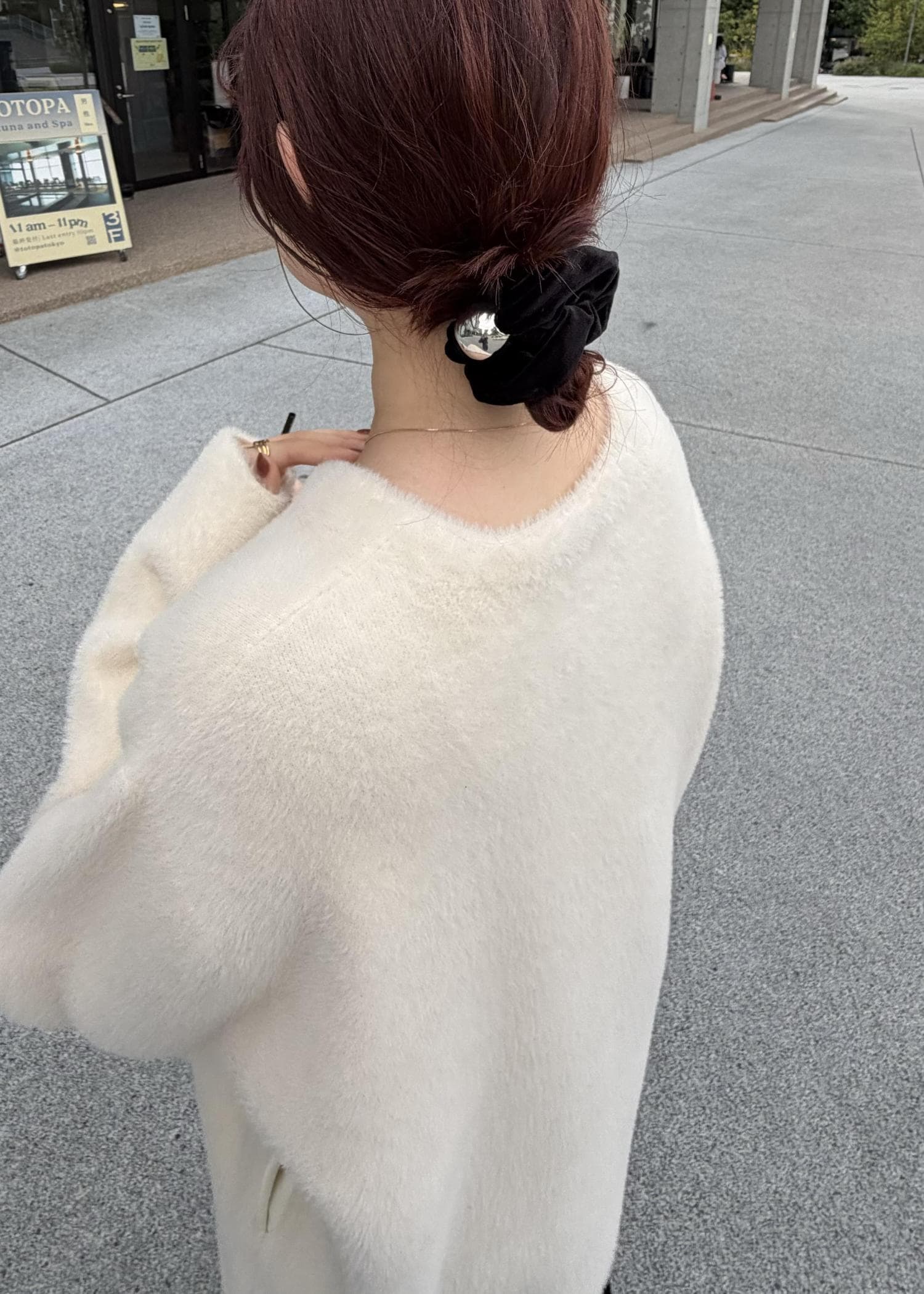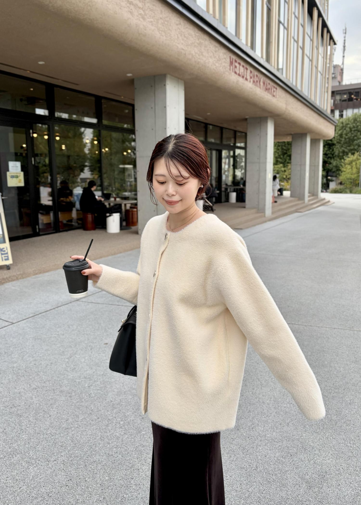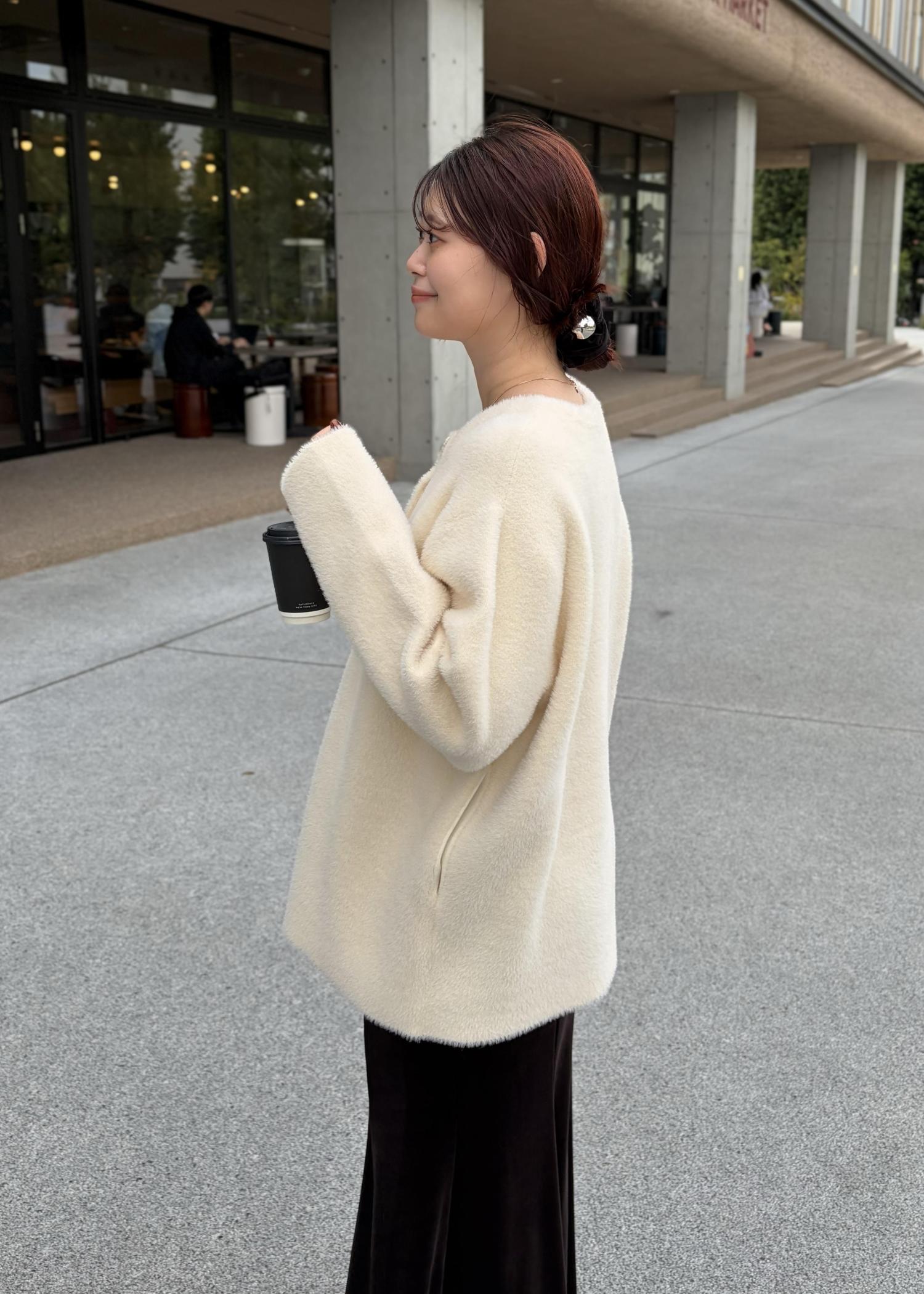 VIS接結メタルボタンミニフェザーニットコートオフホワイト / F¥9,999レビュー表面肉厚感ありますが、実際に着るとインナーにカットソーもインできるくらいの身幅と腕周りです。