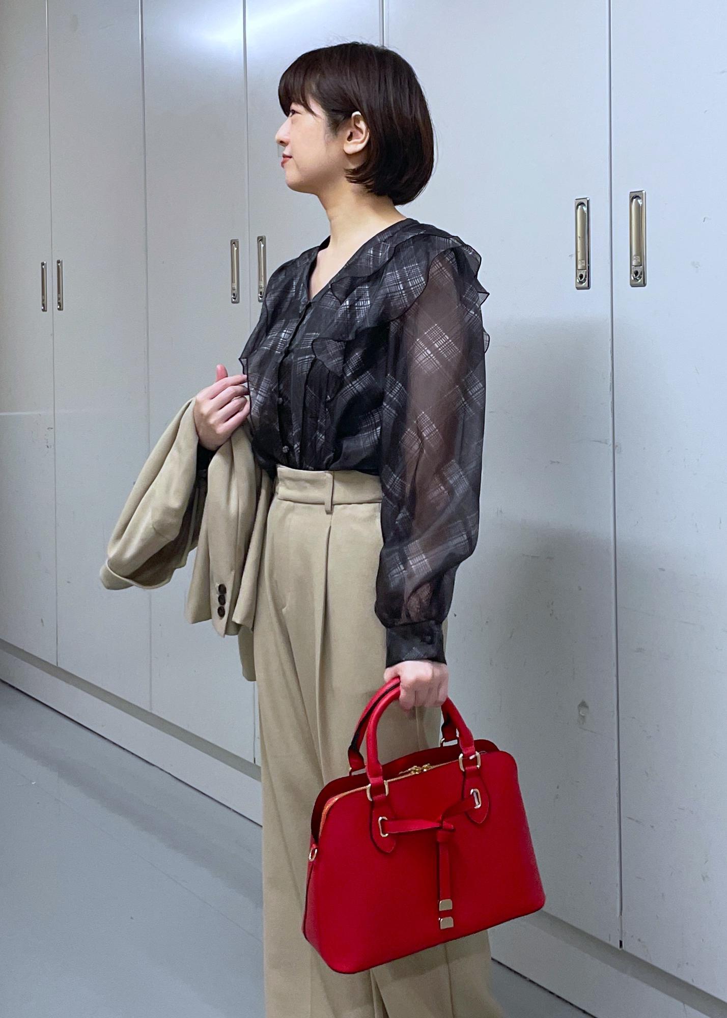 合わせたブラウスはシアー感があるので、ブラックでも強い印象になりません◎