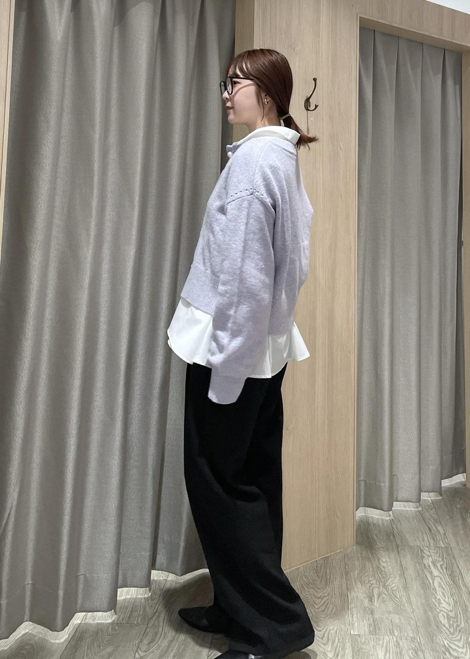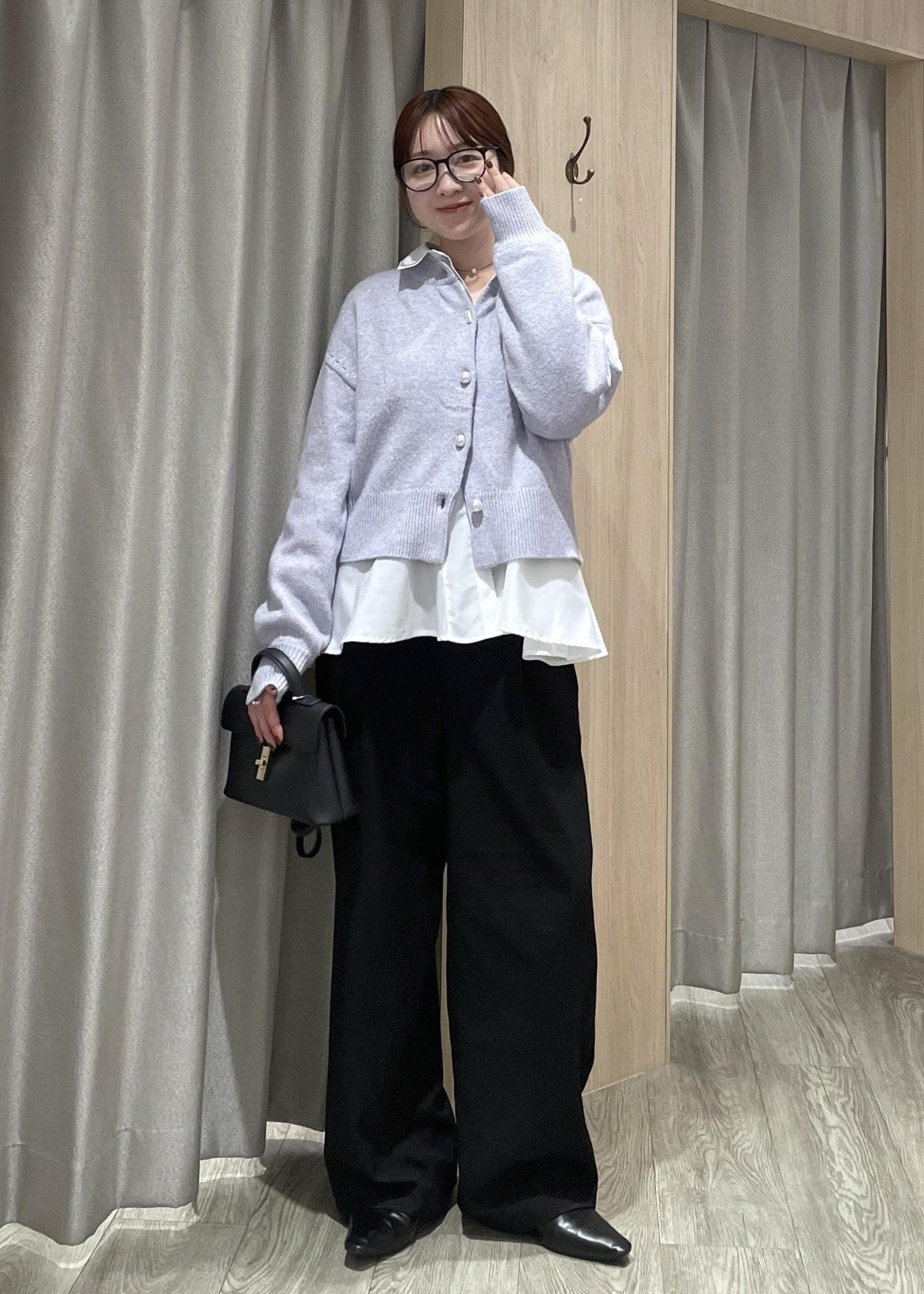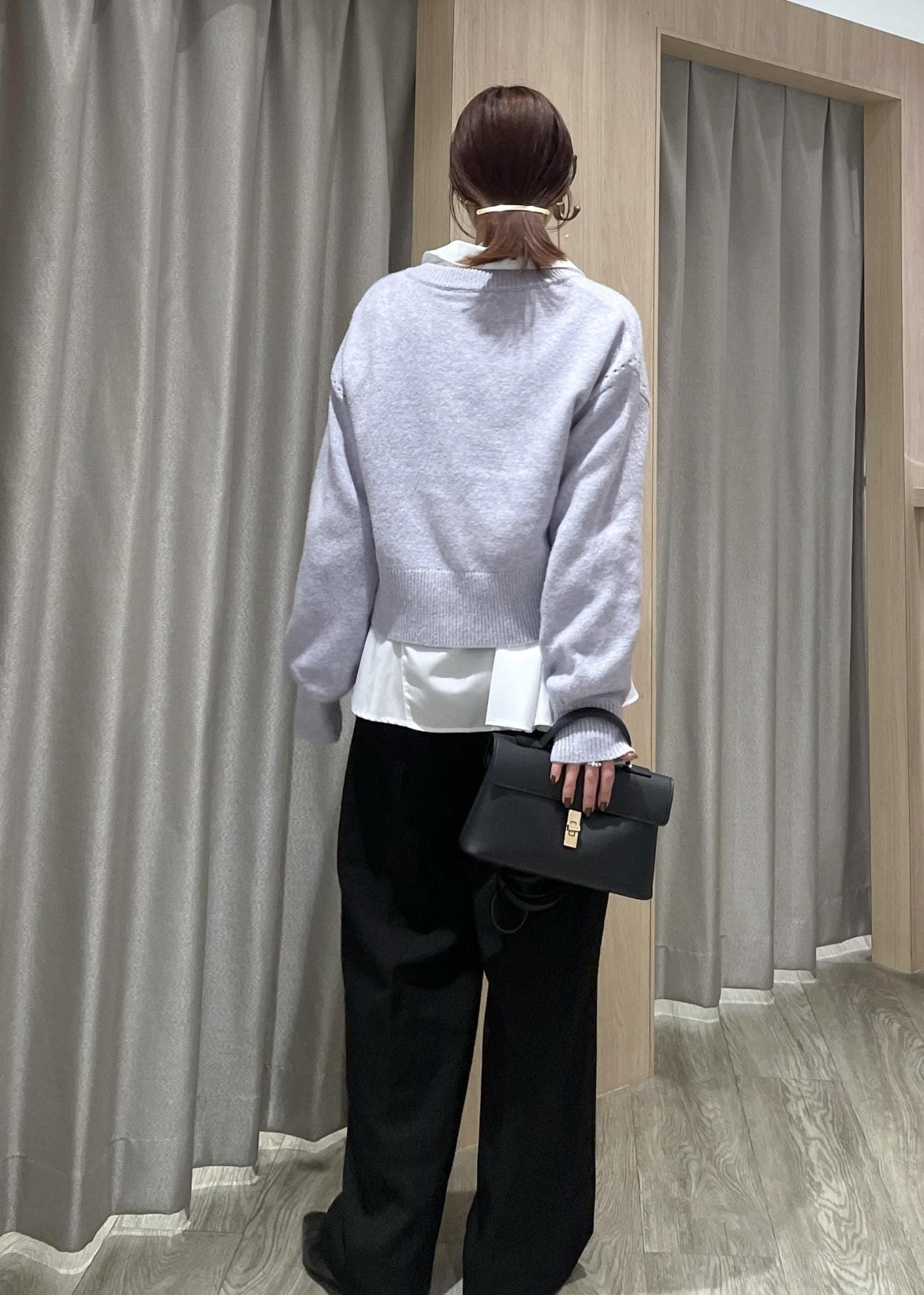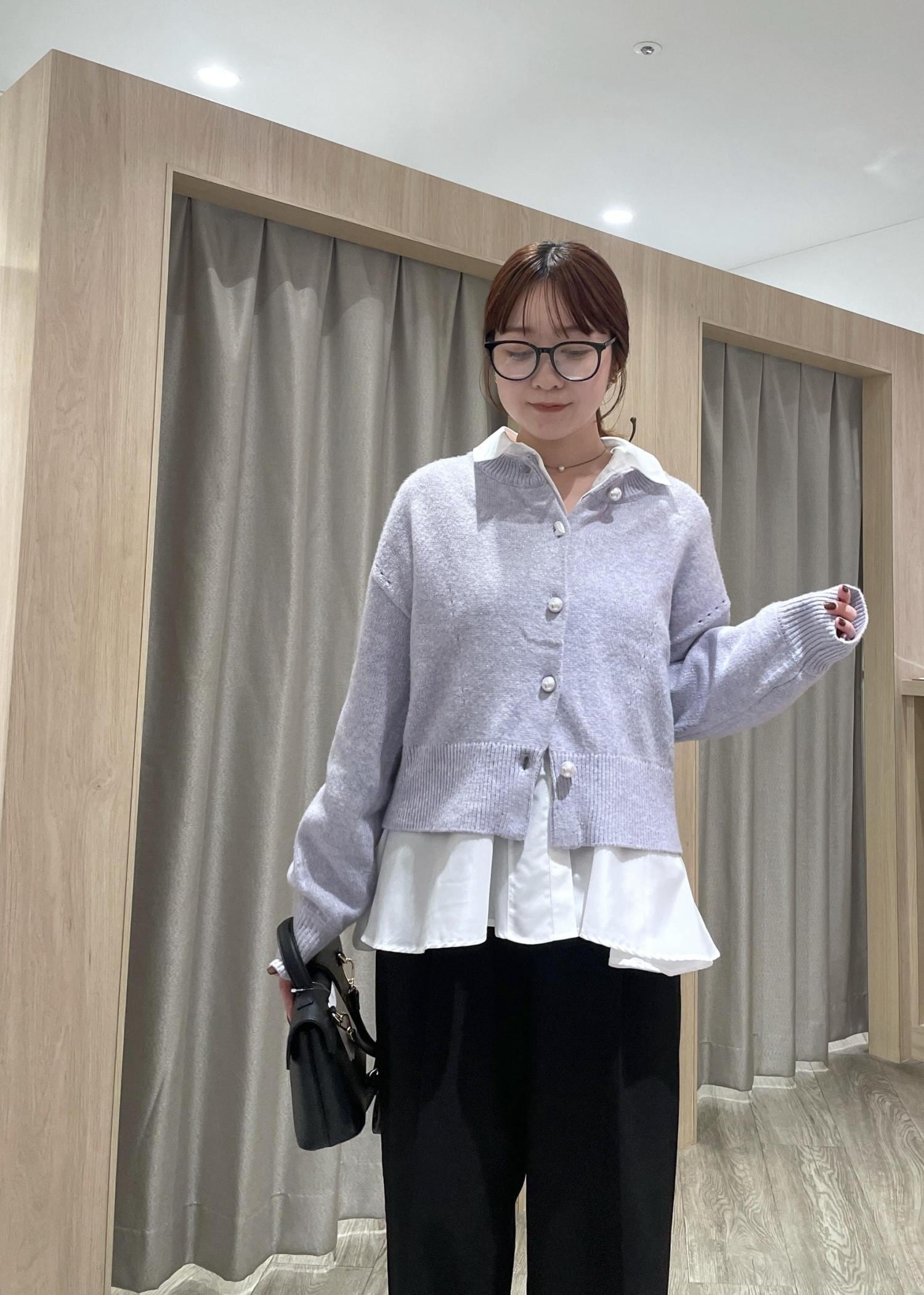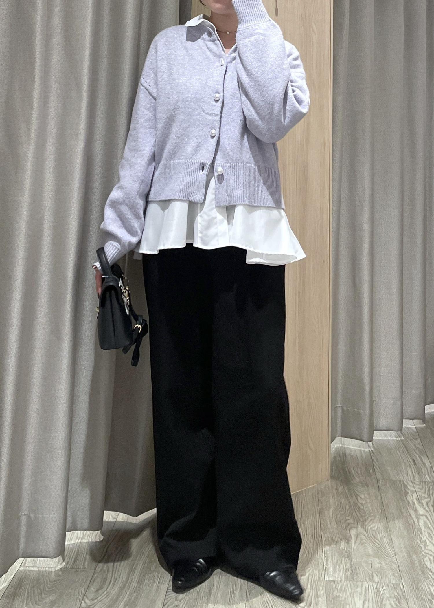 パープルのニットカーデをメインに、