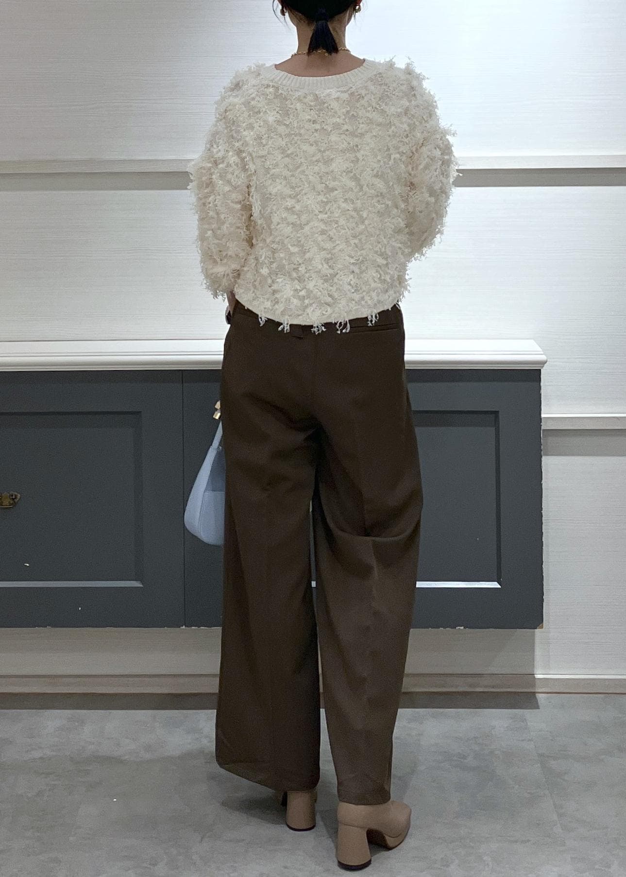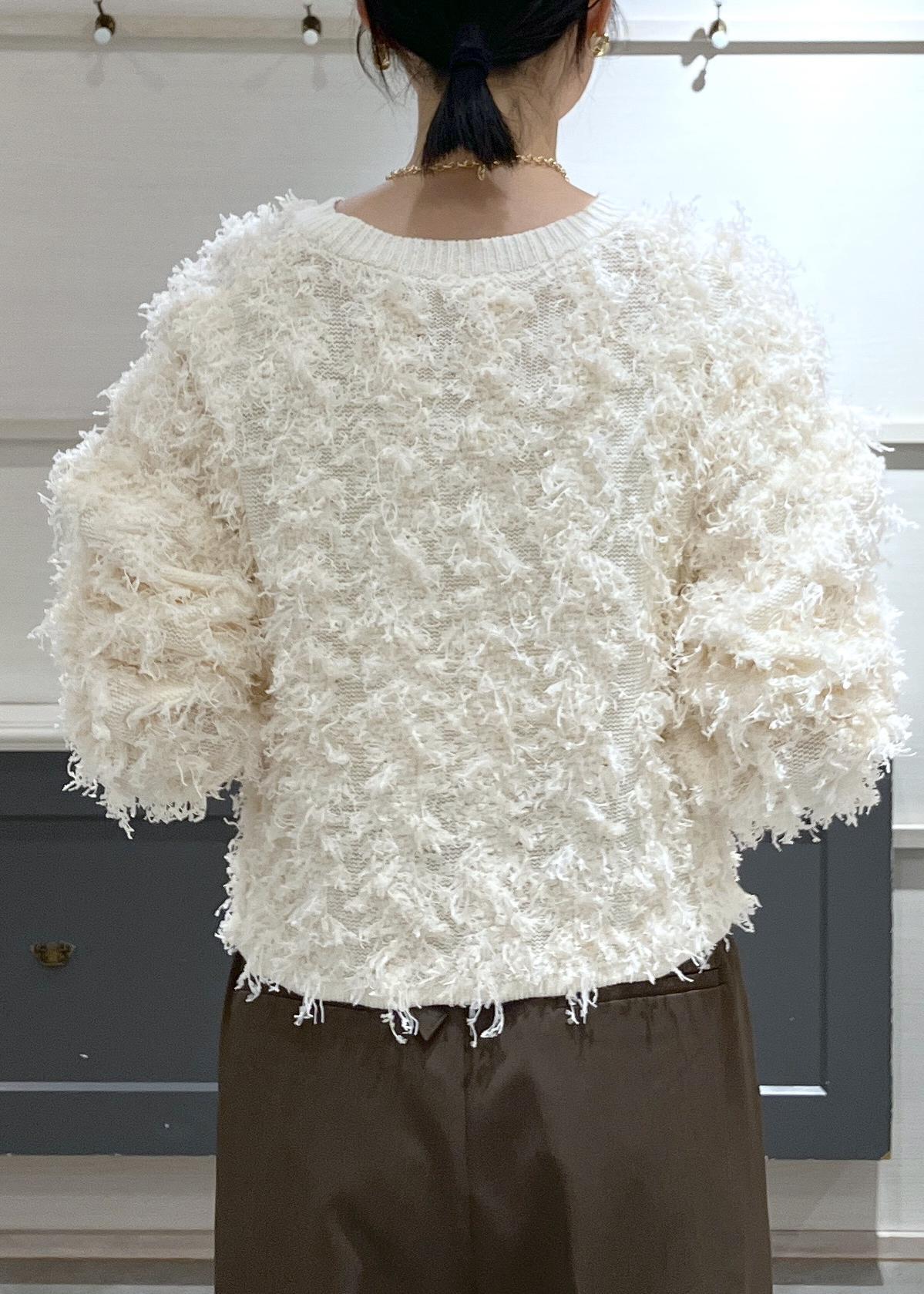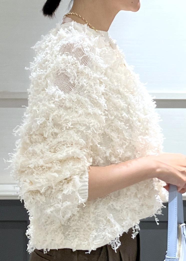 VISリボンヤーンフリンジニットプルオーバーオフホワイト / F¥6,589レビュー骨格ストレートで肩周りが気になる体型ですが、首元が詰まり過ぎてないのでスッキリ見せてくれます♡