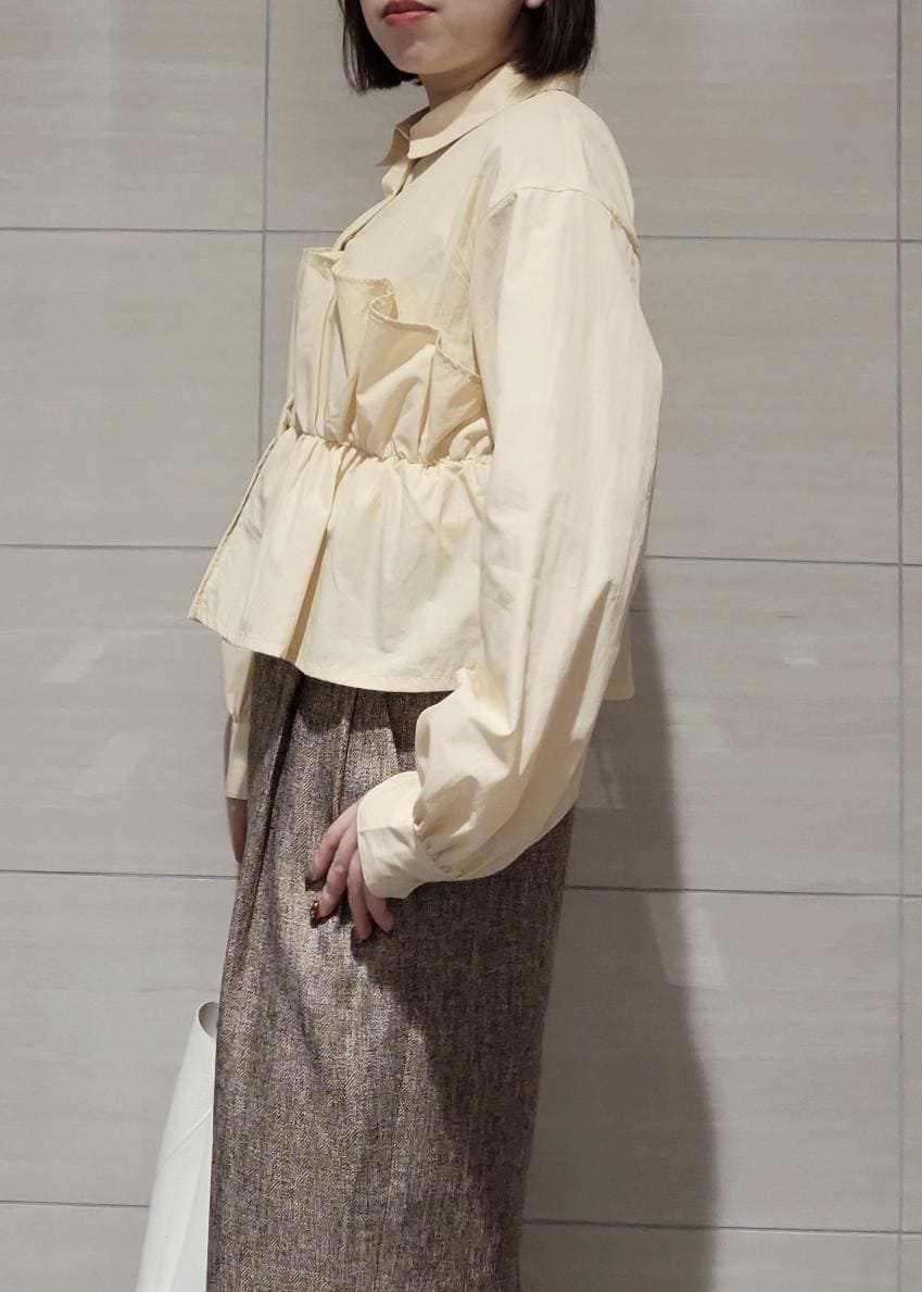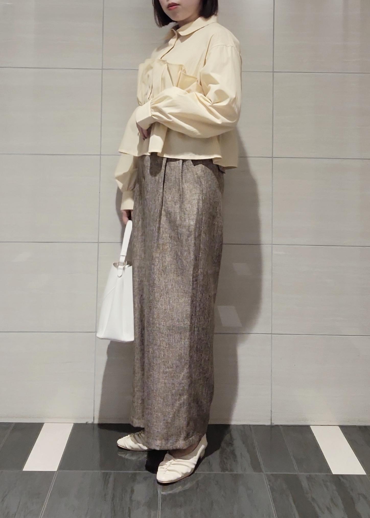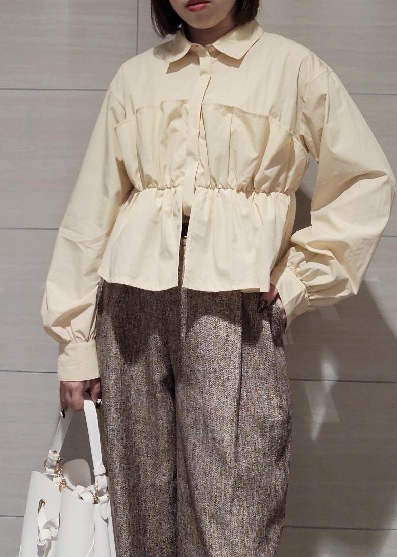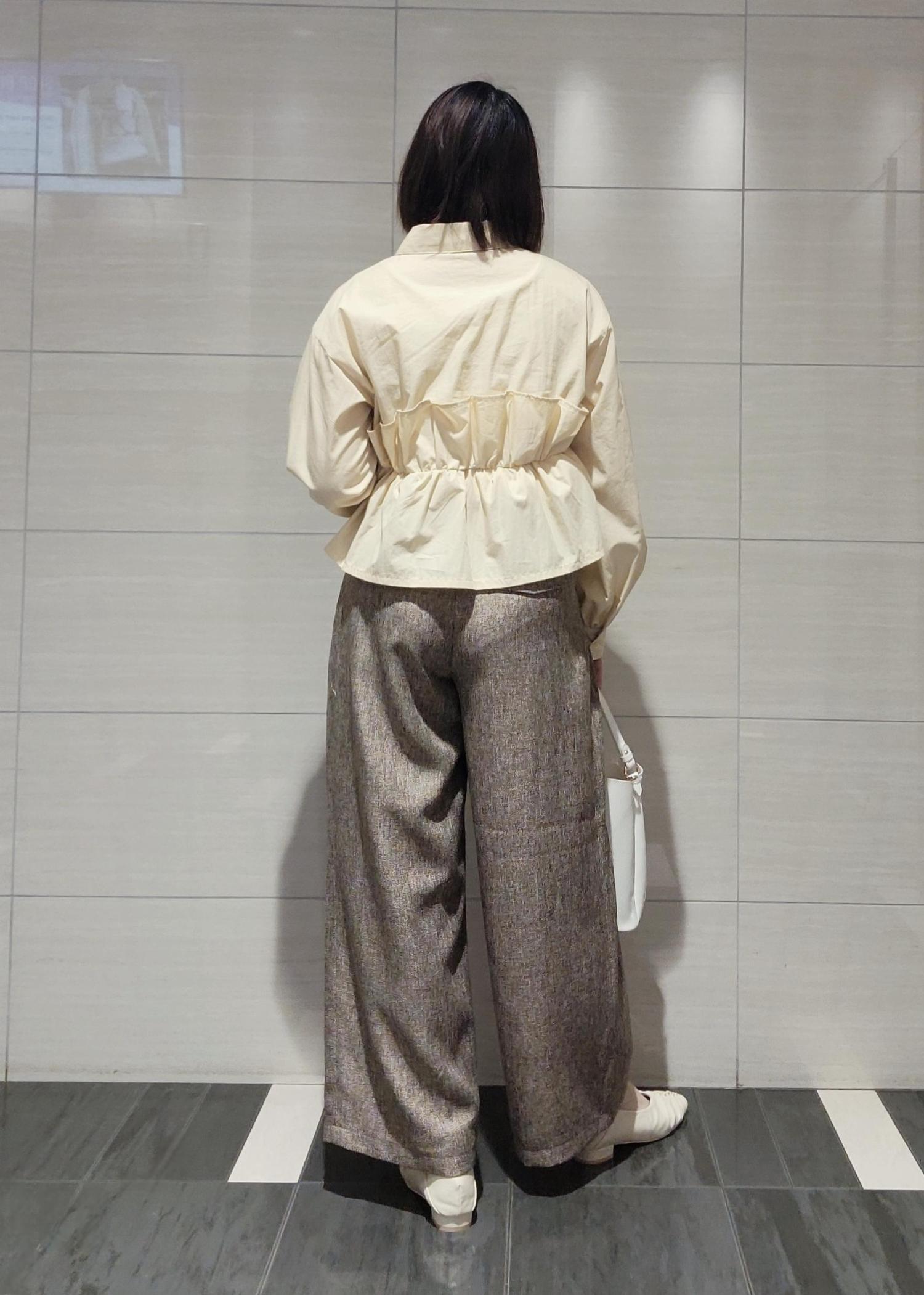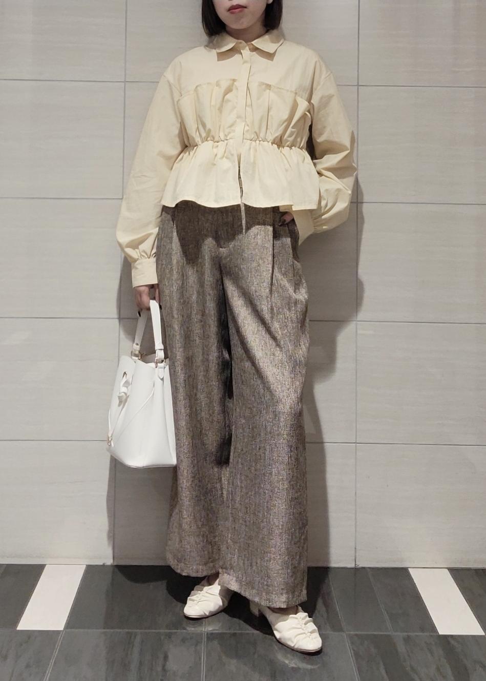 デザイントップスにツィードのワイドパンツを合わせてオフィスカジュアルなコーディネートにしました。カラーシャツを取り入れてベーシックになりすぎないようにしました♪