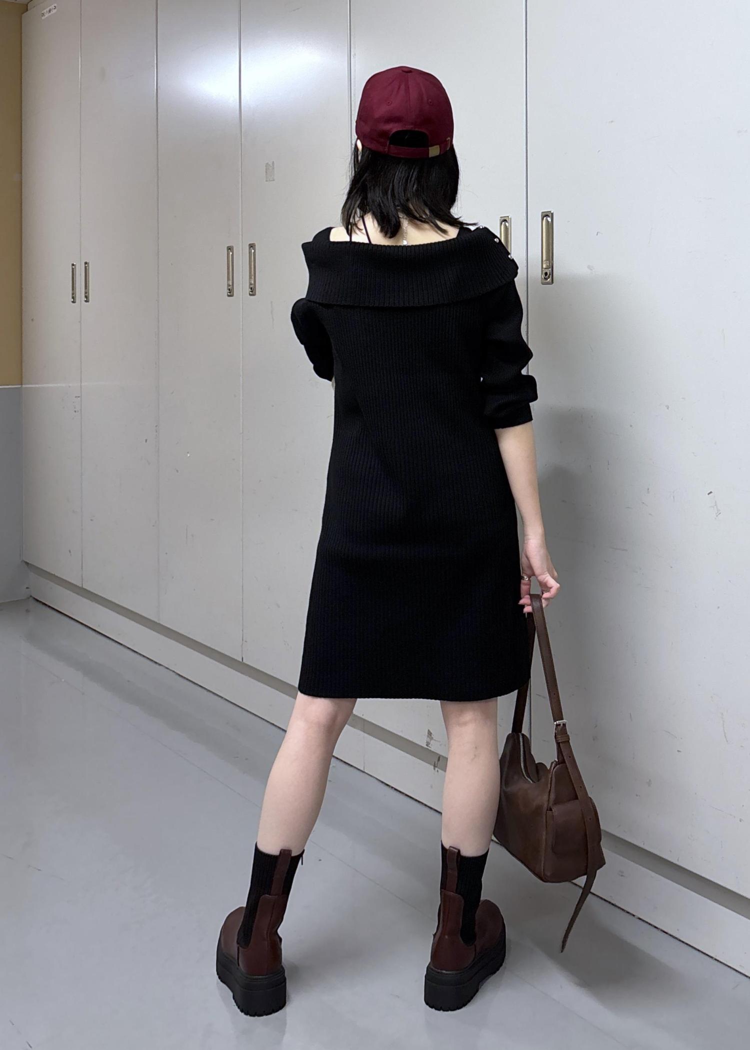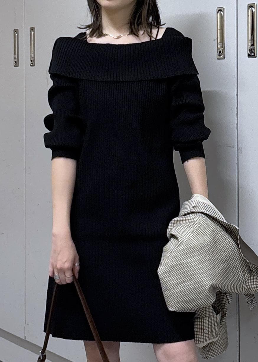VISアシメオフショルリブニット美シルエットワンピース/着丈が選べるブラック / FS¥8,899レビュー割としっかりめな生地感なので、暖かく着れます。