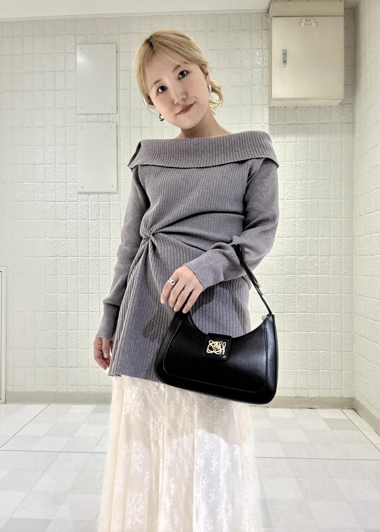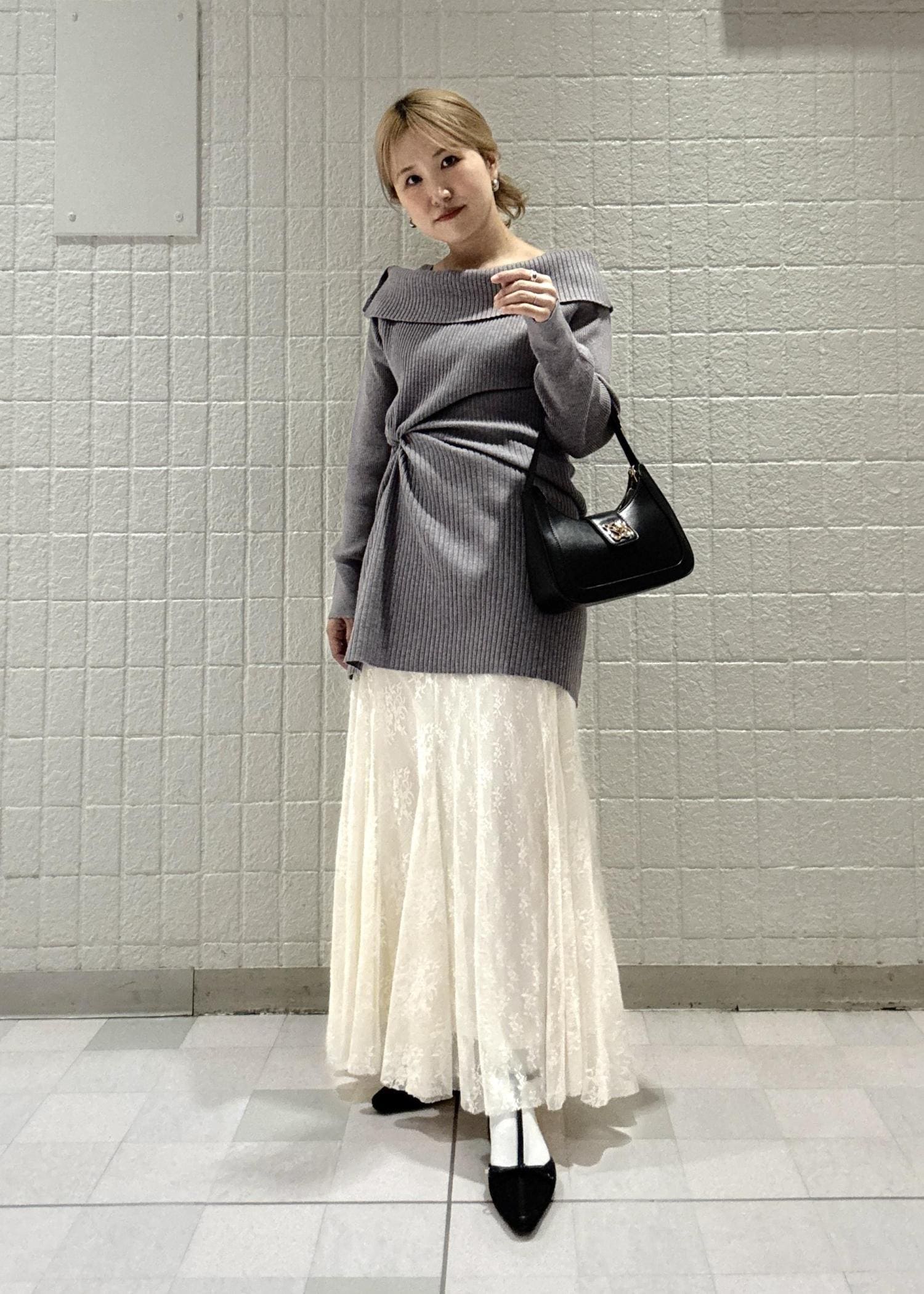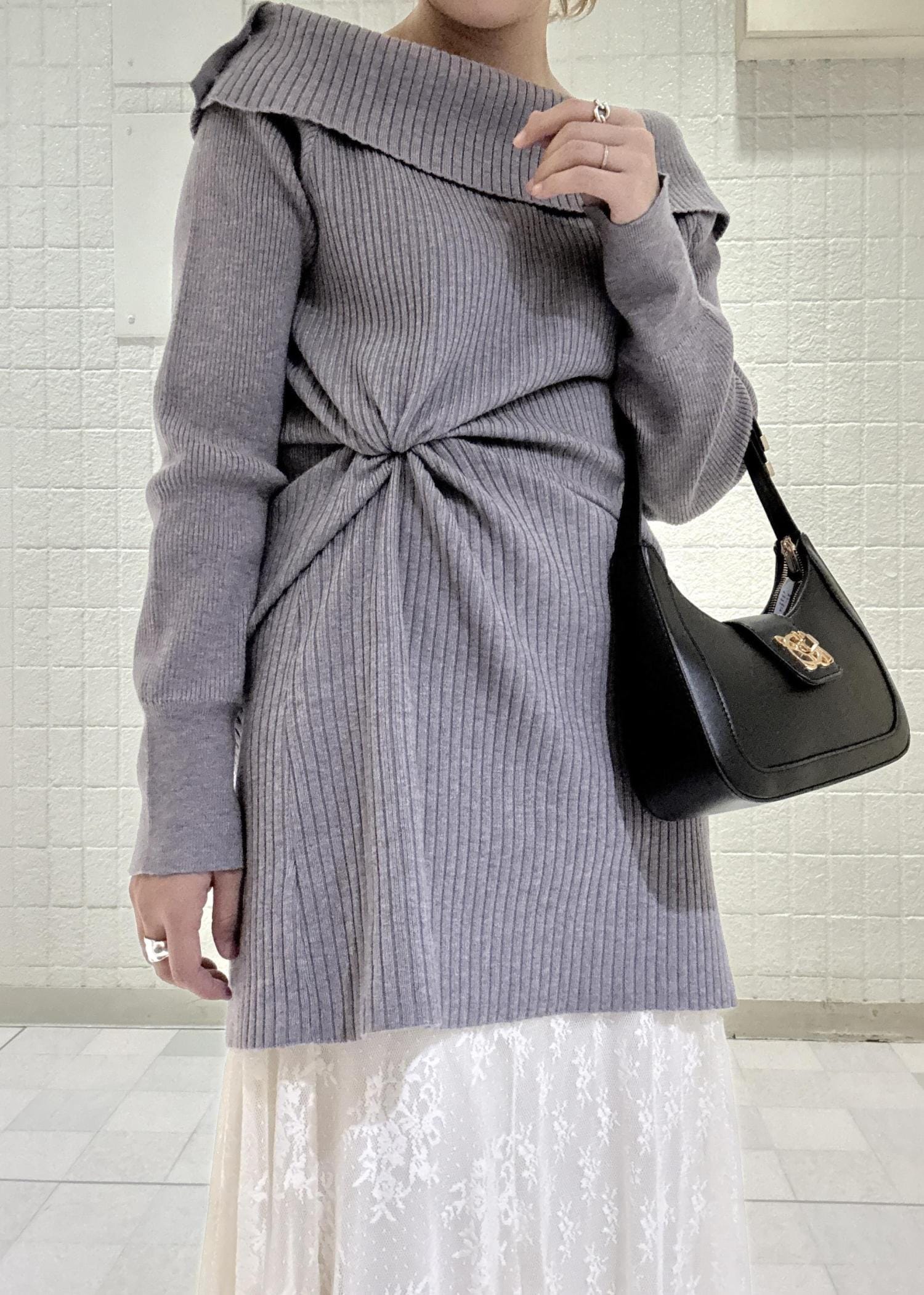 VISアシメオフショルリブニット美シルエットワンピース/着丈が選べるグレー / FS¥8,899レビュー152cmなのでミニ丈がとても合わせやすいですし