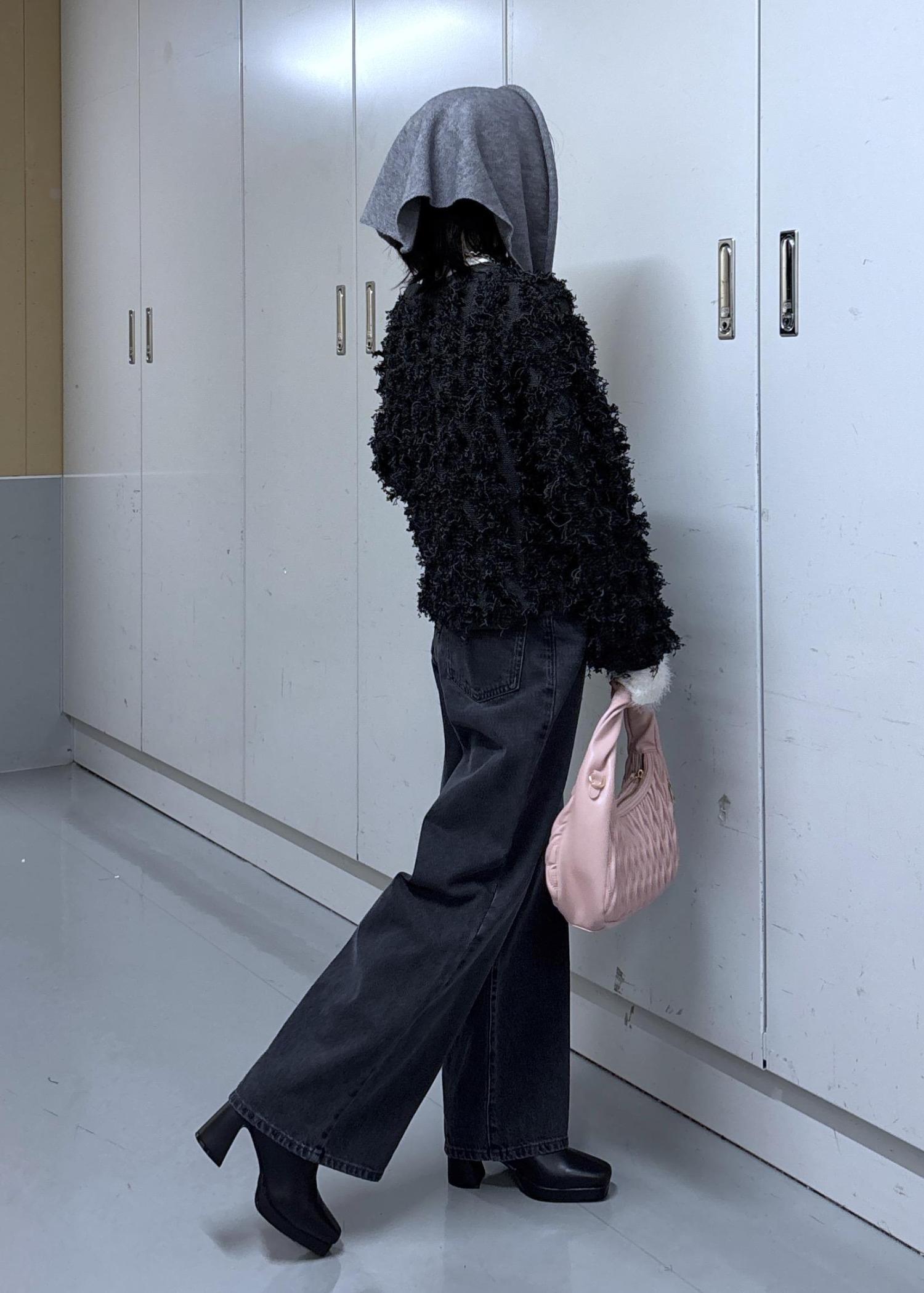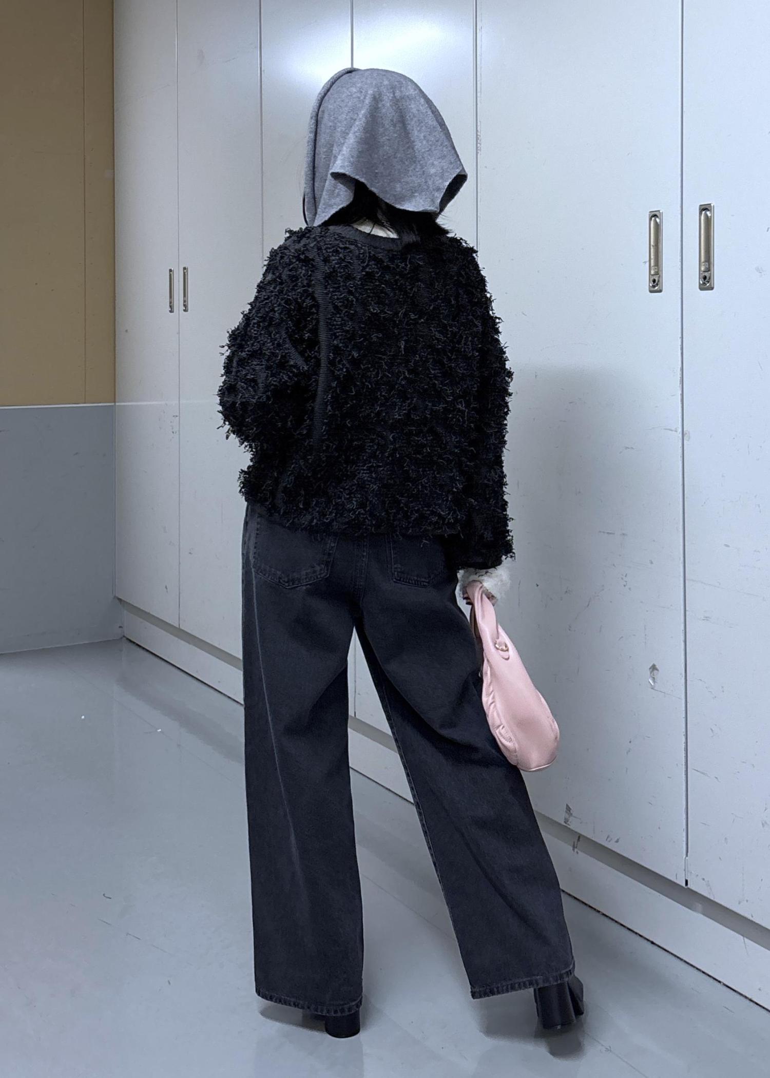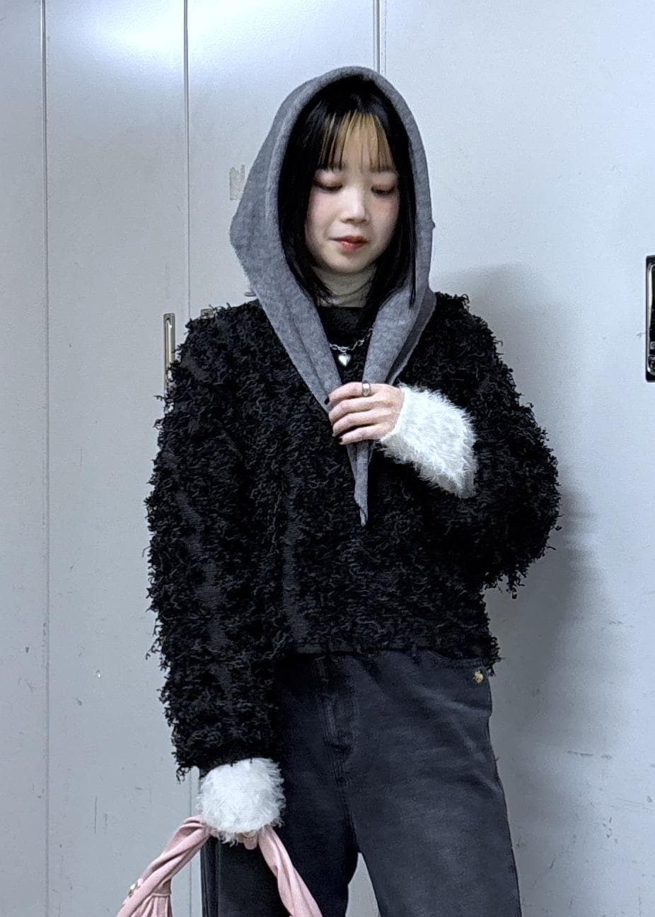 もけもけのニット、袖からはふわふわが出ていて、デニムは程よいヴィンテージ感、頭には頭巾風ニットスカーフ!