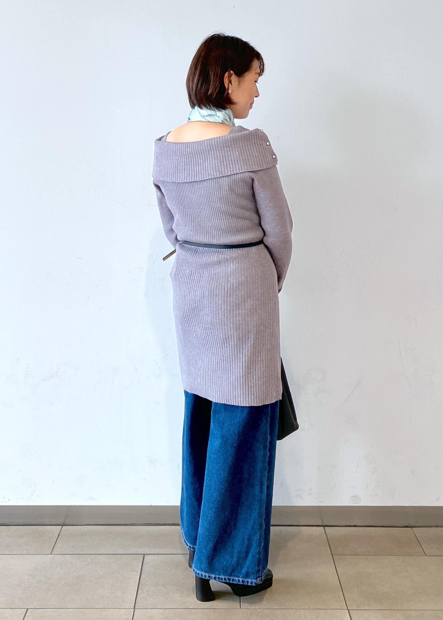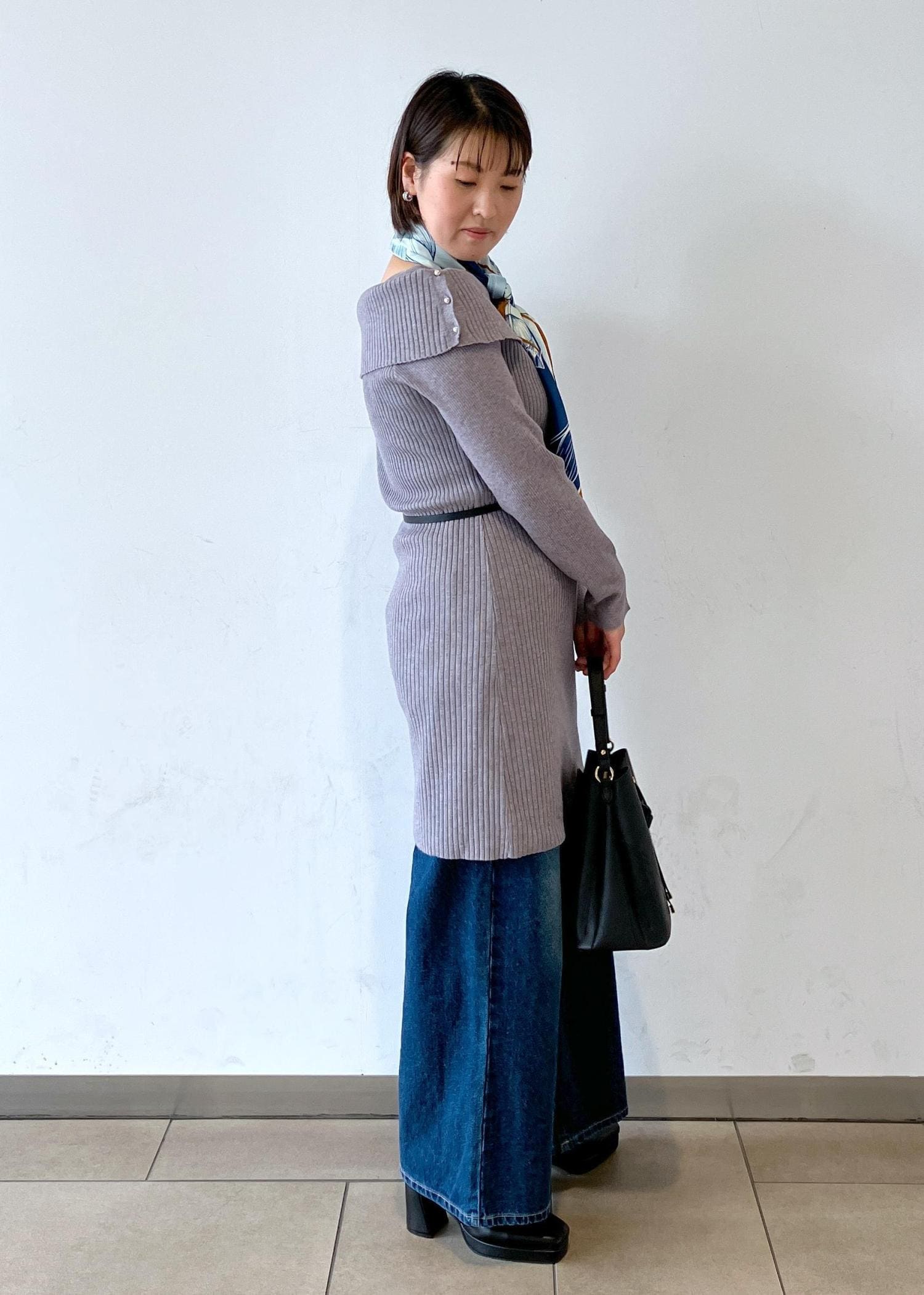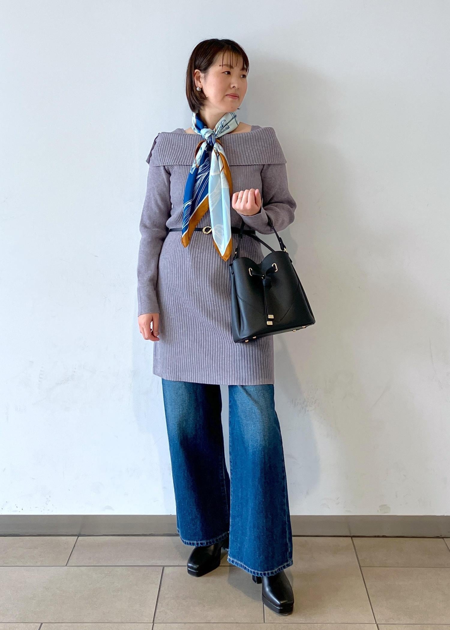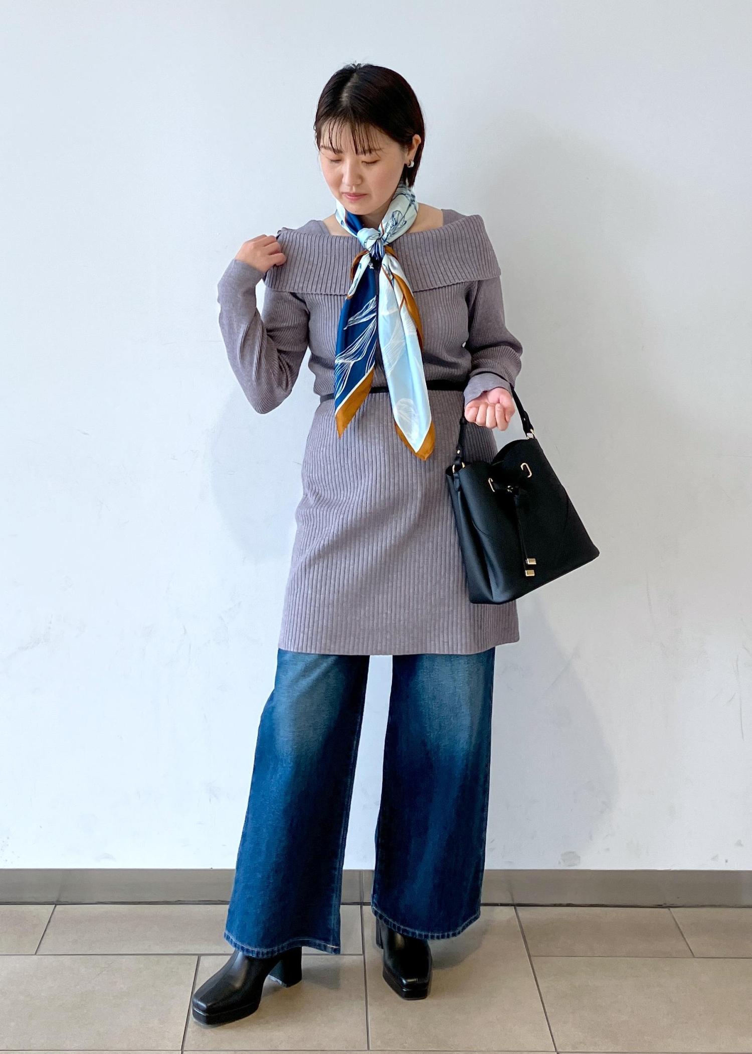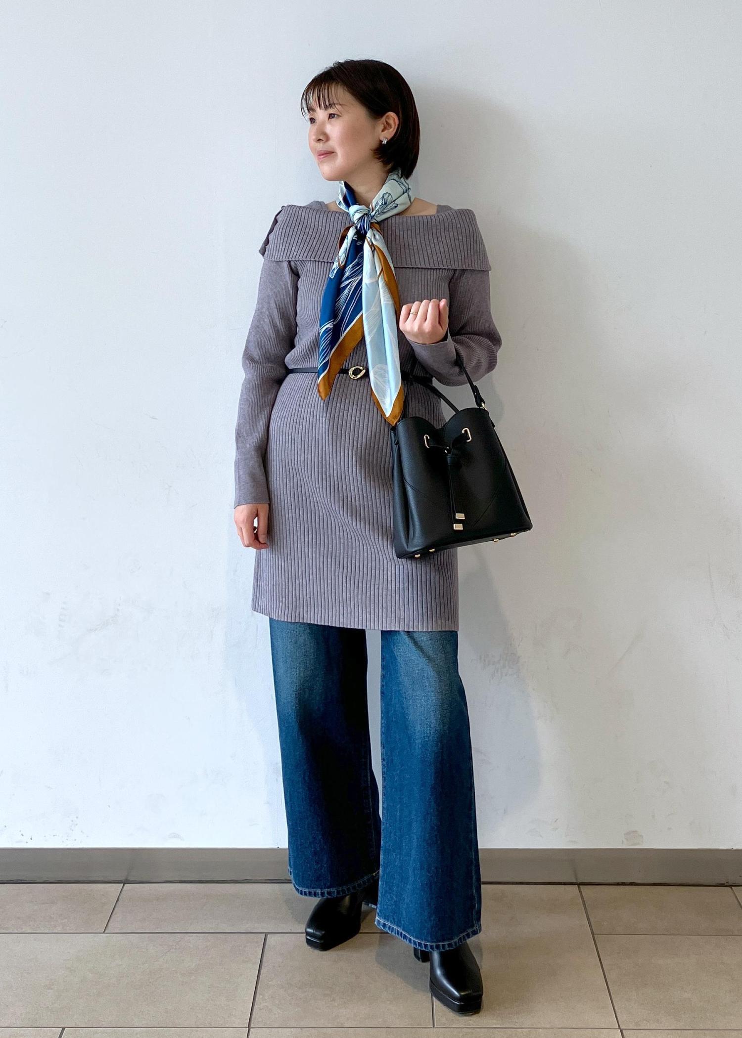 秋冬になると気になるニットワンピース!VISも入荷しています!こちらは着丈が選べて短い丈を着用しています!1枚着だと短すぎるのでデニムと合わせて見ました!シンプルなワンピースなのでベルトでウエストマークし、スカーフをポイントに取り入れました!