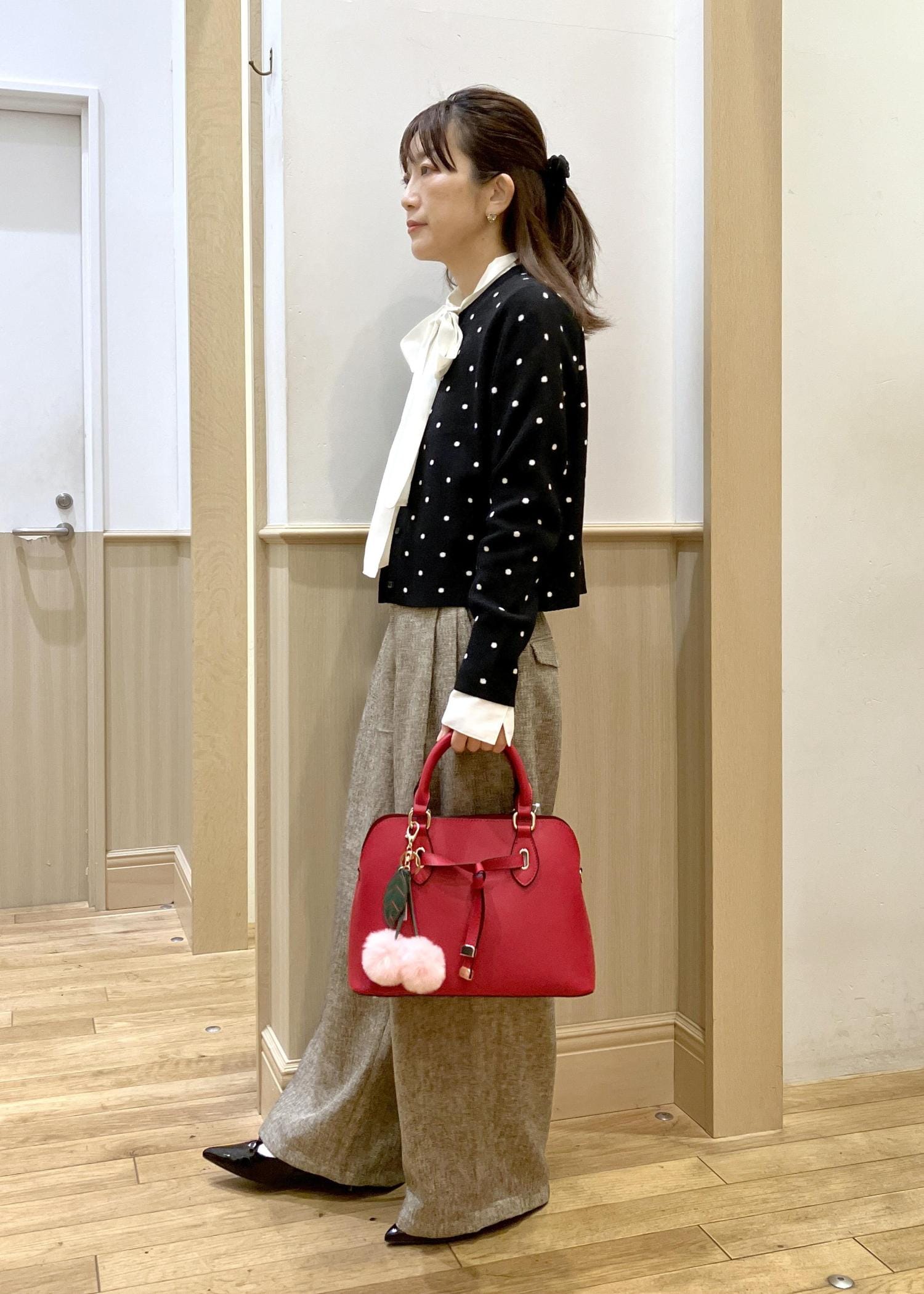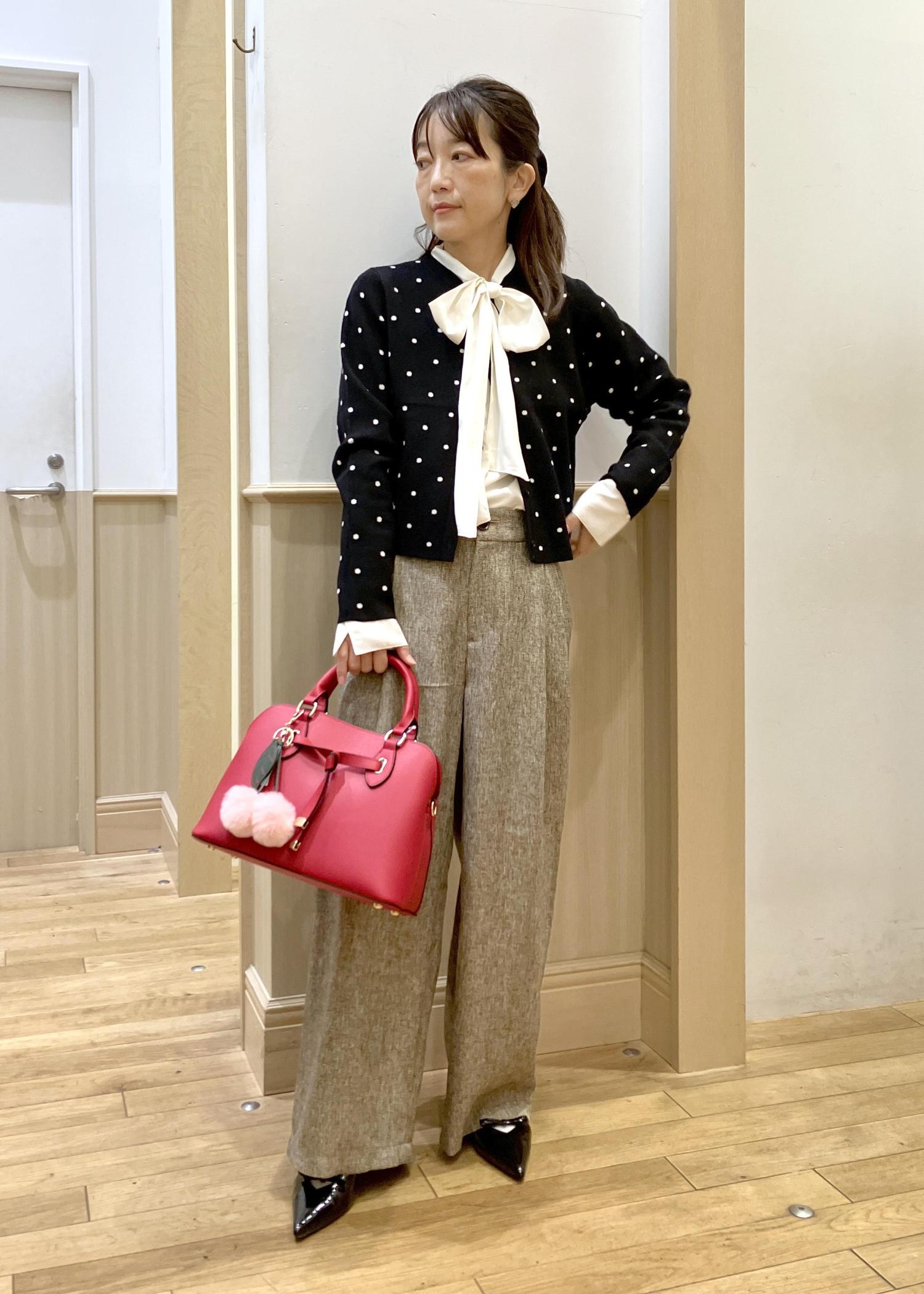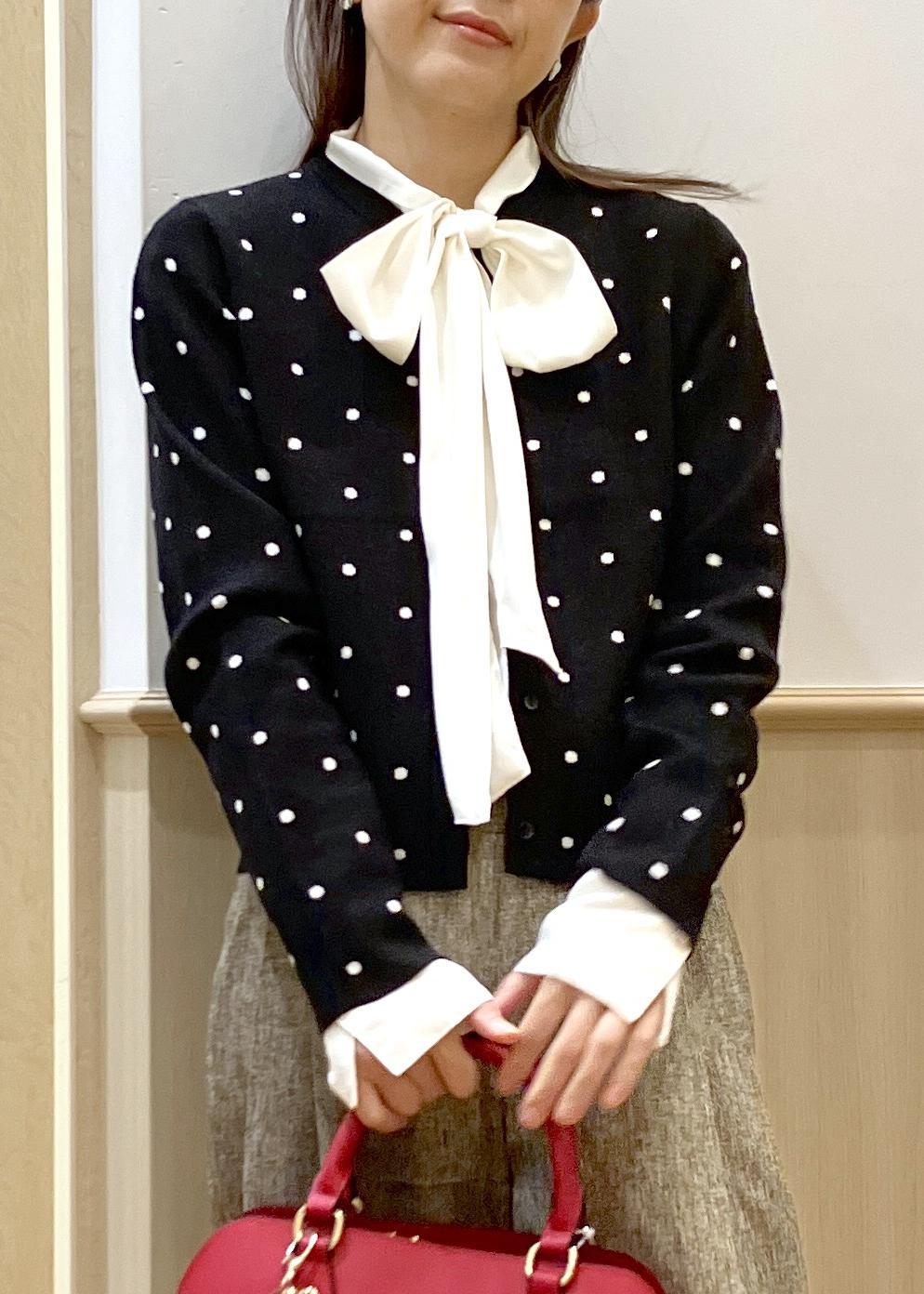 白のボウタイリボン×ドット柄のカーデで少し甘めな気分のオフィスstylingをイメージしました。