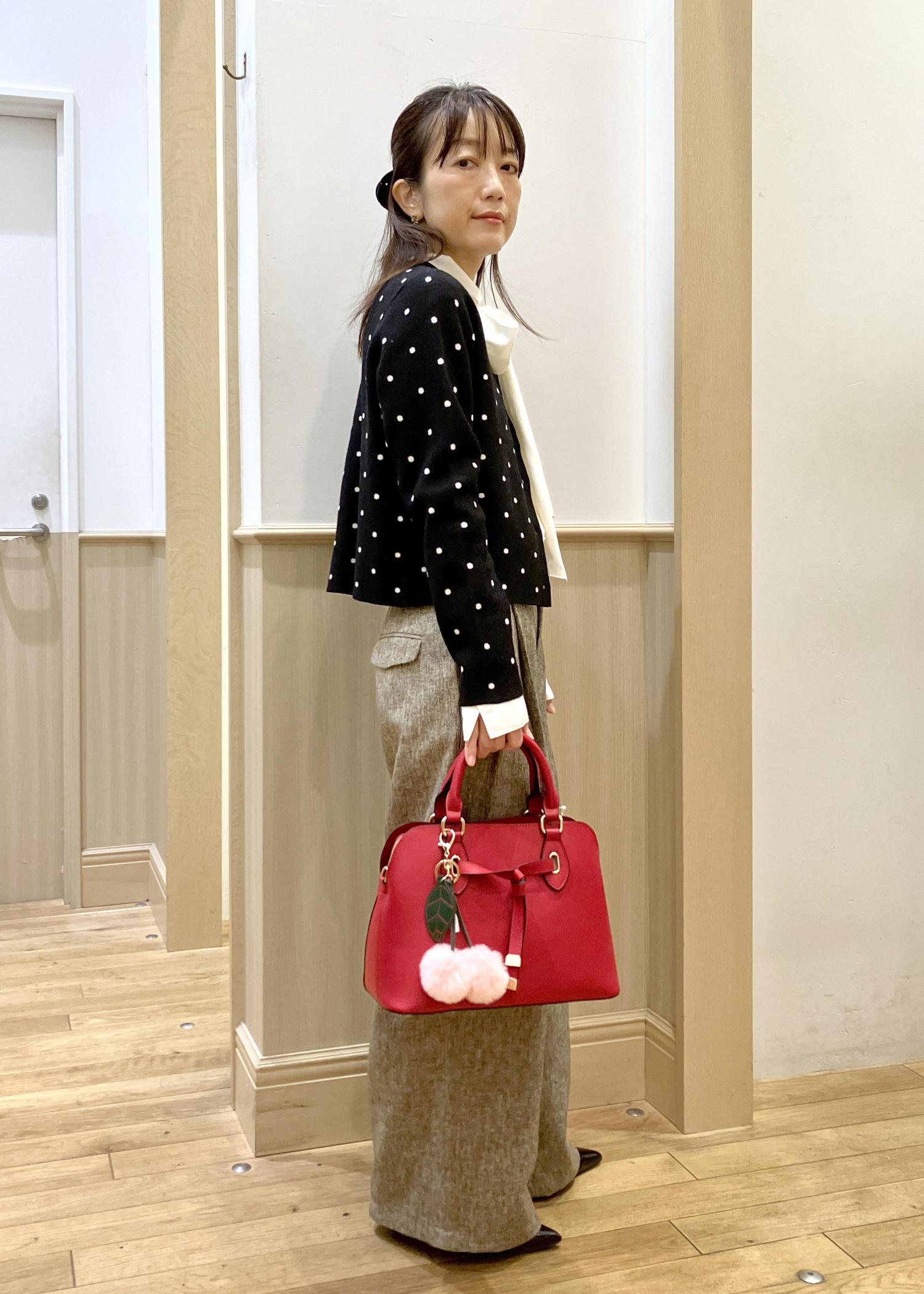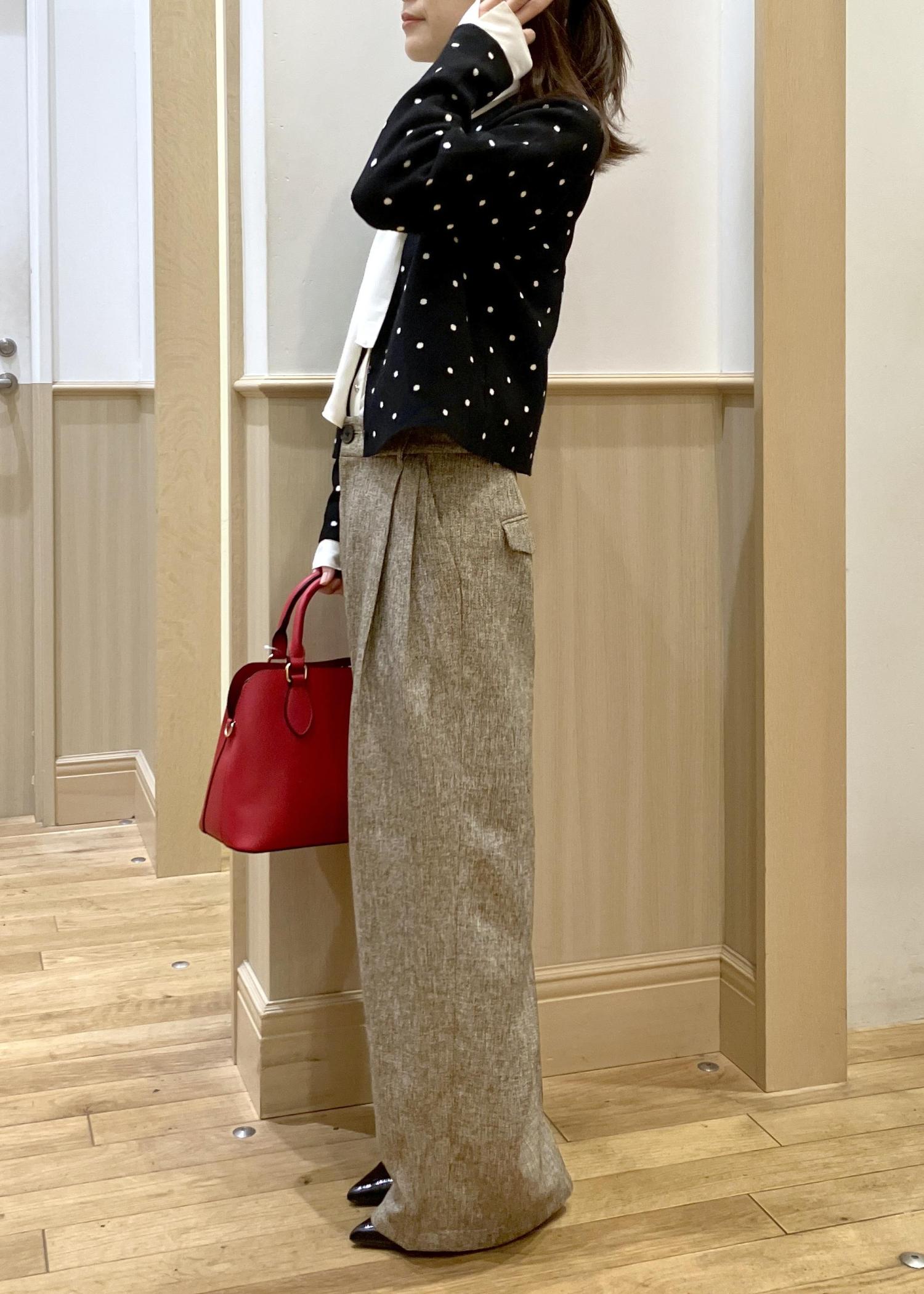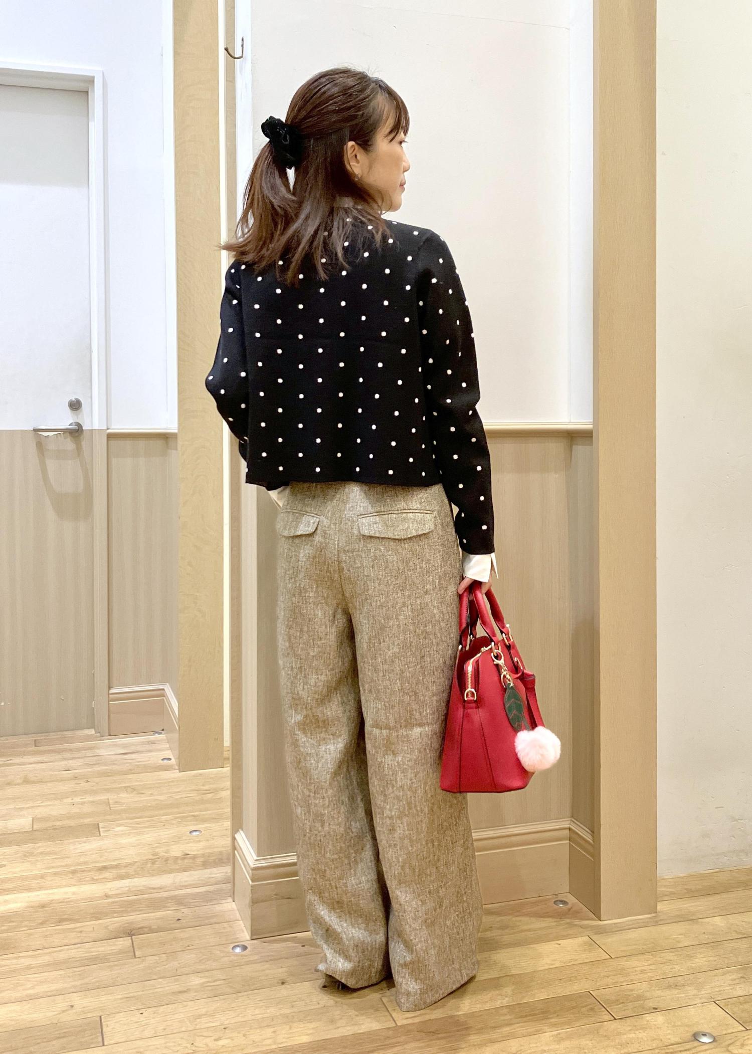白のボウタイリボン×ドット柄のカーデで少し甘めな気分のオフィスstylingをイメージしました。