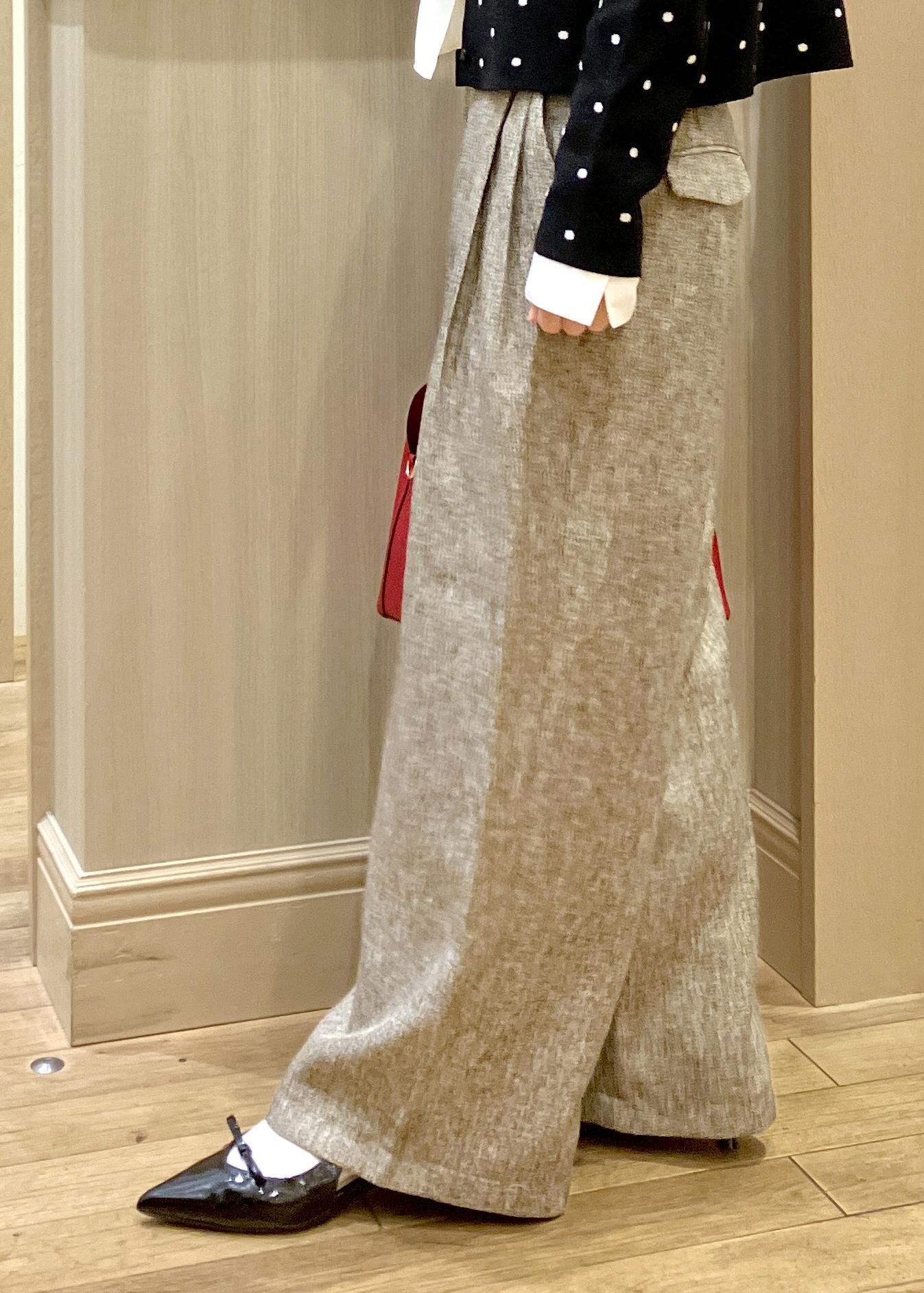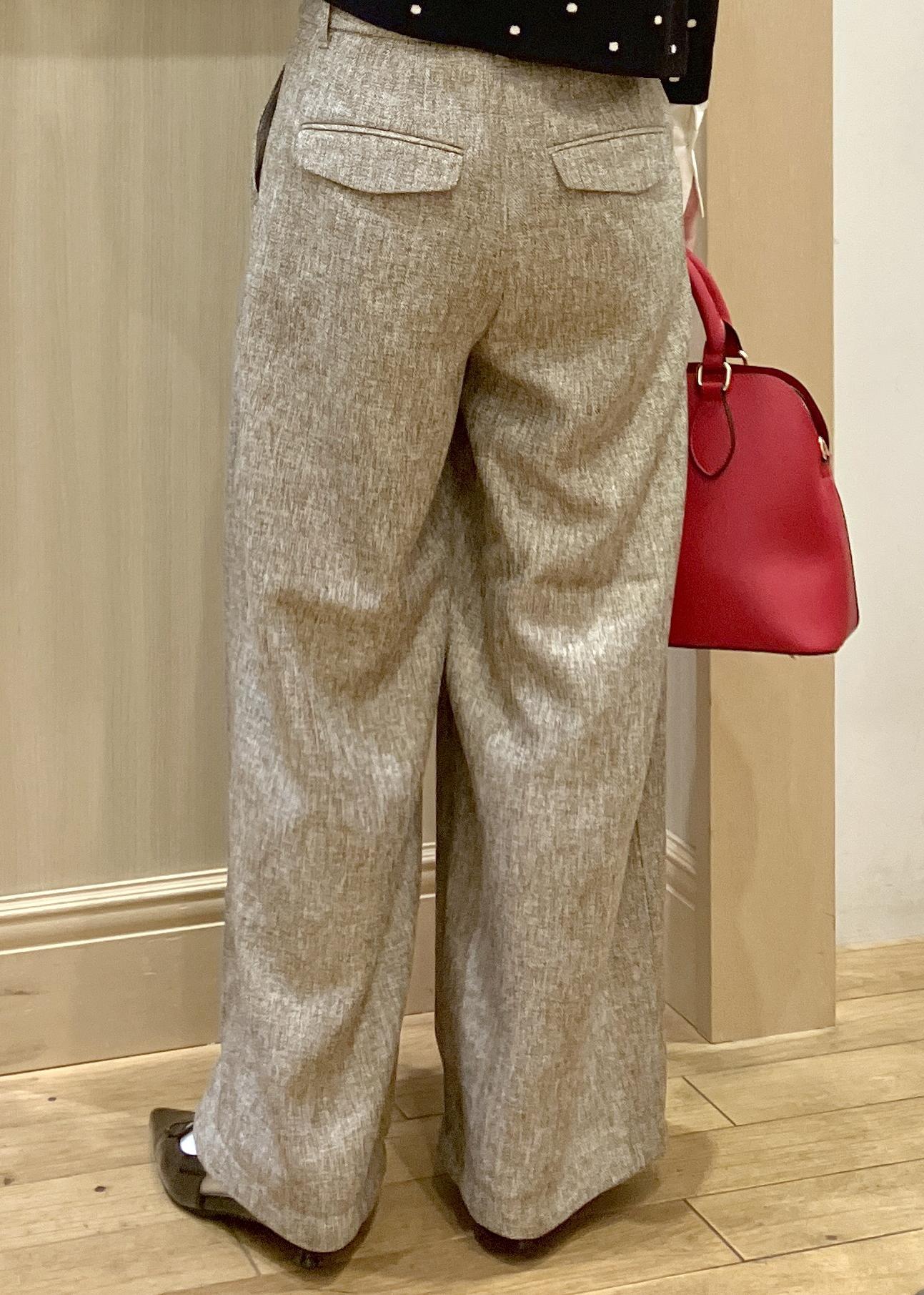 ツィード調のワイドパンツはゆるっとしたデザインなのでトップスの甘めな雰囲気にハンサム、カジュアル感もプラスされて◎大人女子にもオススメです。