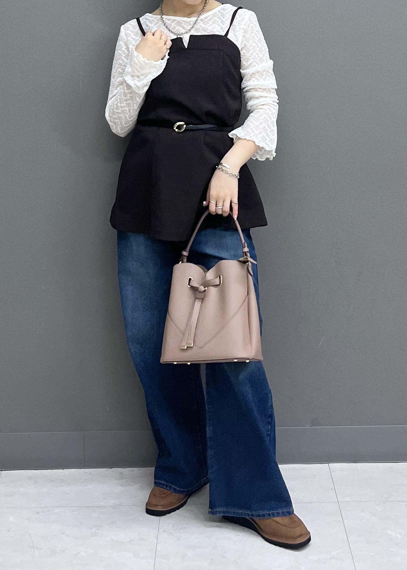 紐部分がアシンメトリーなデザインになるので、デコルテ周りがあいているトップスを着ても可愛いなと思いました☺︎ -