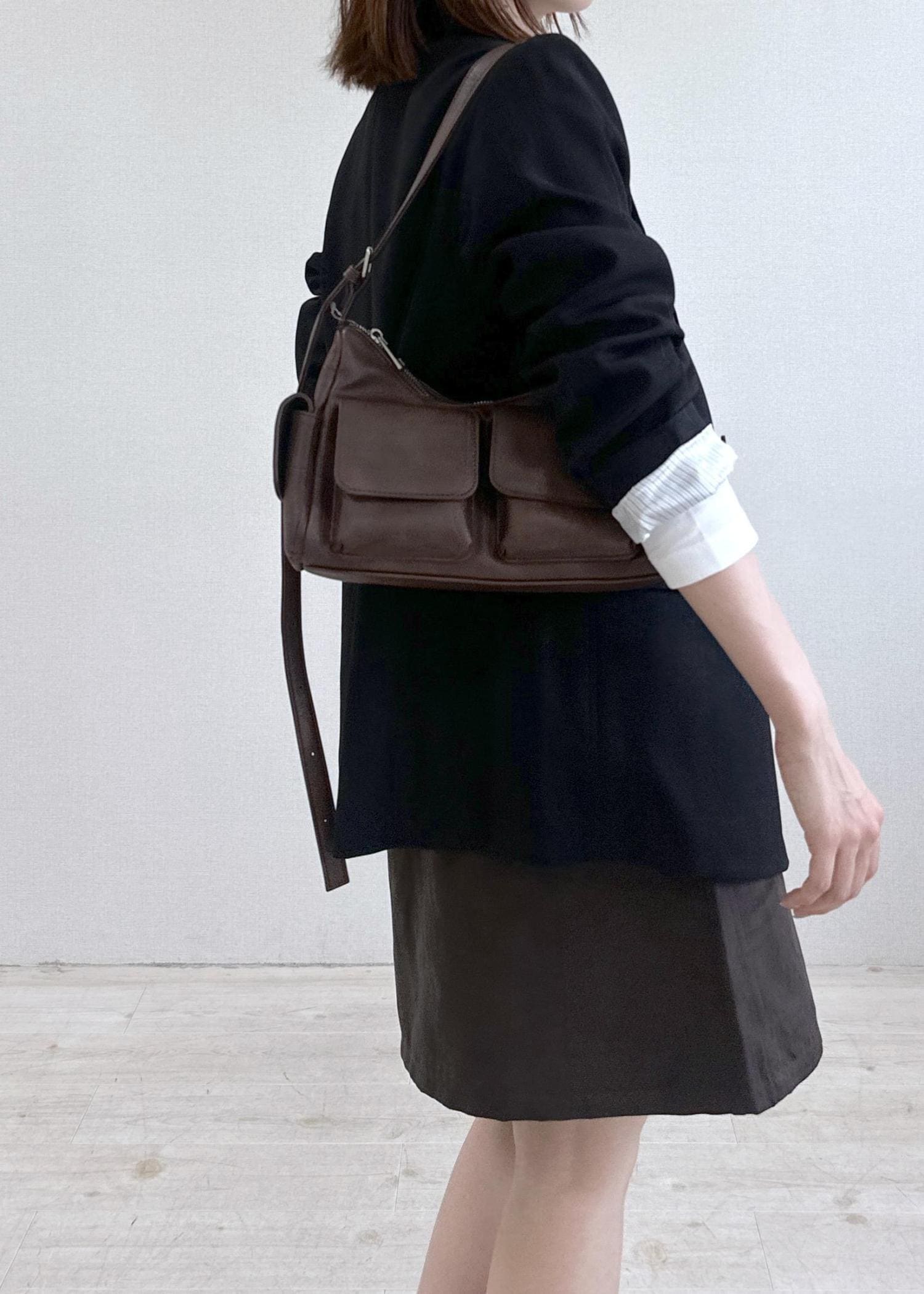 トレンド感のあるマルチポケットのショルダーバッグ。